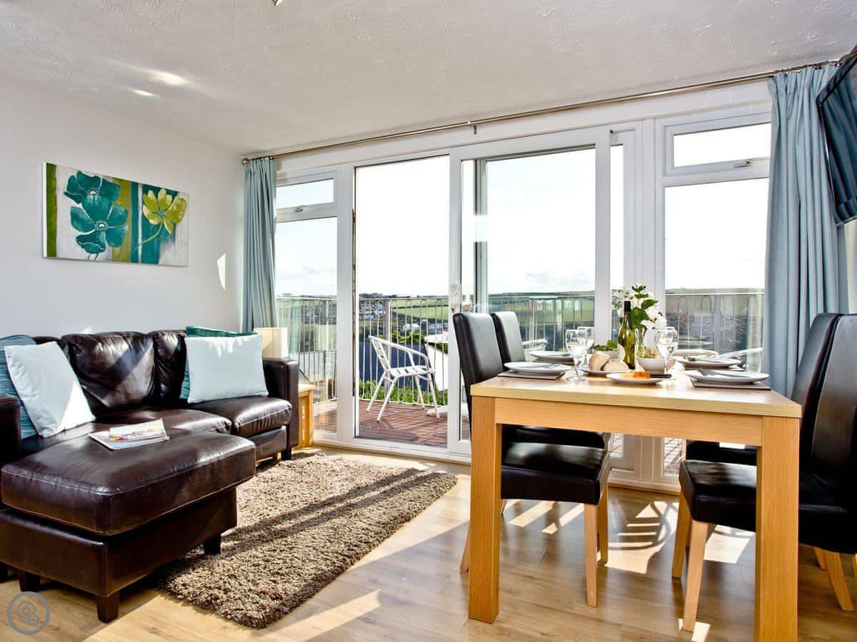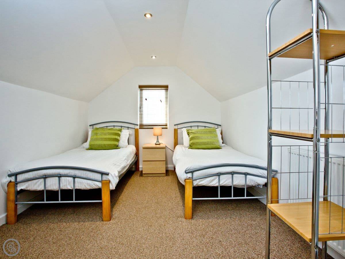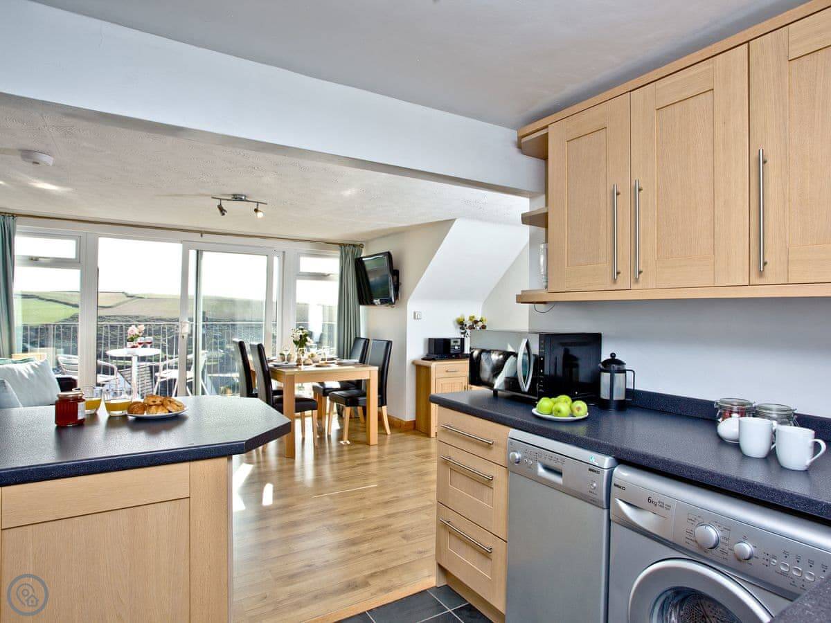 This is Ocean View in Mawgan Porth. It’s a big place for a group, sleeps twelve with six bedrooms. It’s actually two places joined together, a four-bedroom house on the ground floor and a separate two-bed flat upstairs. They’re connected inside but each has its own kitchen and living space, so it works well for a few families together.