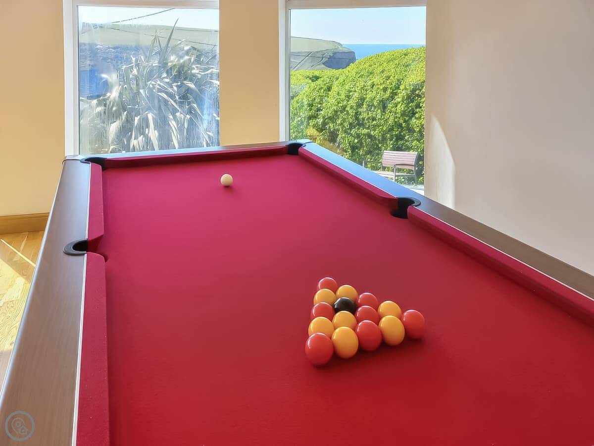 Inside the main house, it’s open plan. There’s a proper kitchen with a dishwasher, a big table, and a lounge area that opens onto the deck. There’s also a separate room with a pool table and a big TV. Three bathrooms in total for the whole property. There’s a washing machine and a utility room too.