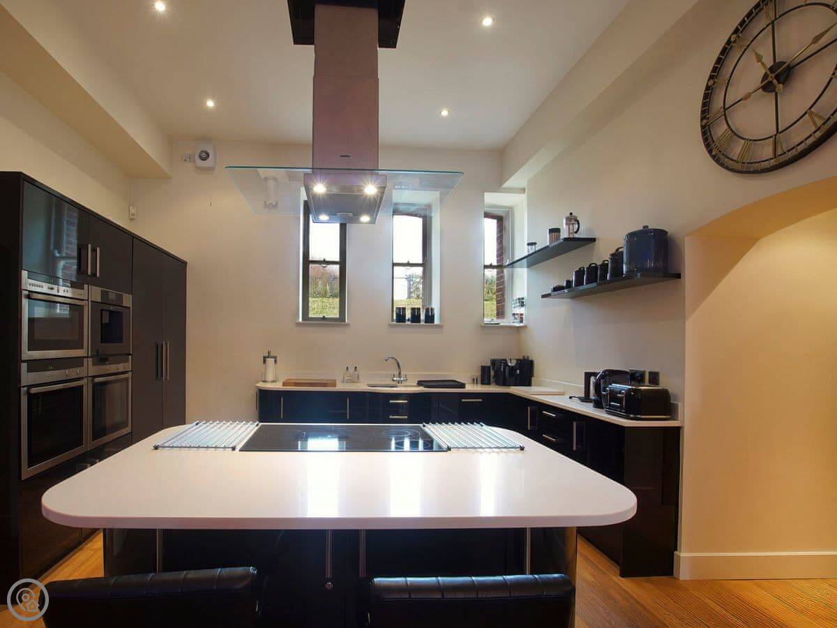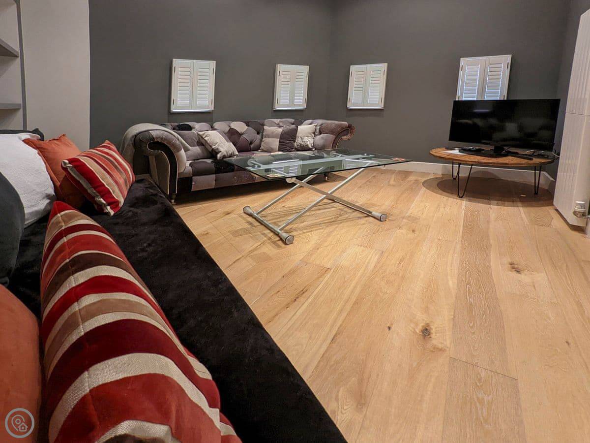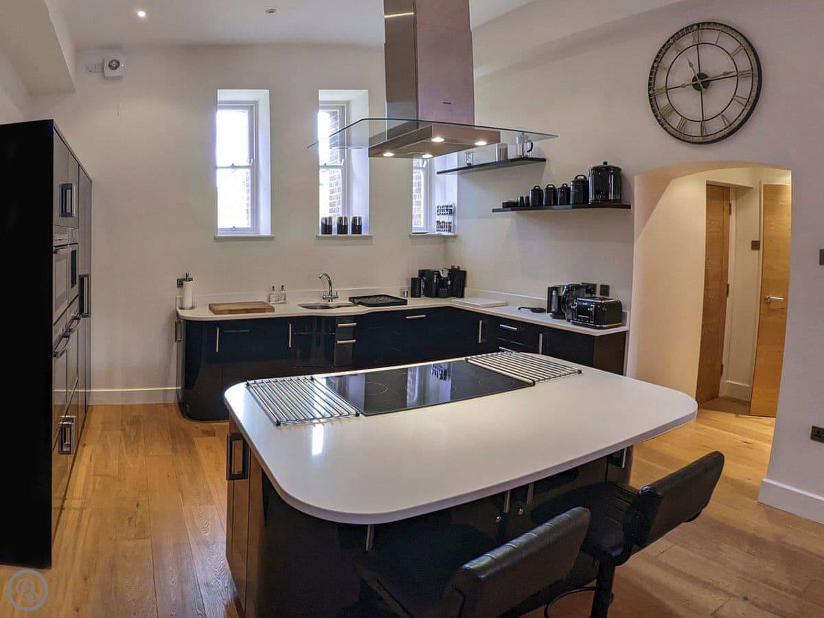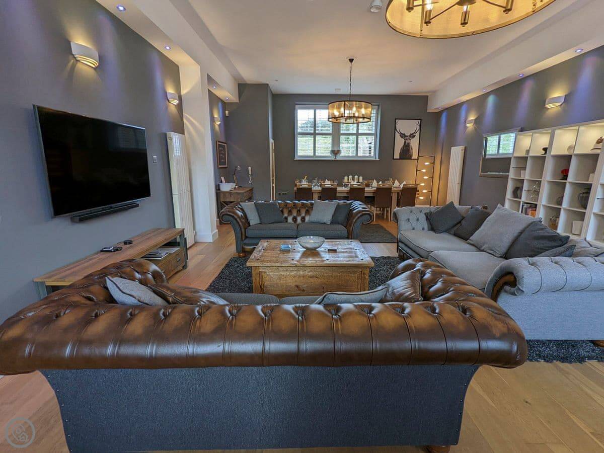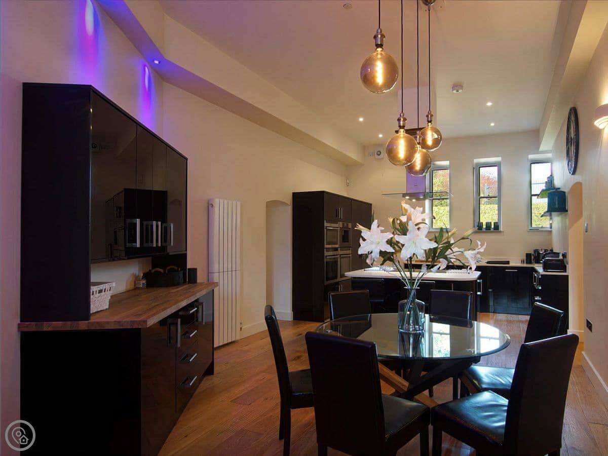 Internally, the property offers brick-barrel vaulted ceilings, with coloured LED mood lighting and solid oak floors. On the ground floor, there is an enormous, comfortable dual-aspect living area, with bespoke leather and wool three and four-seater settees, sumptuous rugs and a 65" surround-sound television. There is also an extensive dining table with brown leather chairs, which seats 10-12 people and a desk which is ideal for those who need to work whilst away from home. This room links through an arched walkway, to the impressive, bespoke kitchen/breakfast room. The kitchen is fitted with white marble worktops and black, high-gloss units plus integrated Neff appliances including a coffee machine, microwave and two ovens, together with a large integrated freezer, fridge and dishwasher. Through another arched walkway, there is also a snug, which makes a fabulous TV room.