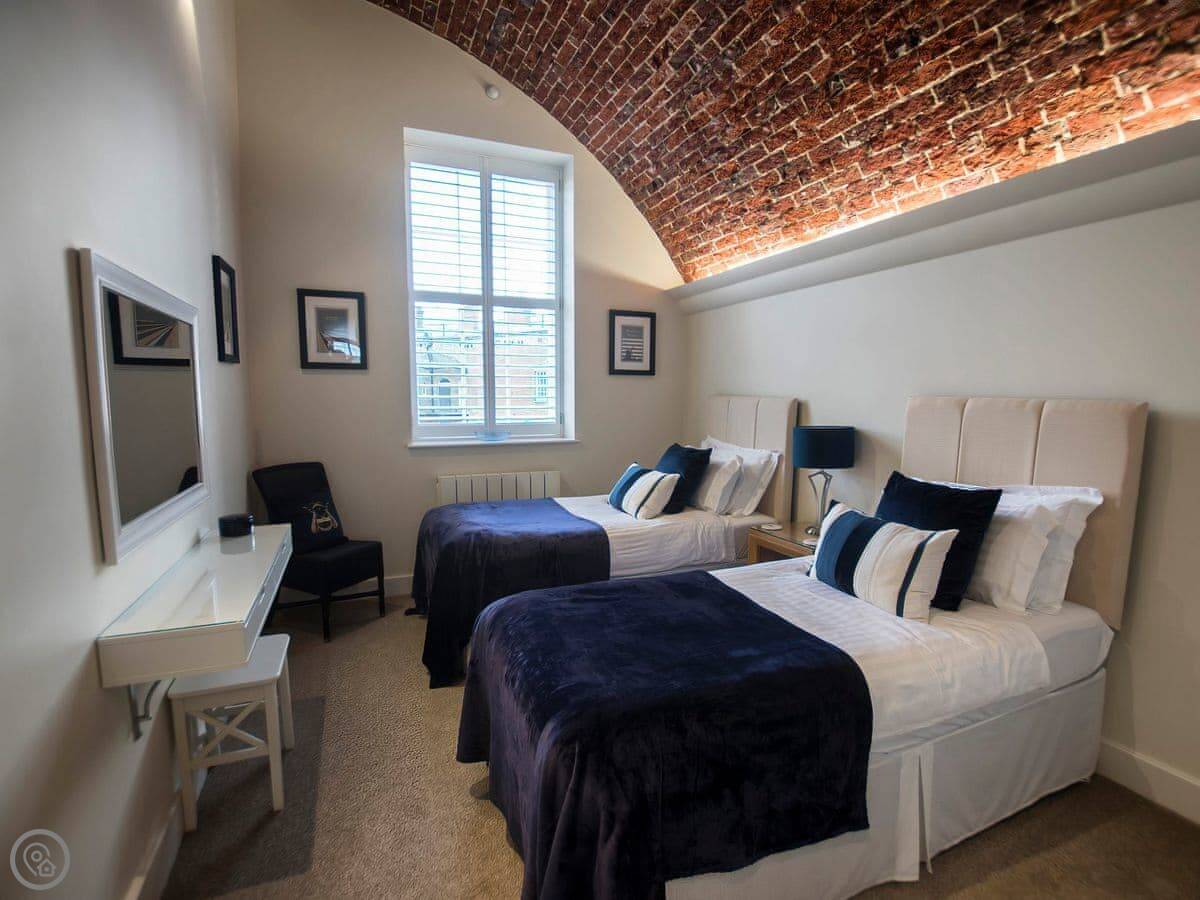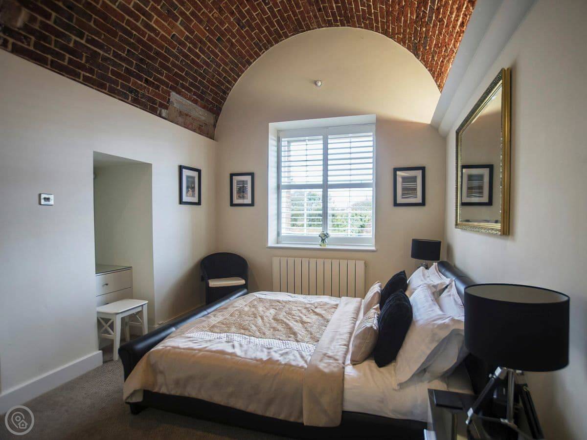 On the first floor, there are five bedrooms, all with stunning, brick-vaulted ceilings. The extensive Master Bedroom Suite includes an impressive, super-king-size four-poster bed and glimpses across the Solent to the mainland. Leading off from this are a large dressing room, a gigantic en-suite bathroom with his and her basins and an observation gallery overlooking the courtyard with central hexagonal fountain. There are two other large bedrooms with en-suite bathrooms and two which share a well-fitted family bathroom. All bedrooms have hairdryers.