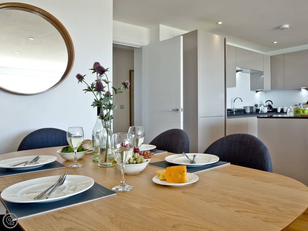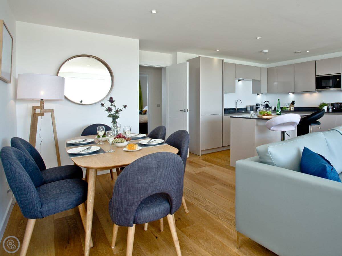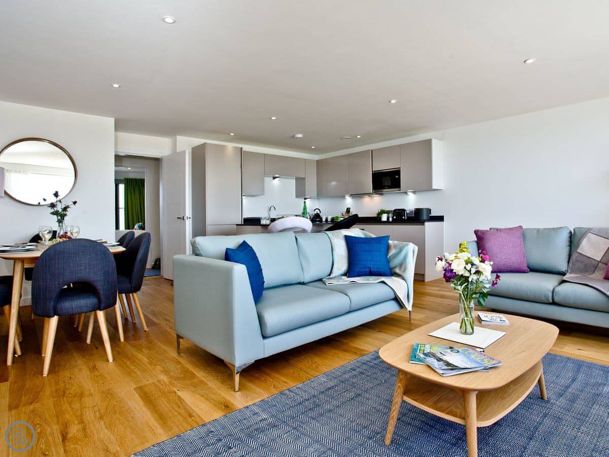 The living room is open plan with the kitchen and dining area. It's comfortable, not huge. The sofas face the TV and the doors to the main balcony. The kitchen has a breakfast bar and a dishwasher.