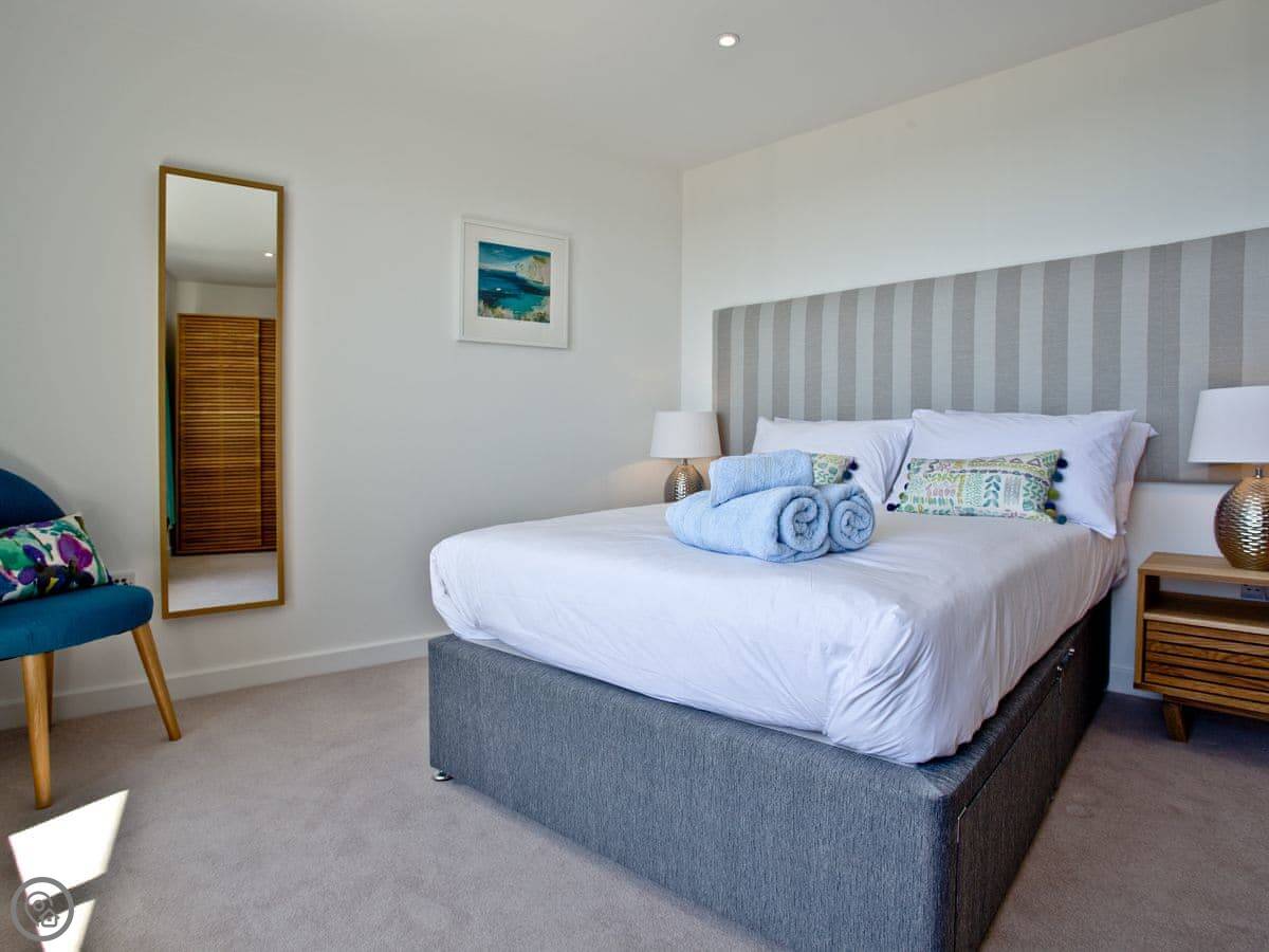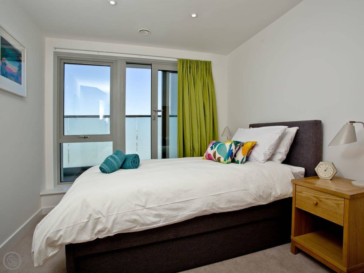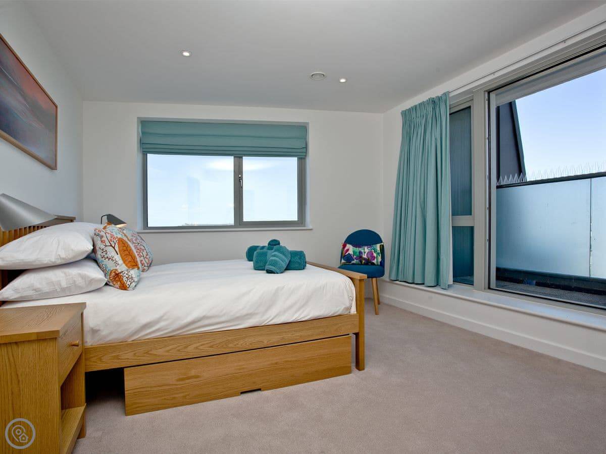It sleeps six, in three bedrooms. The main bedroom has an en-suite shower room and a super king bed, and its own small balcony. The second bedroom has a double bed, and the third has a single bed with a pull-out trundle. There's a second bathroom with a bath as well.