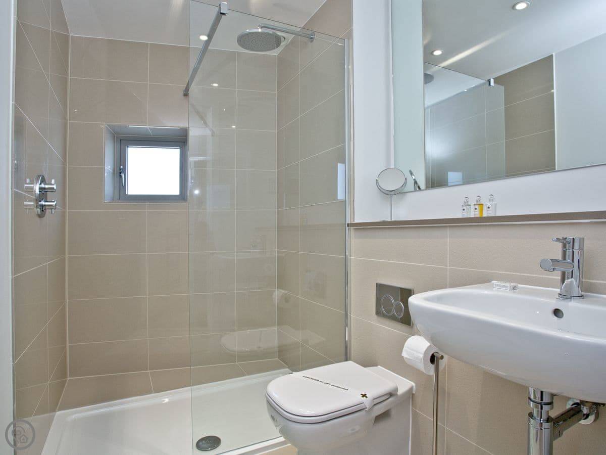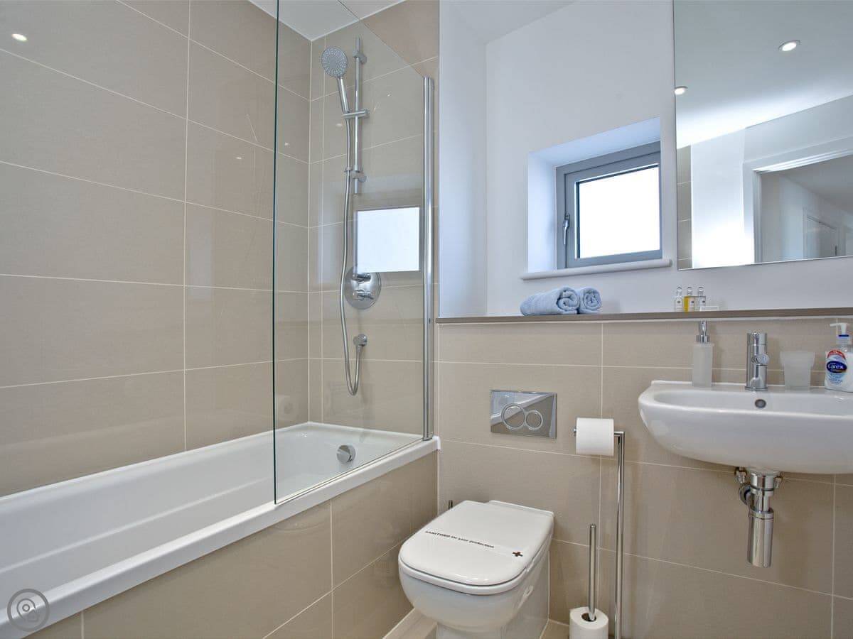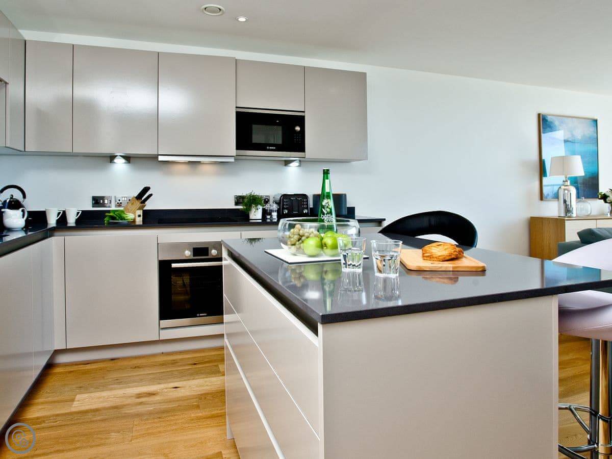 It sleeps six, in three bedrooms. The main bedroom has an en-suite shower room and a super king bed, and its own small balcony. The second bedroom has a double bed, and the third has a single bed with a pull-out trundle. There's a second bathroom with a bath as well.