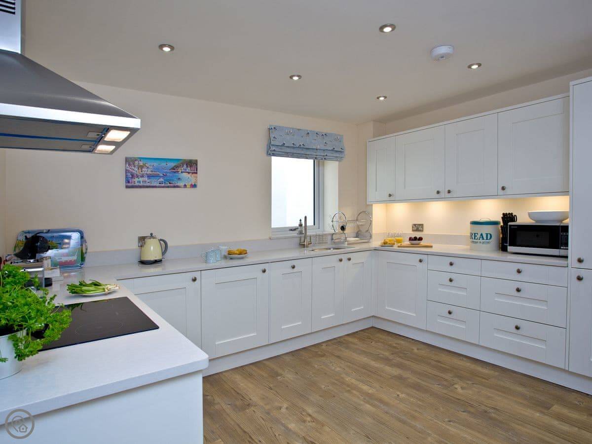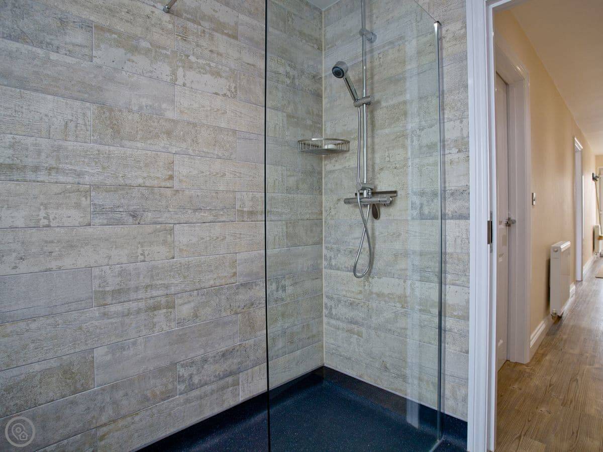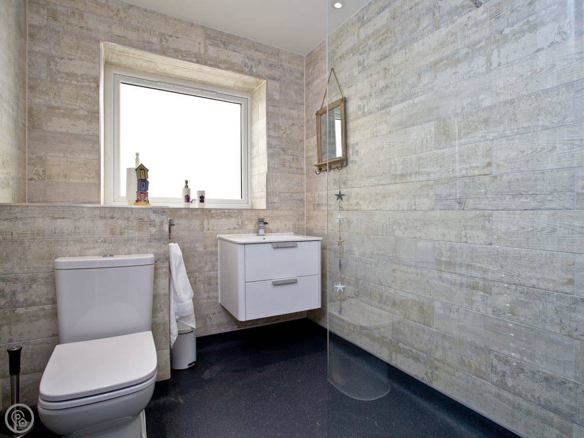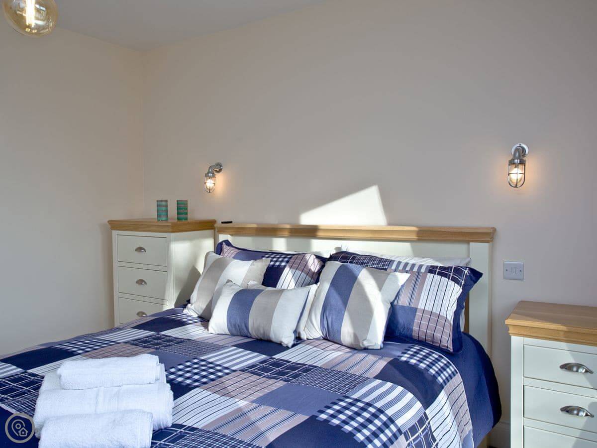 The main thing is the view. It looks straight out to sea from the living room and the bedroom. The bedroom has patio doors you can open. The bathroom has a big walk-in shower, which is good. It's got a 5 Star rating, which means it's well-equipped and finished to a high standard.