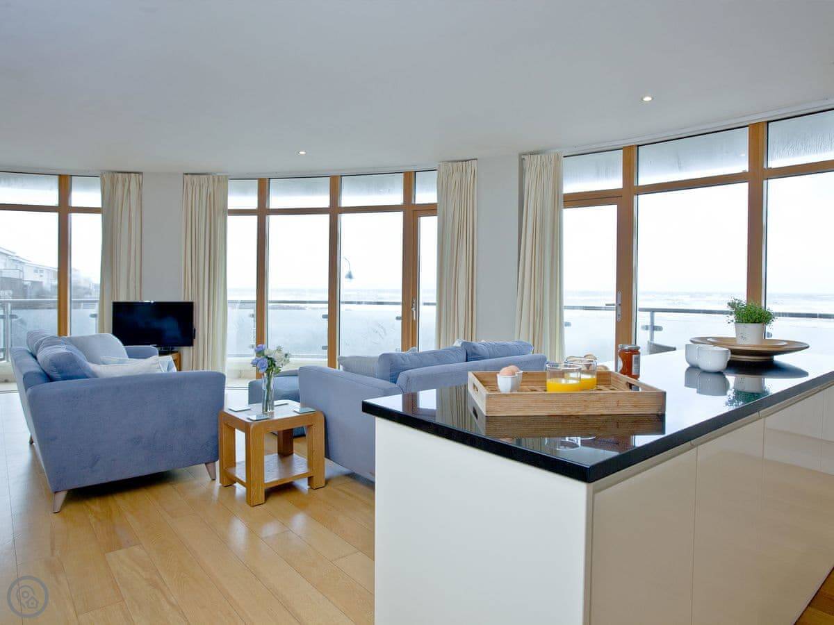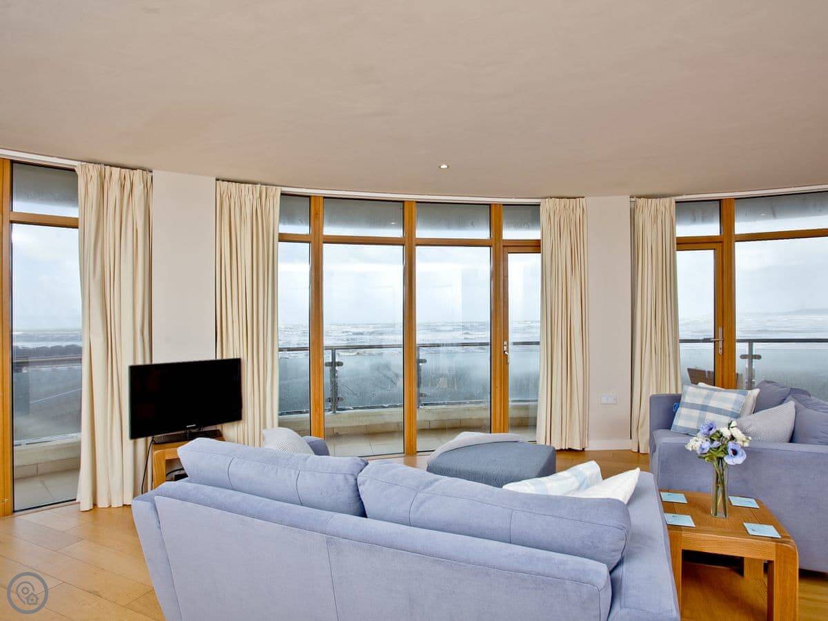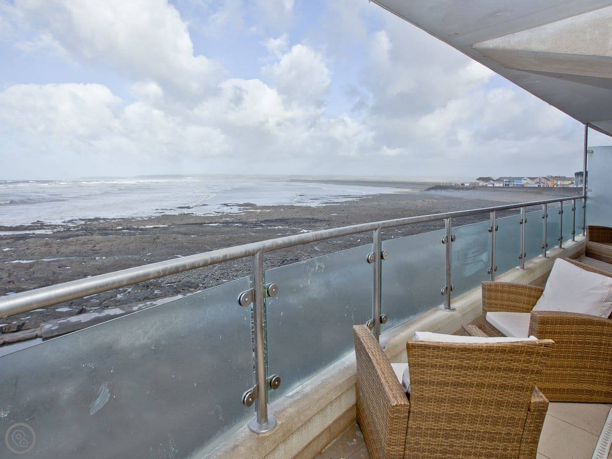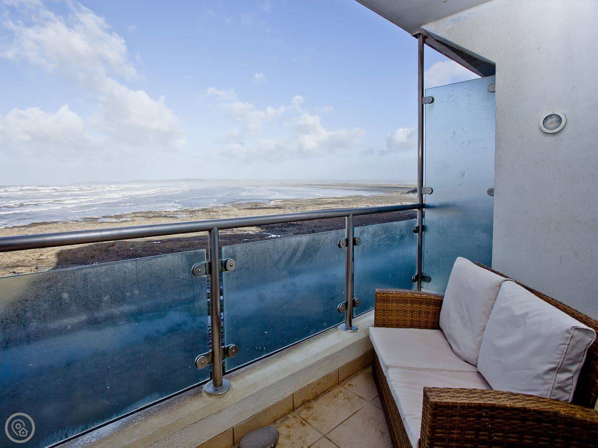The main thing about it is the view, obviously. The living room has big windows looking straight out over the beach and the sea. There's a balcony that runs the whole width of the flat, so you can sit outside with it.