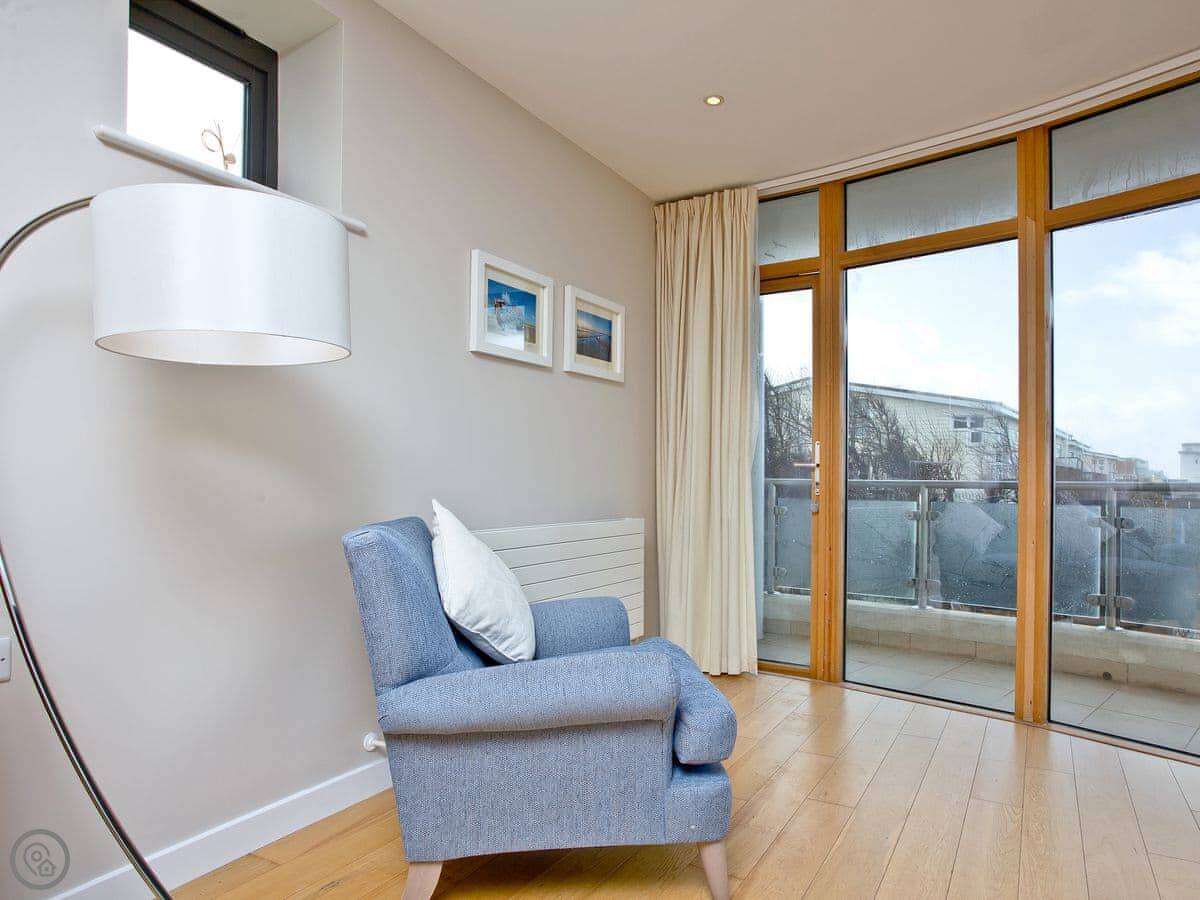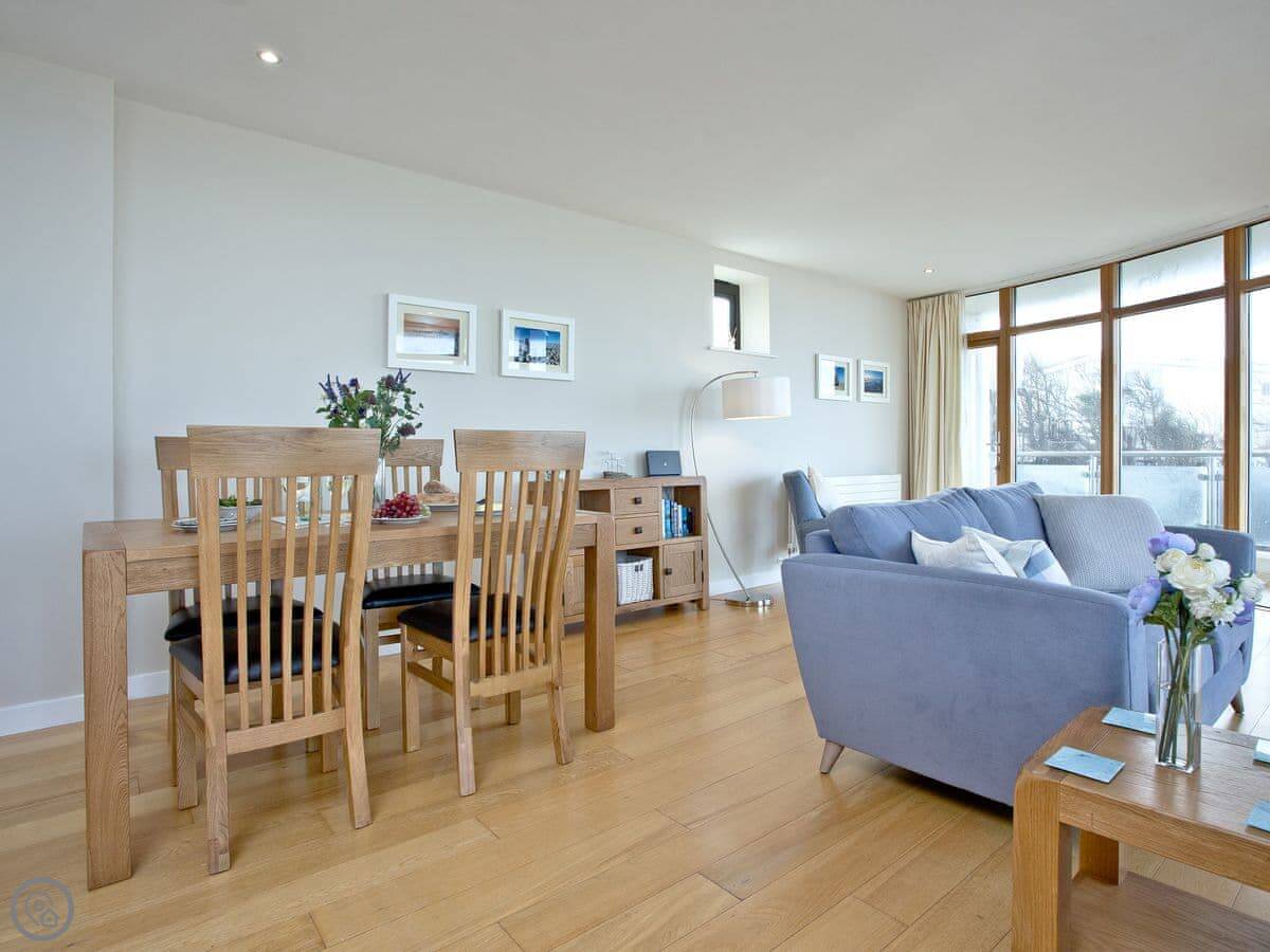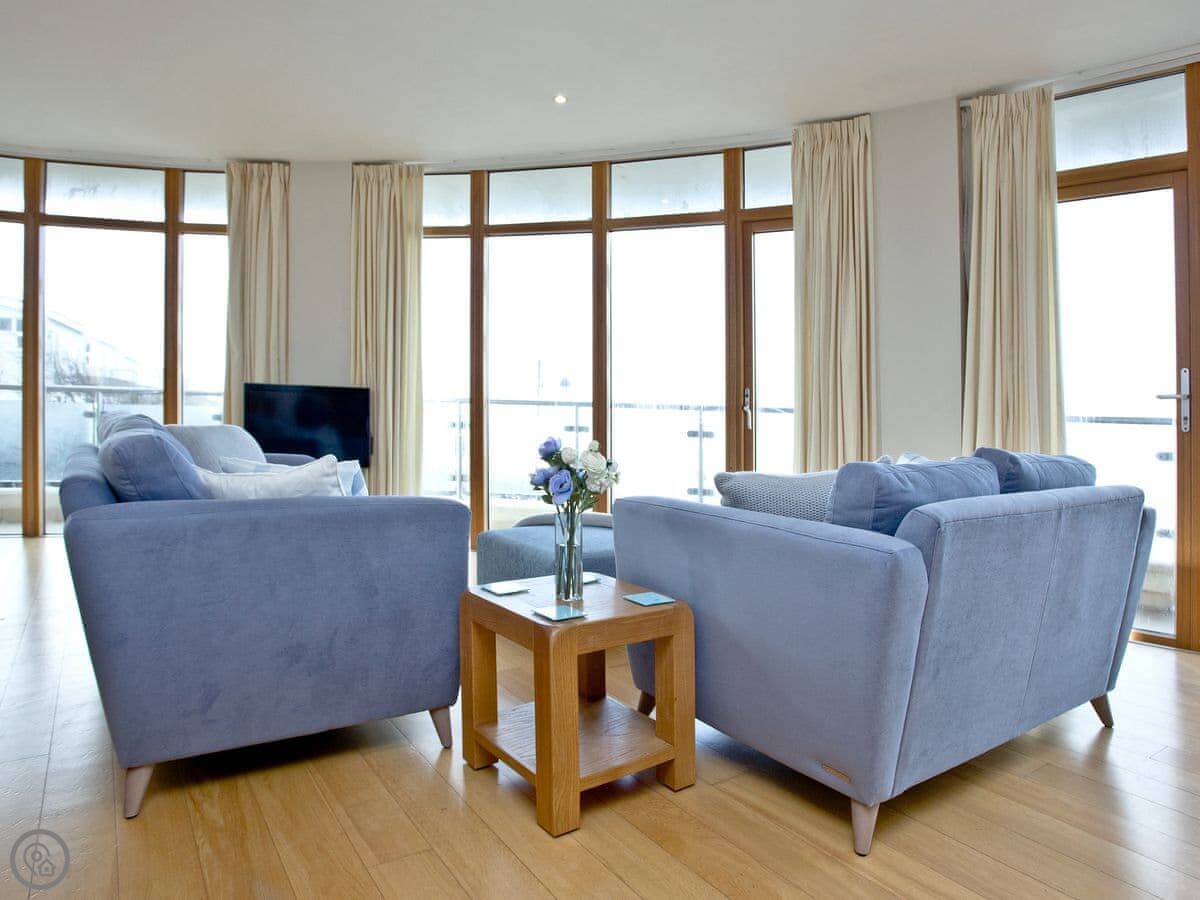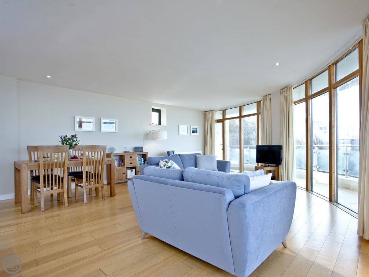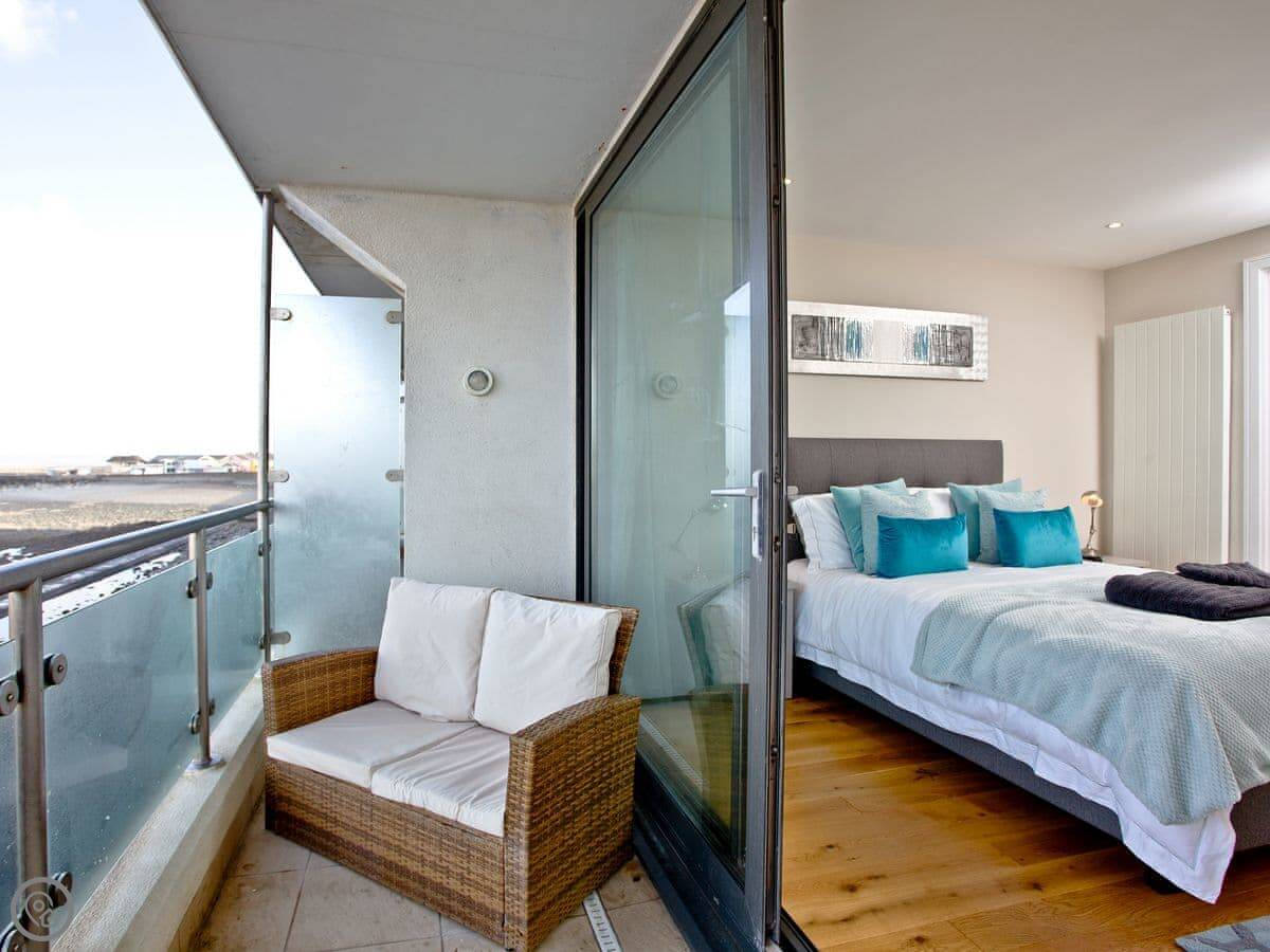 The main thing about it is the view, obviously. The living room has big windows looking straight out over the beach and the sea. There's a balcony that runs the whole width of the flat, so you can sit outside with it.
