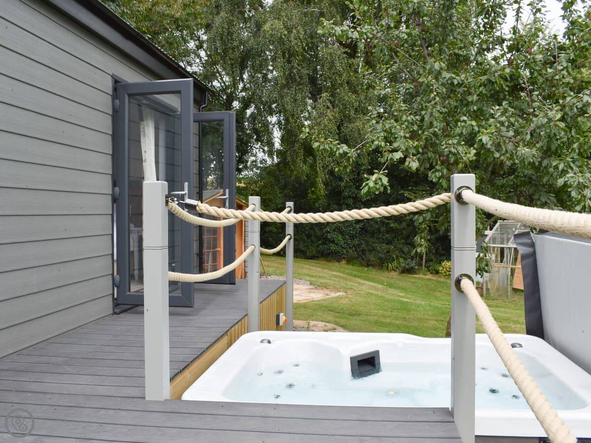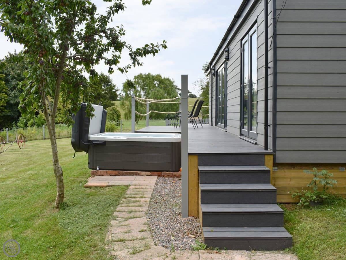 It's detached, so you're on your own out there. You get your own deck with a hot tub and a little table and chairs. The view is over the fields and one of the ponds. It's very quiet.