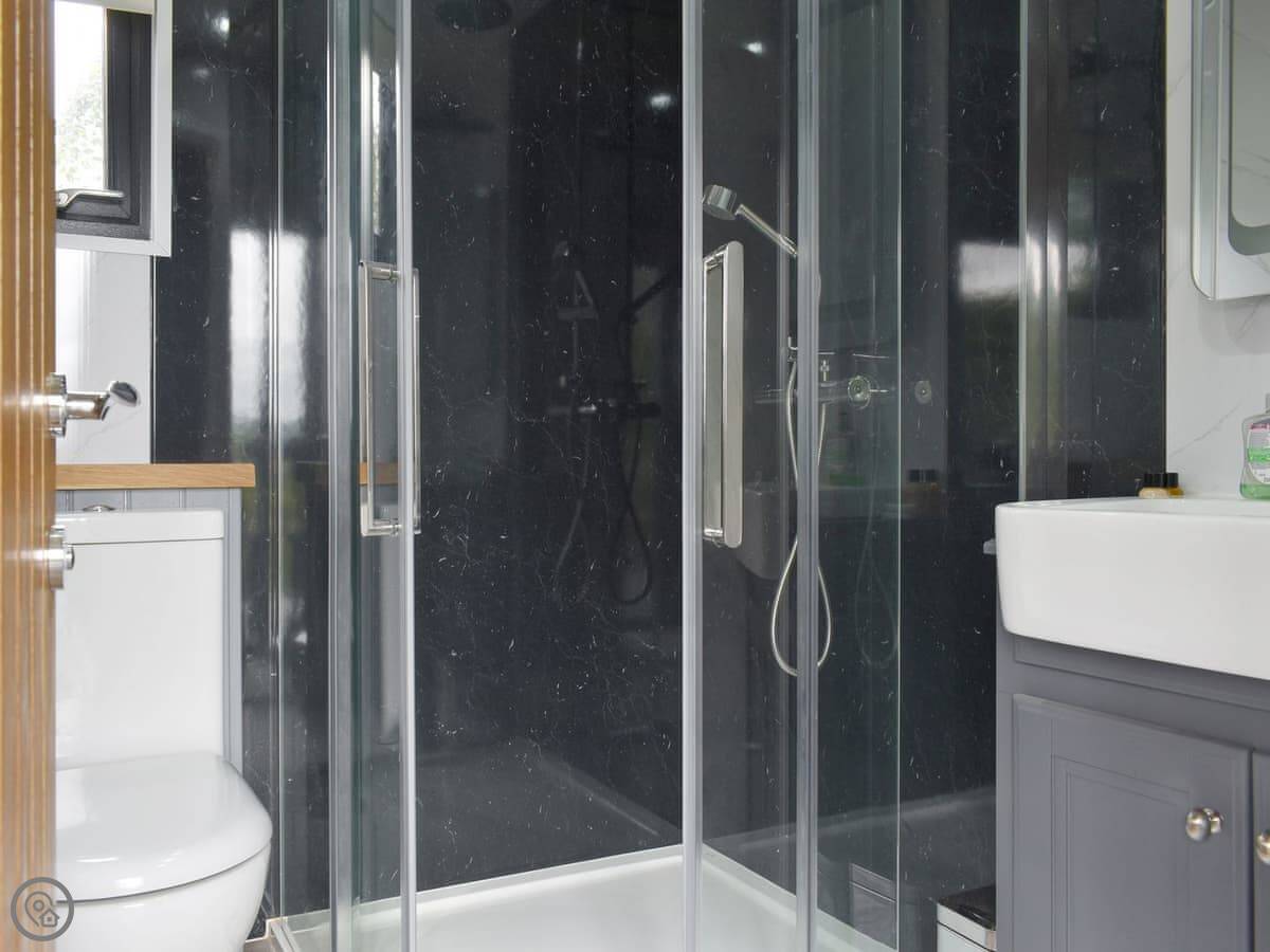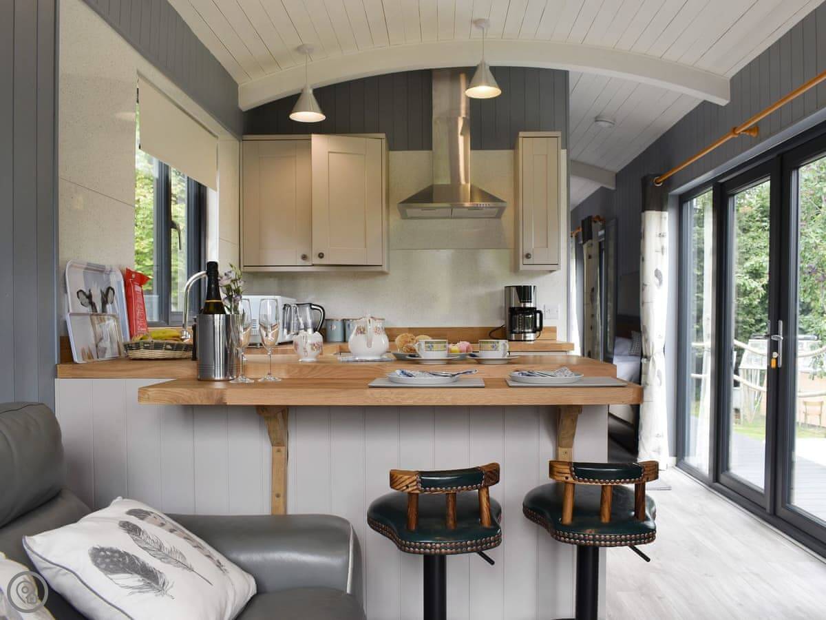 Inside, it's one room with the bed at one end and the kitchen and a small sofa at the other. There's an en-suite shower room. It's got underfloor heating and an electric stove for warmth. It's a 5 Star place, so everything is clean and works properly. The WiFi is decent.