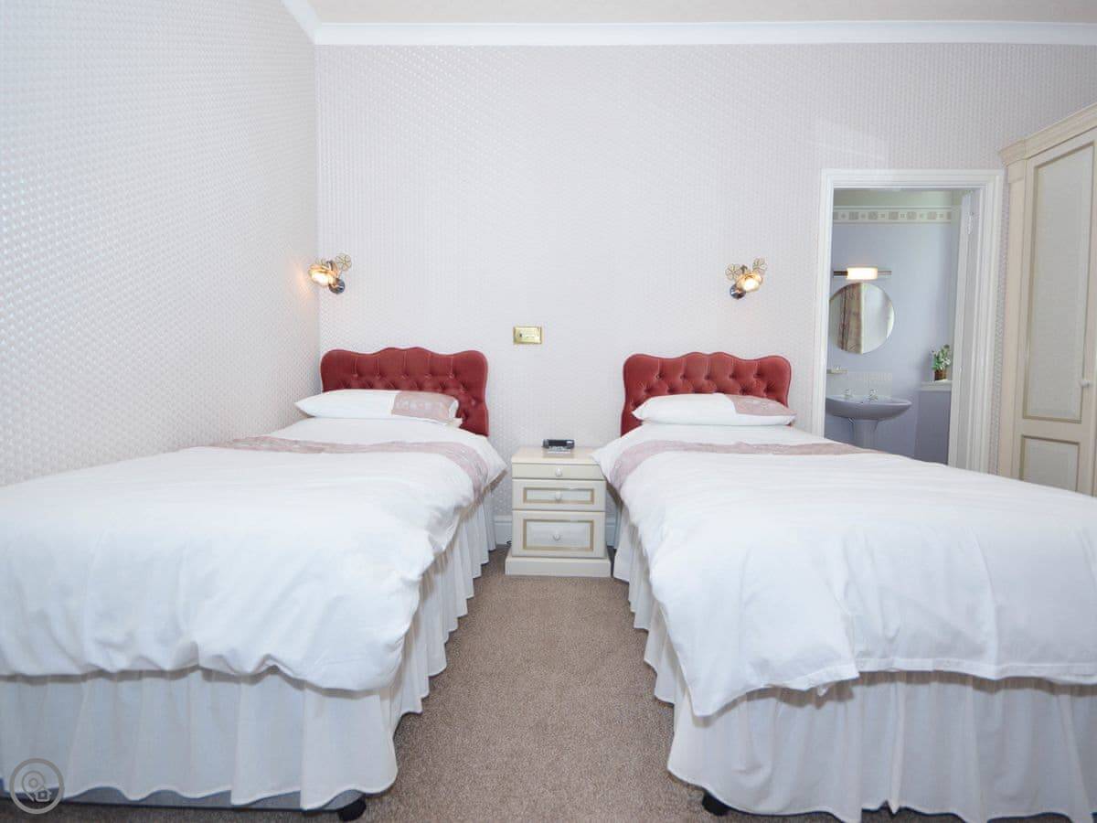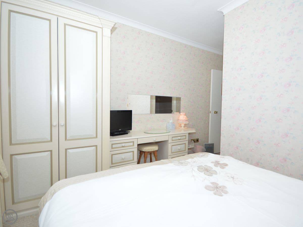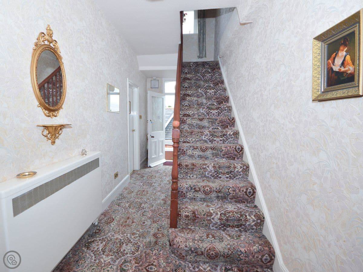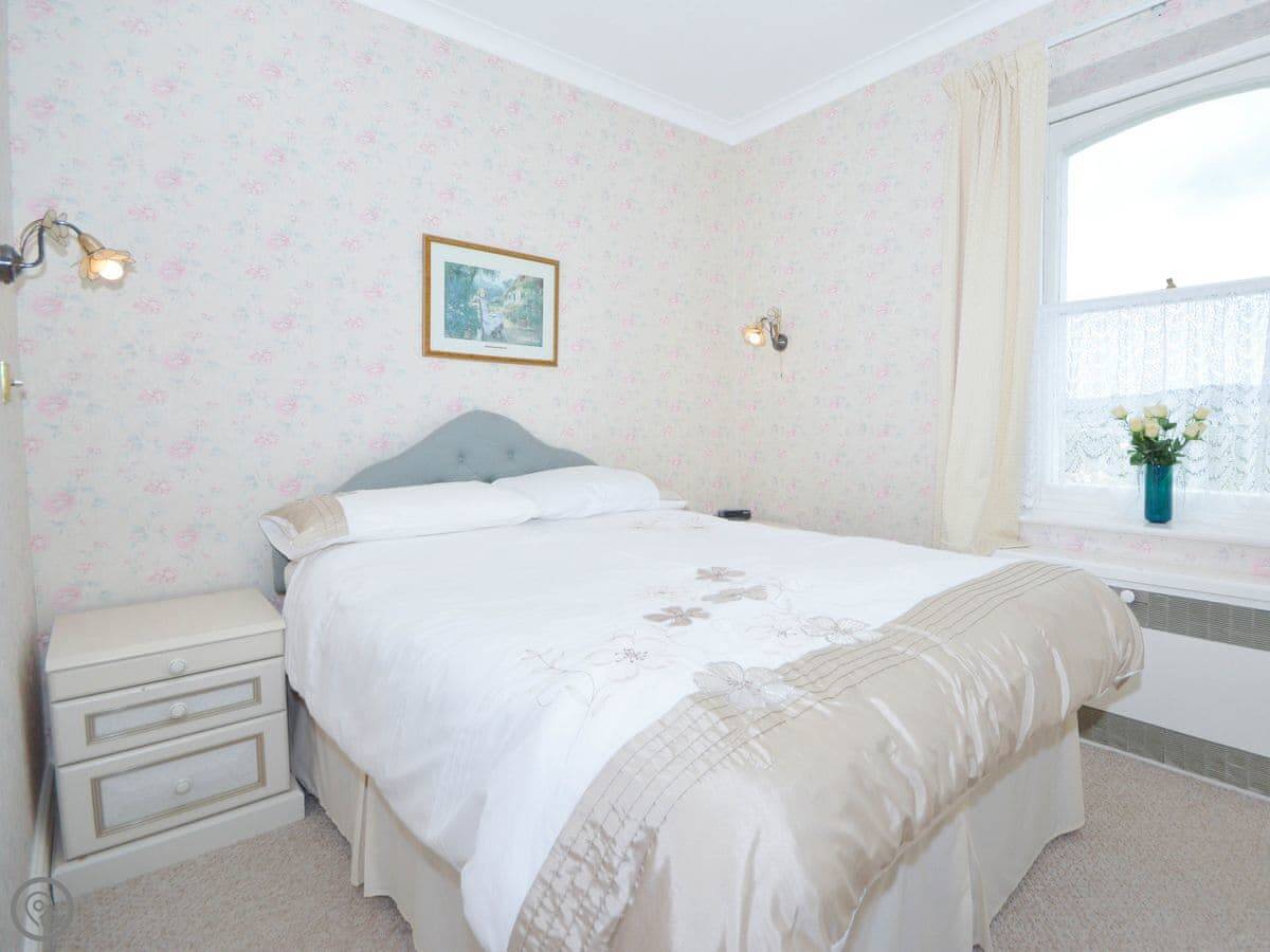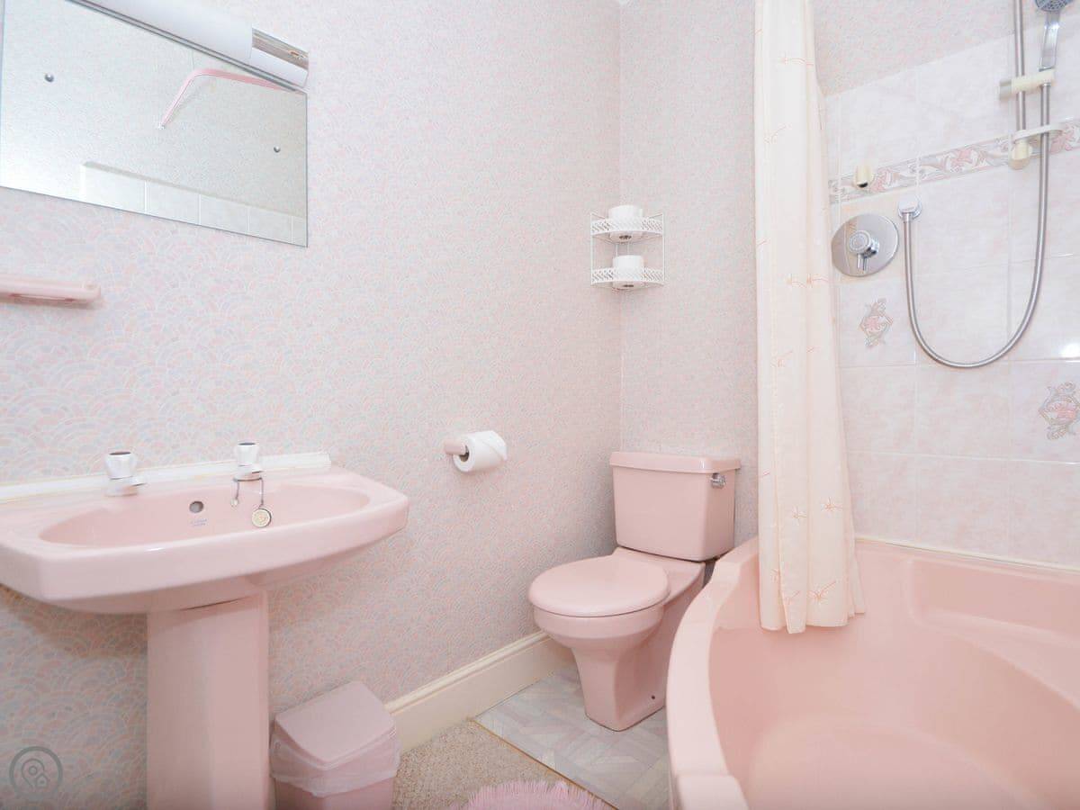 It sleeps four. Two bedrooms, two bathrooms. One bedroom is upstairs with a sea view, the other is downstairs with its own ensuite and a big corner bath. The place has a 4 Star rating, so it's comfortable and well kept.