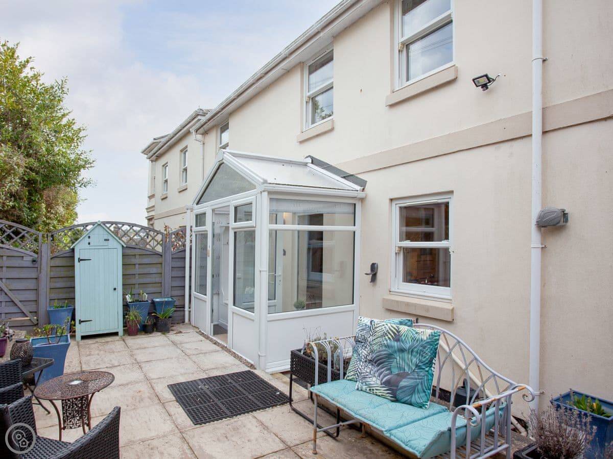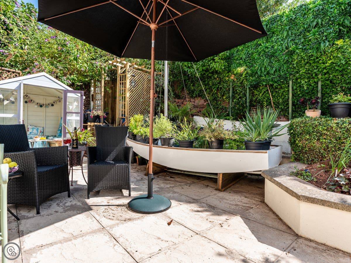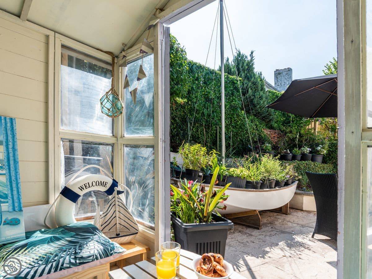 The back is an enclosed patio. It gets the sun in the late afternoon and evening. There's another patio area at the front with a summer house. It's got a bit of a nautical theme.