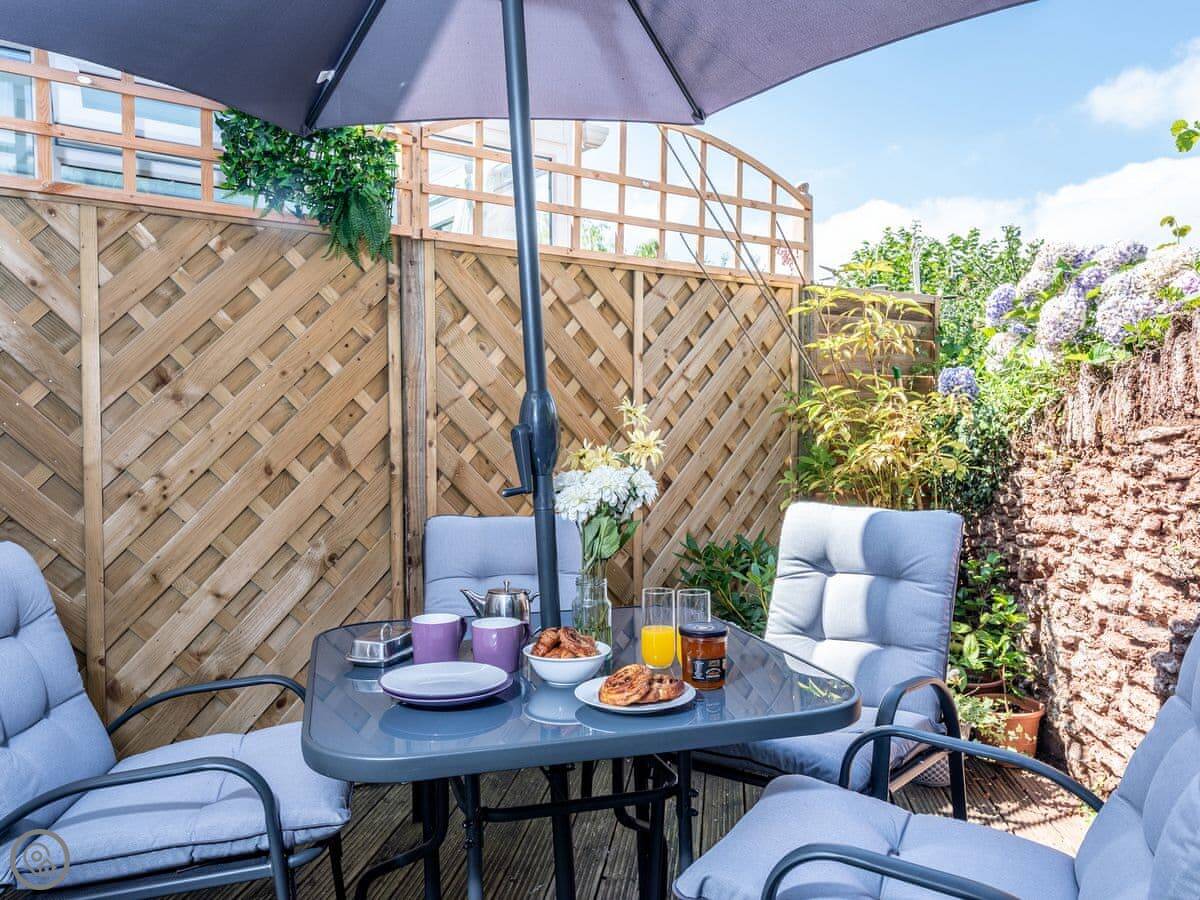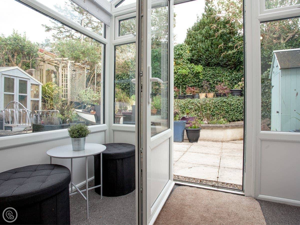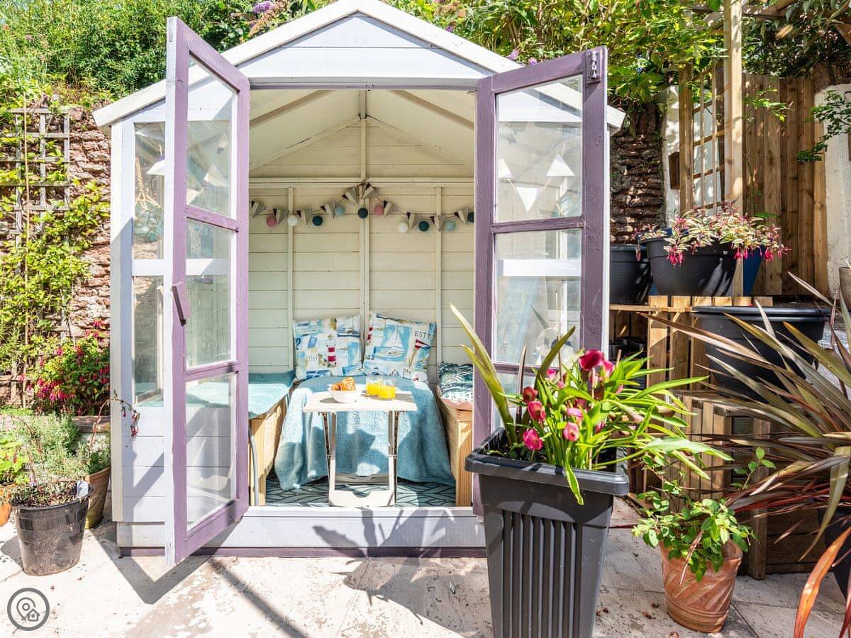The back is an enclosed patio. It gets the sun in the late afternoon and evening. There's another patio area at the front with a summer house. It's got a bit of a nautical theme.