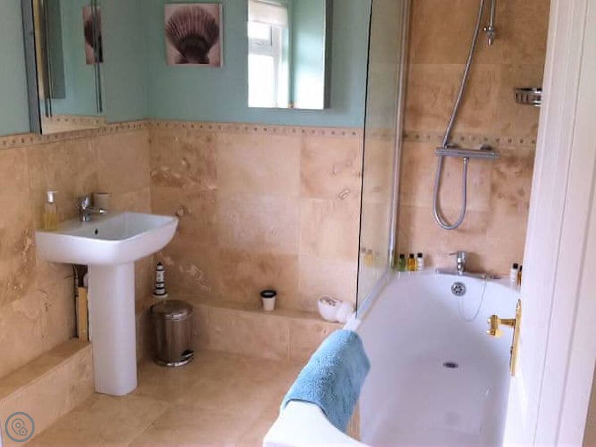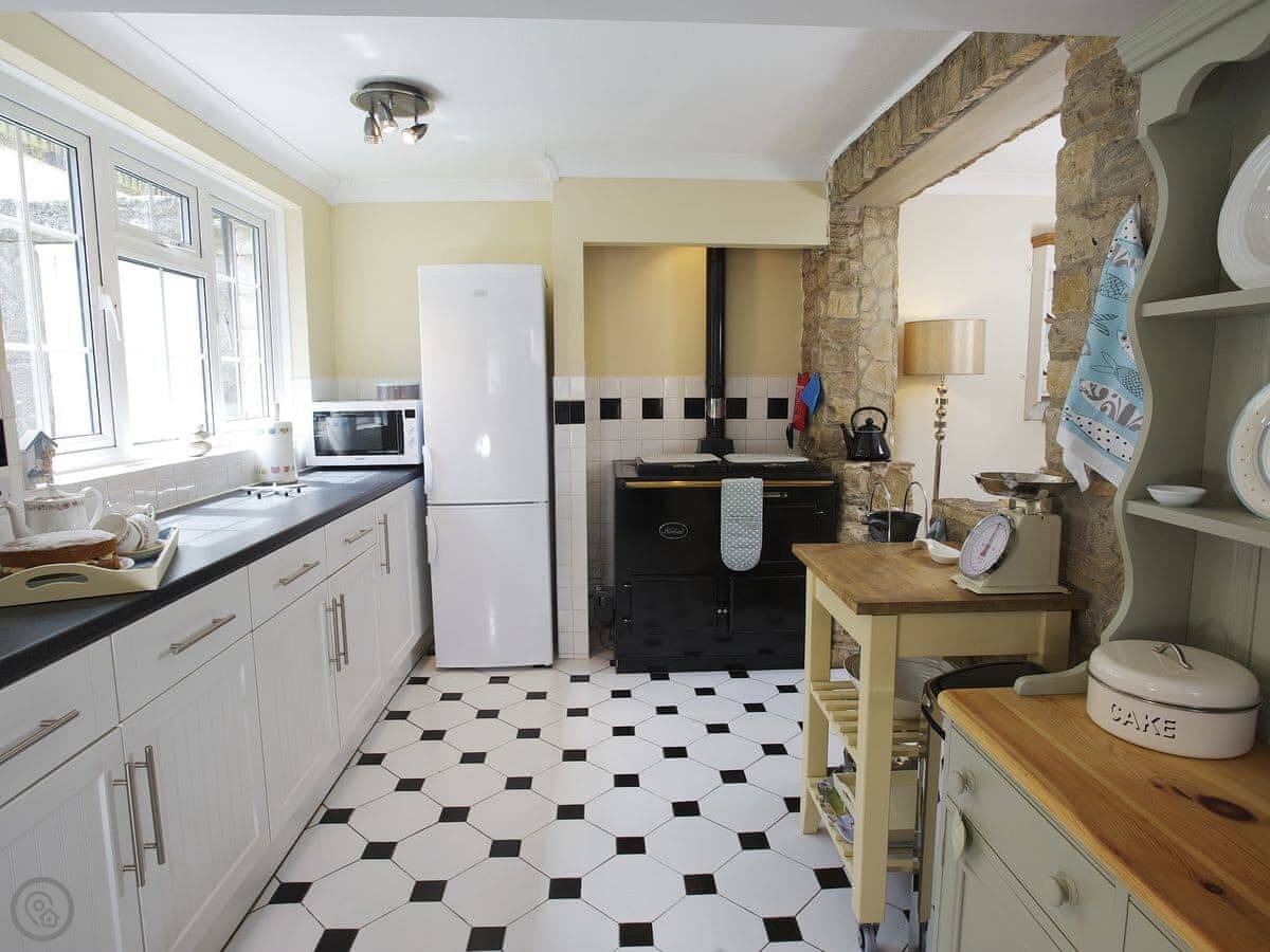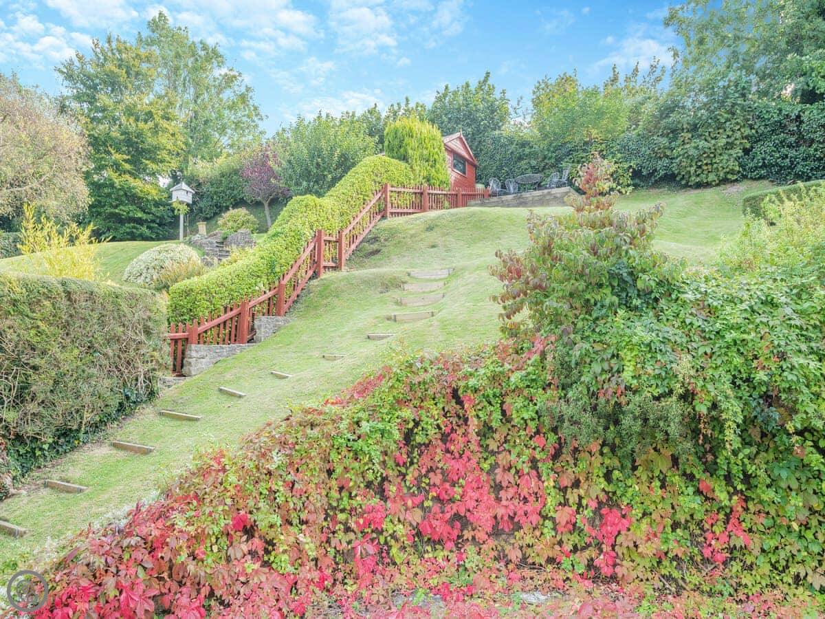 The garden is steep. It's got a good view over the fields, but it's on a slope. There's a decked bit at the top you can sit on. Inside, there's an AGA cooker in the kitchen and a wood burner in the living room. The walls are brick in some places.