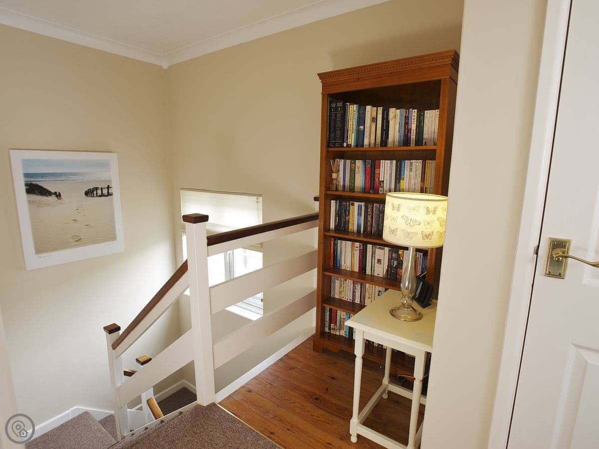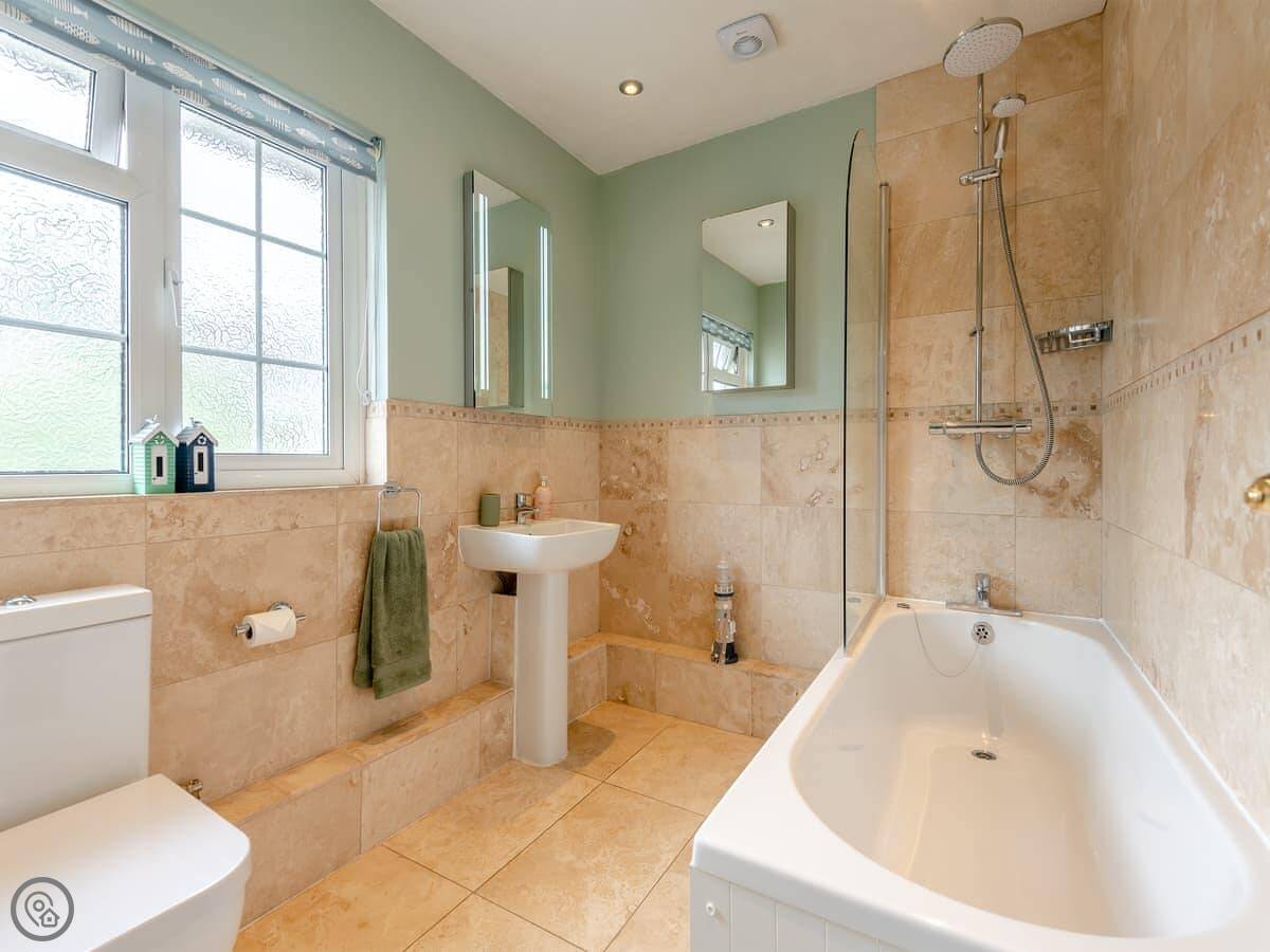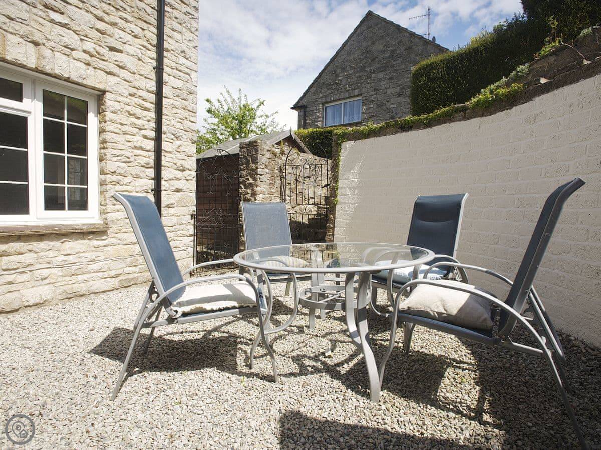 The garden is steep. It's got a good view over the fields, but it's on a slope. There's a decked bit at the top you can sit on. Inside, there's an AGA cooker in the kitchen and a wood burner in the living room. The walls are brick in some places.