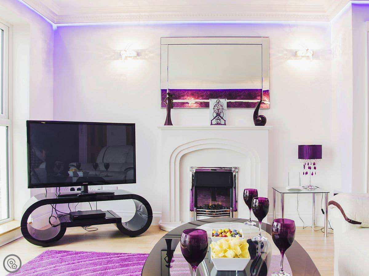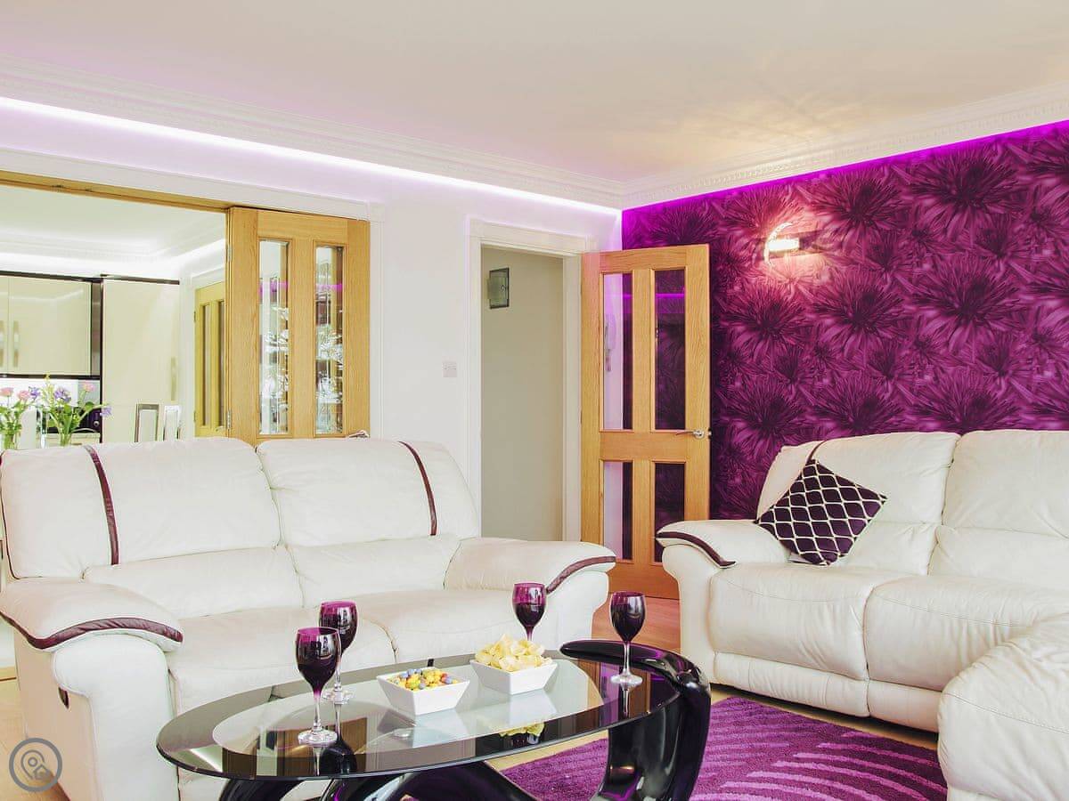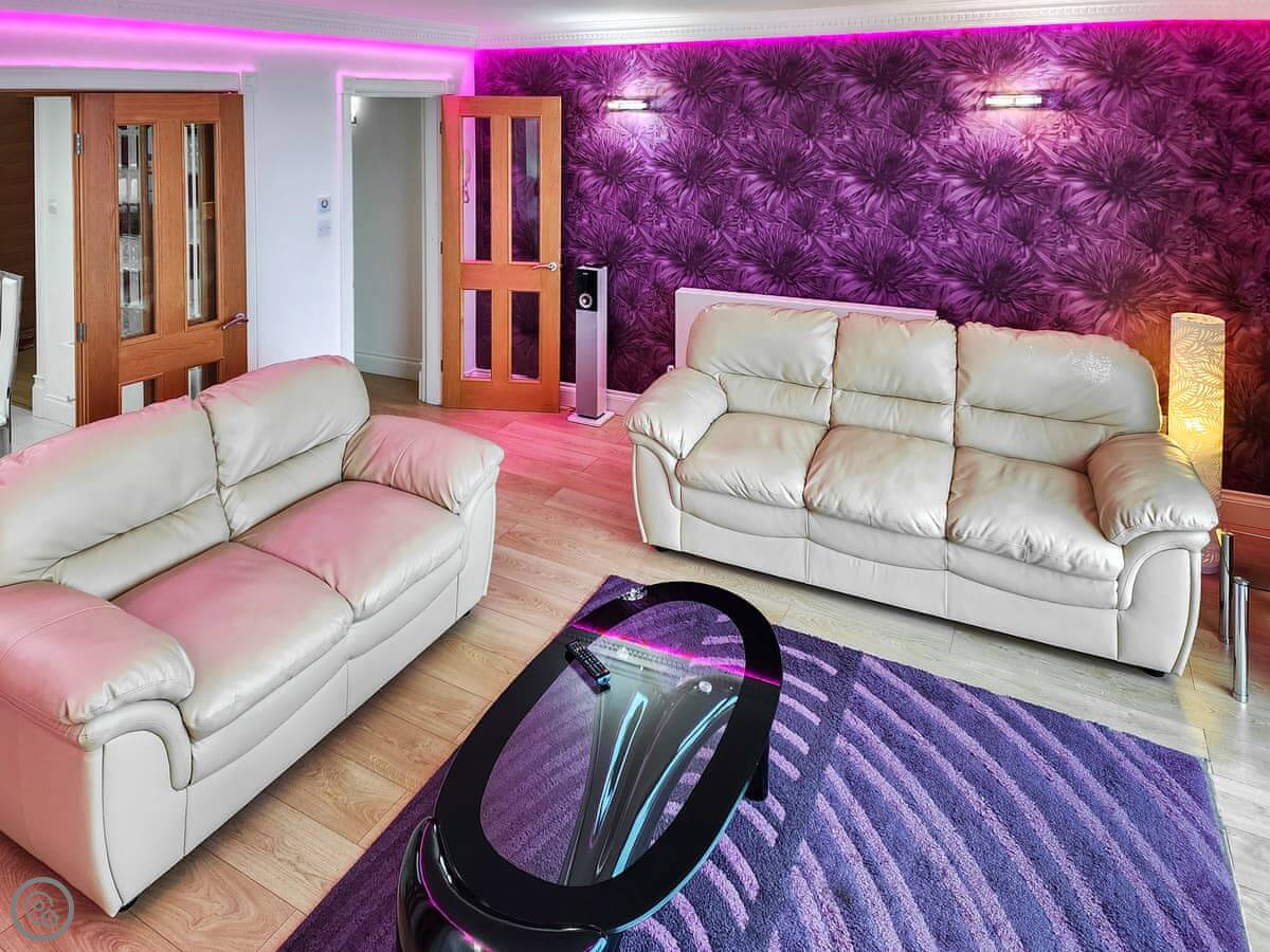 Inside, it's done in a modern style. The kitchen and living room have those LED mood lights. Covered parking is right outside the front door.