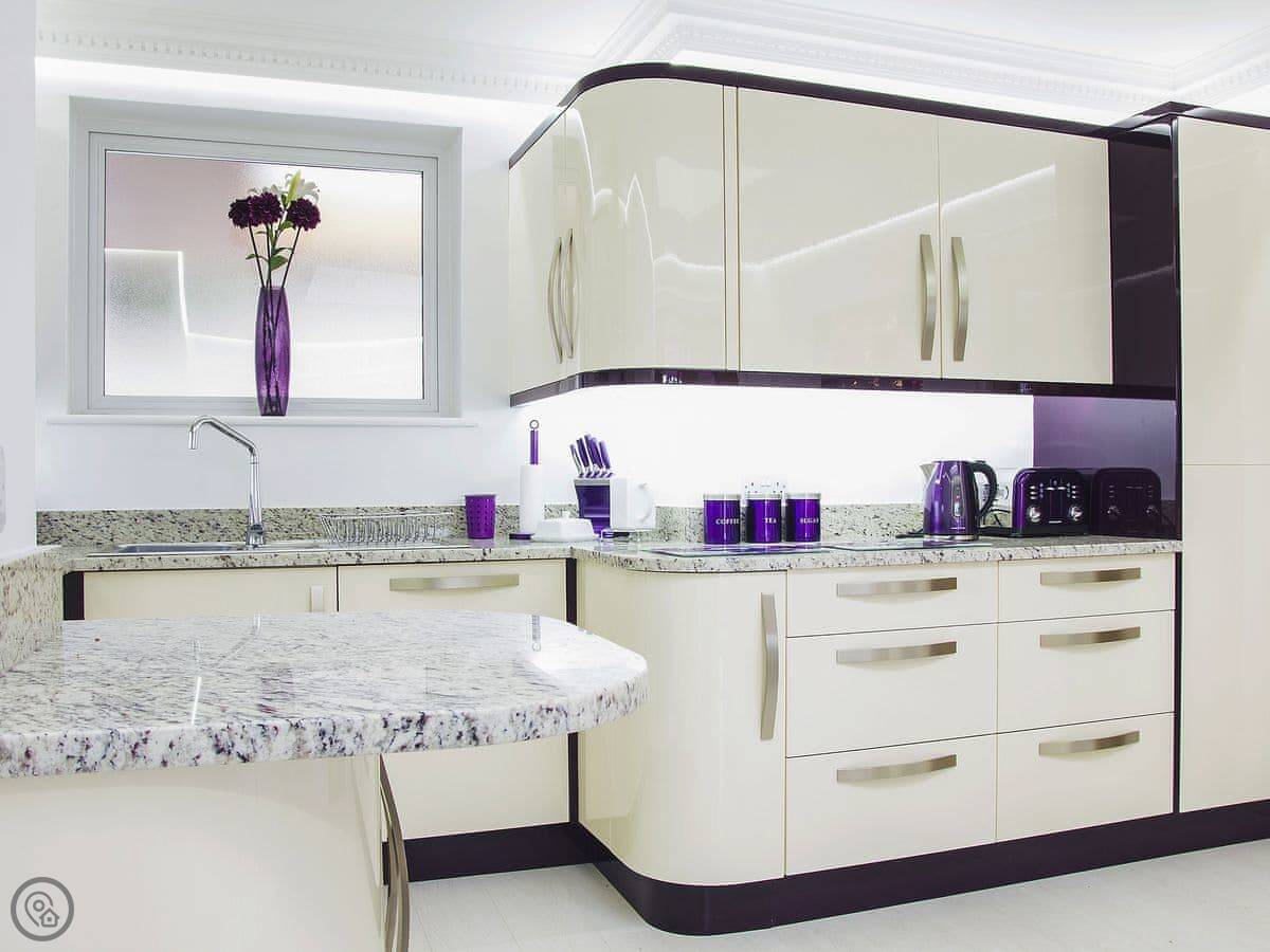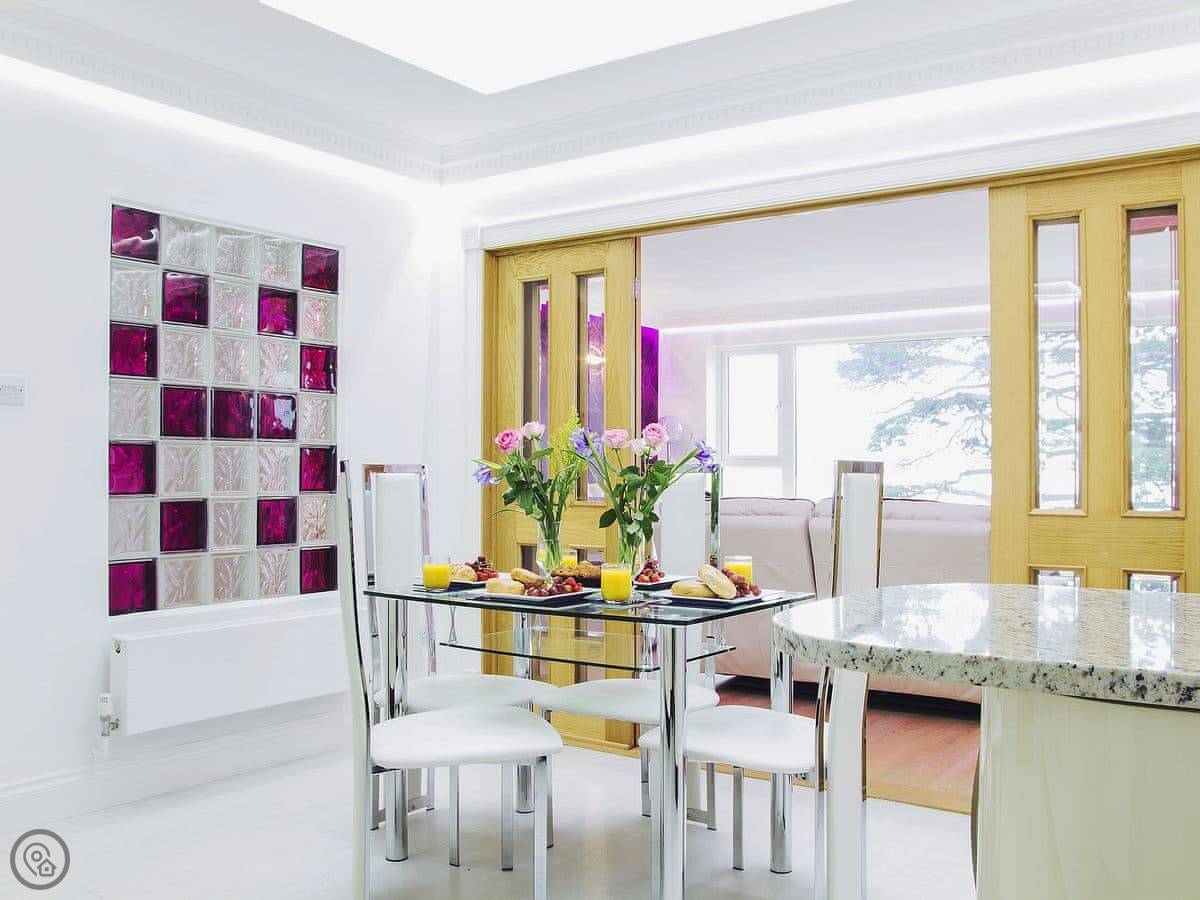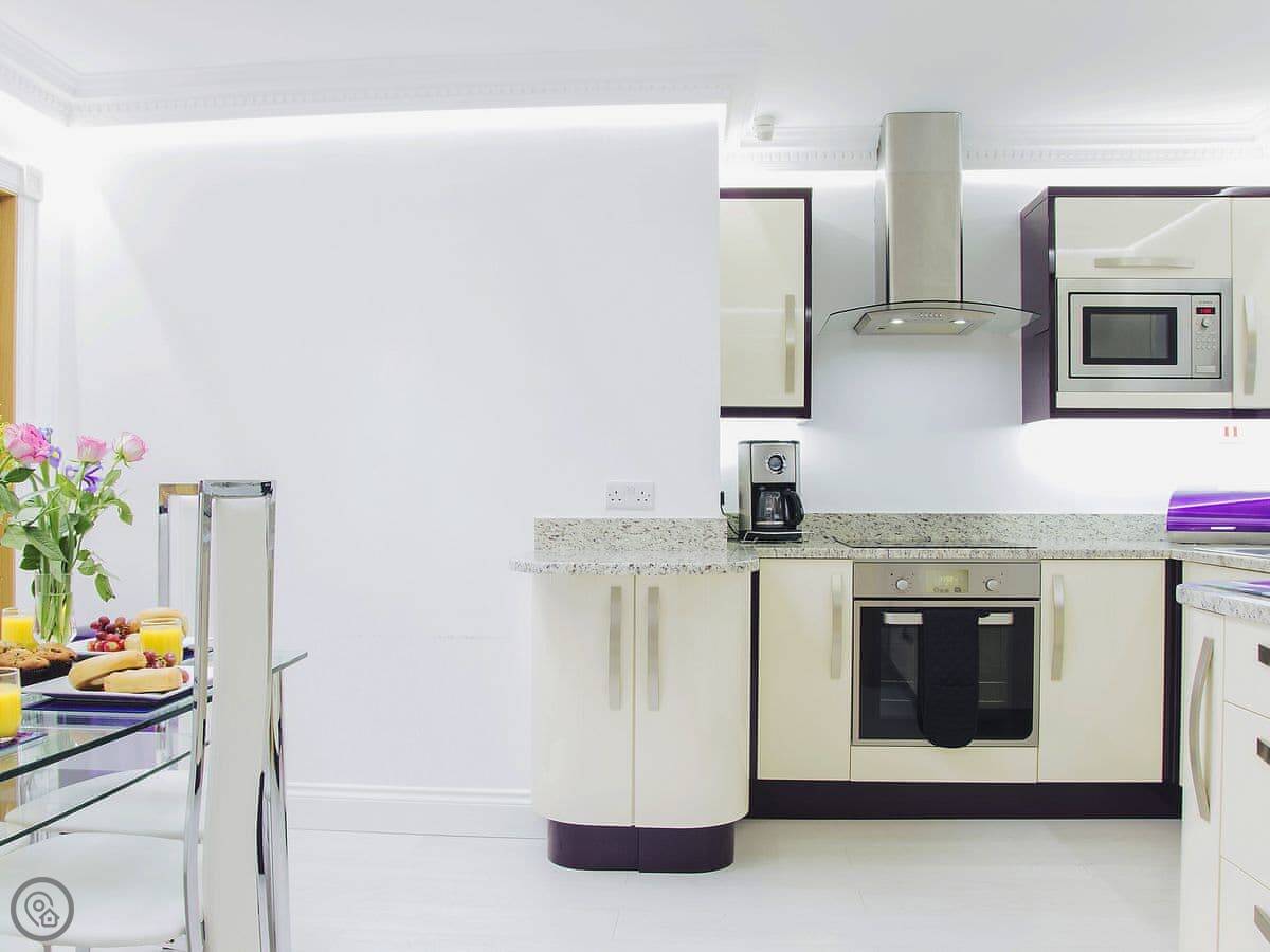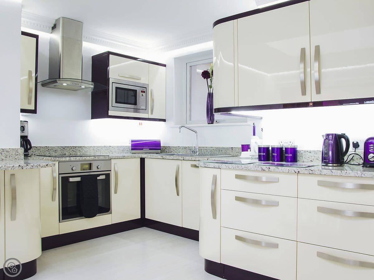 Inside, it's done in a modern style. The kitchen and living room have those LED mood lights. Covered parking is right outside the front door.