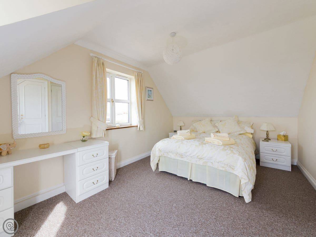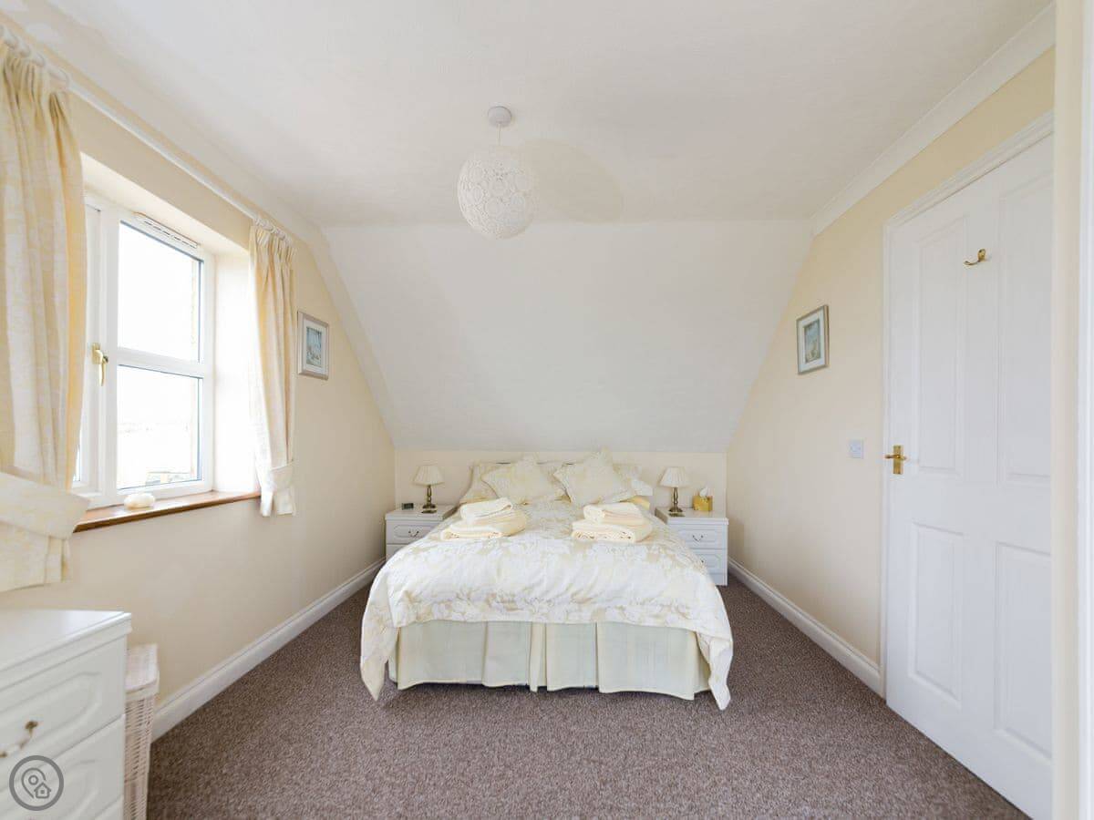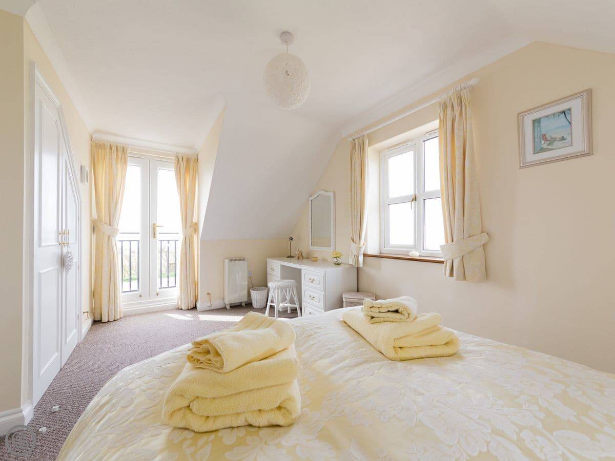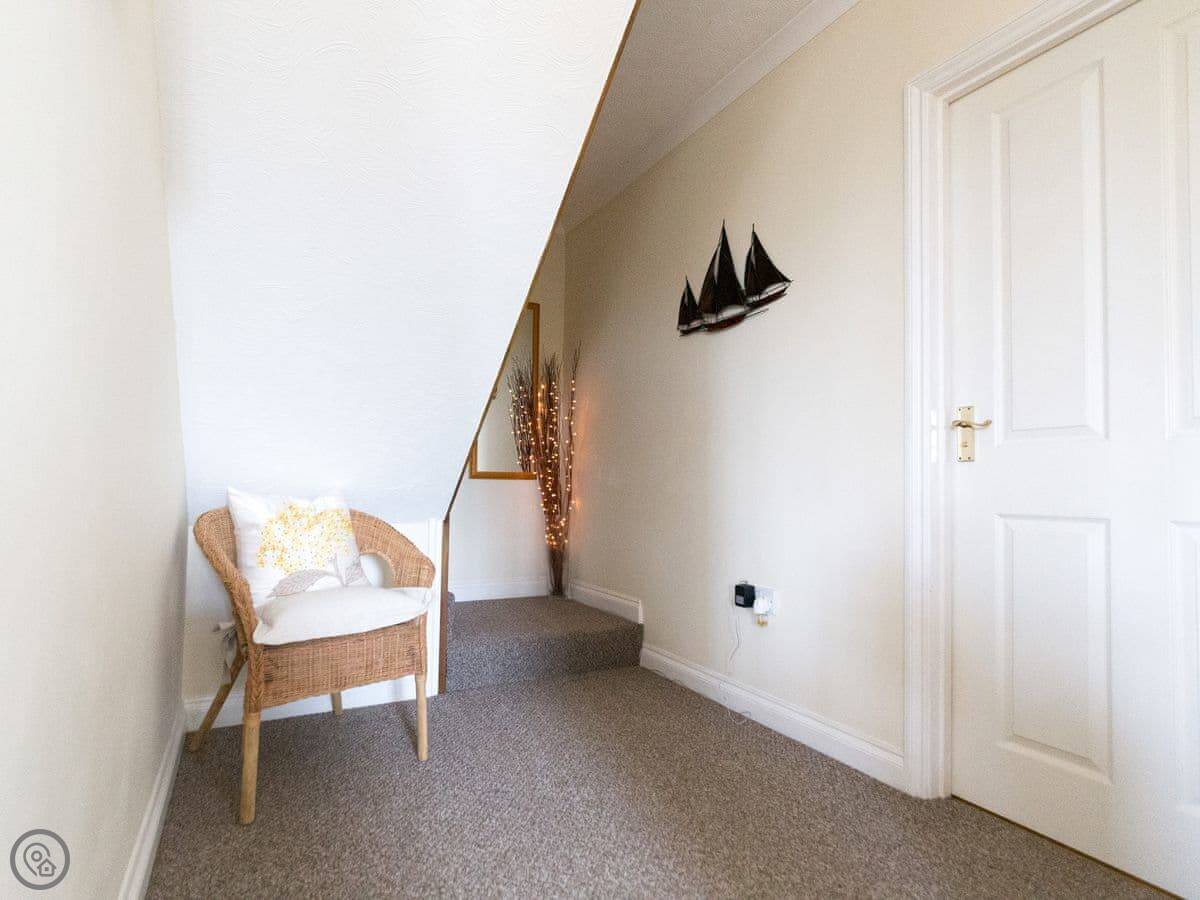 It sleeps four, with two bedrooms and one bathroom. There's a proper wood burner in the living room. The main bedroom has a balcony, which is nice, and you can see the sea from a few of the rooms. It's got a 4 Star rating, so it's well looked after.