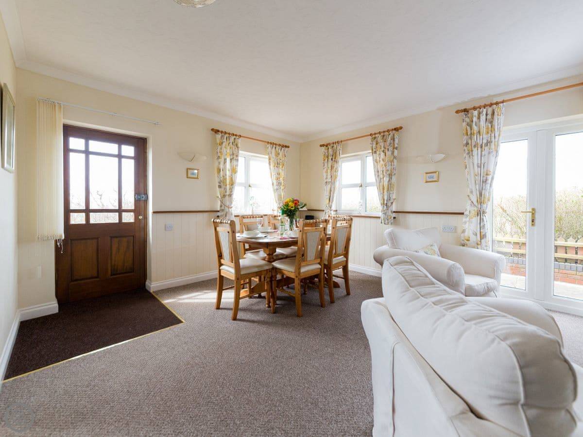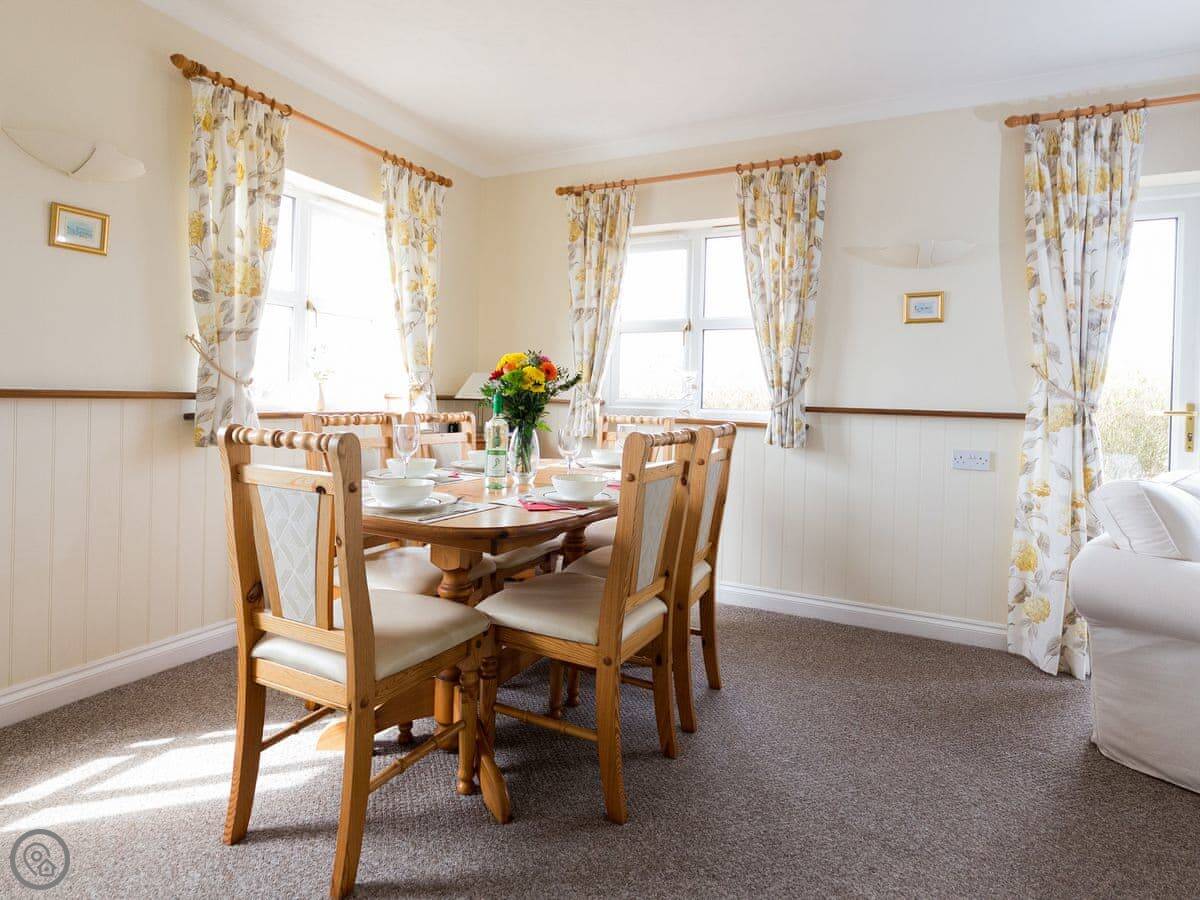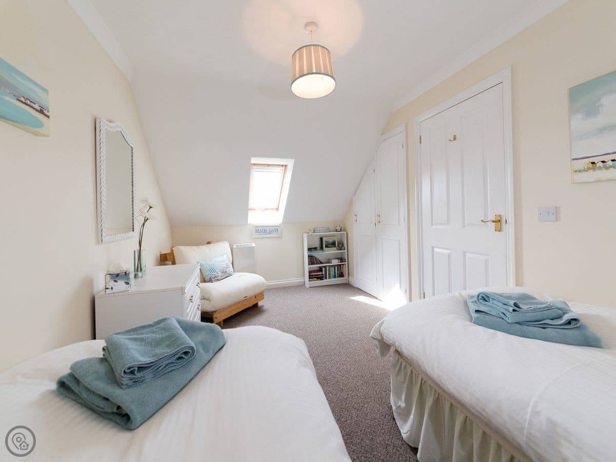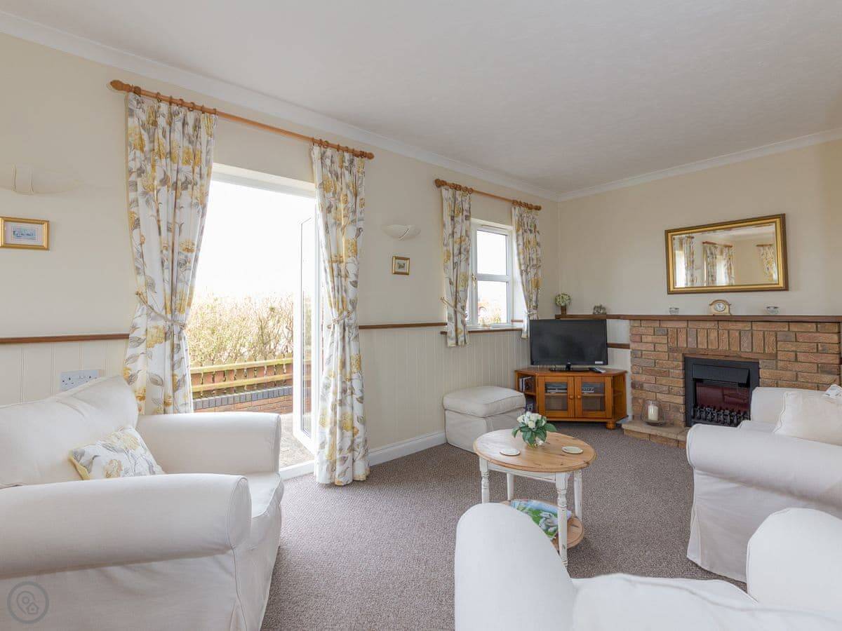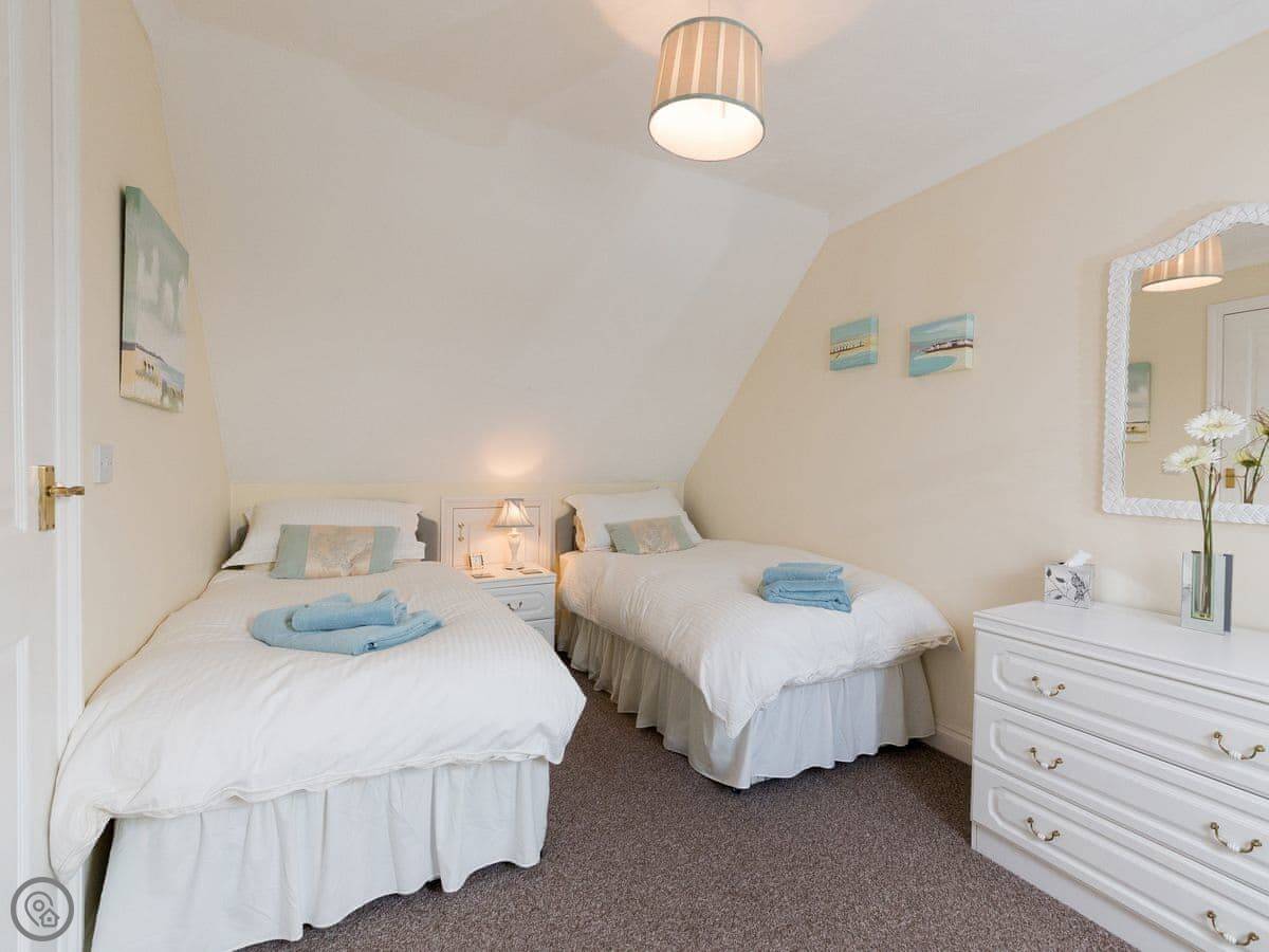 It sleeps four, with two bedrooms and one bathroom. There's a proper wood burner in the living room. The main bedroom has a balcony, which is nice, and you can see the sea from a few of the rooms. It's got a 4 Star rating, so it's well looked after.