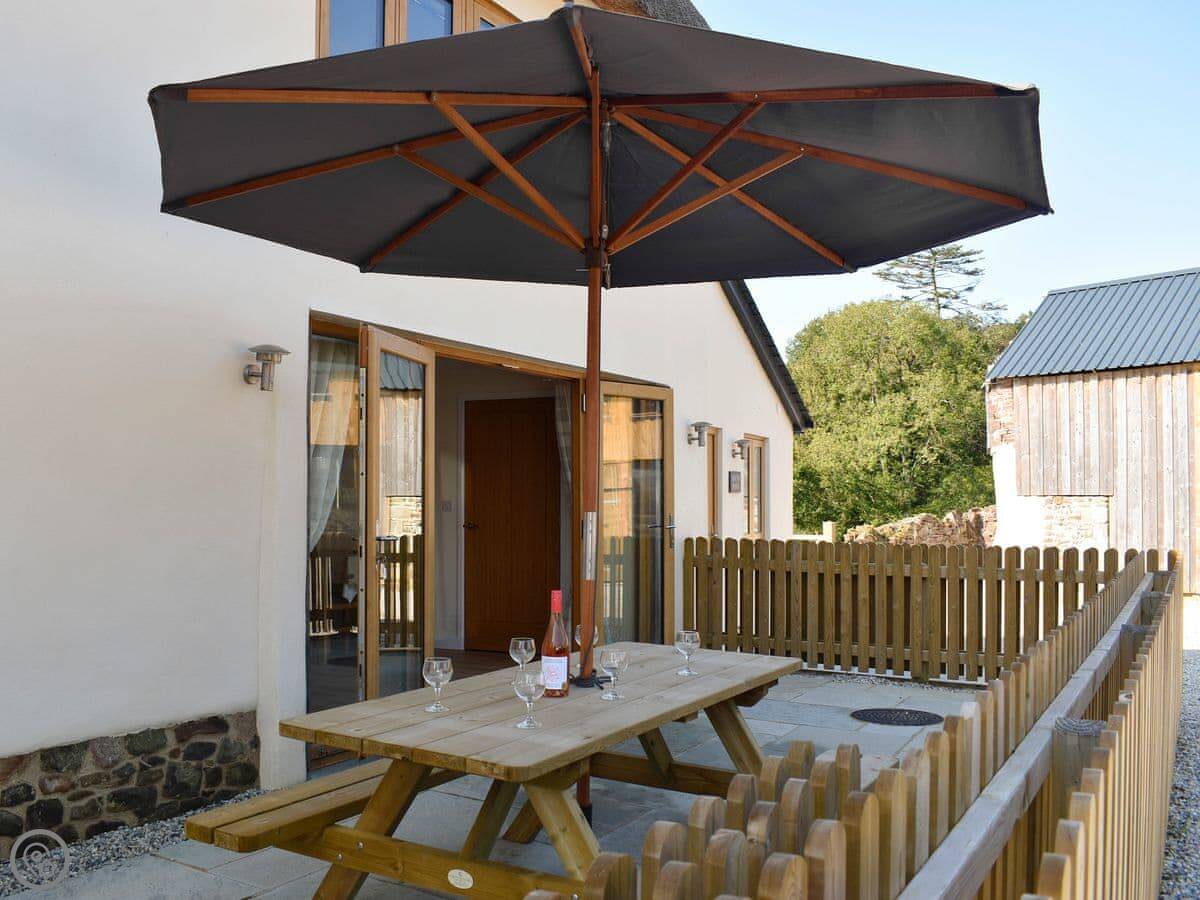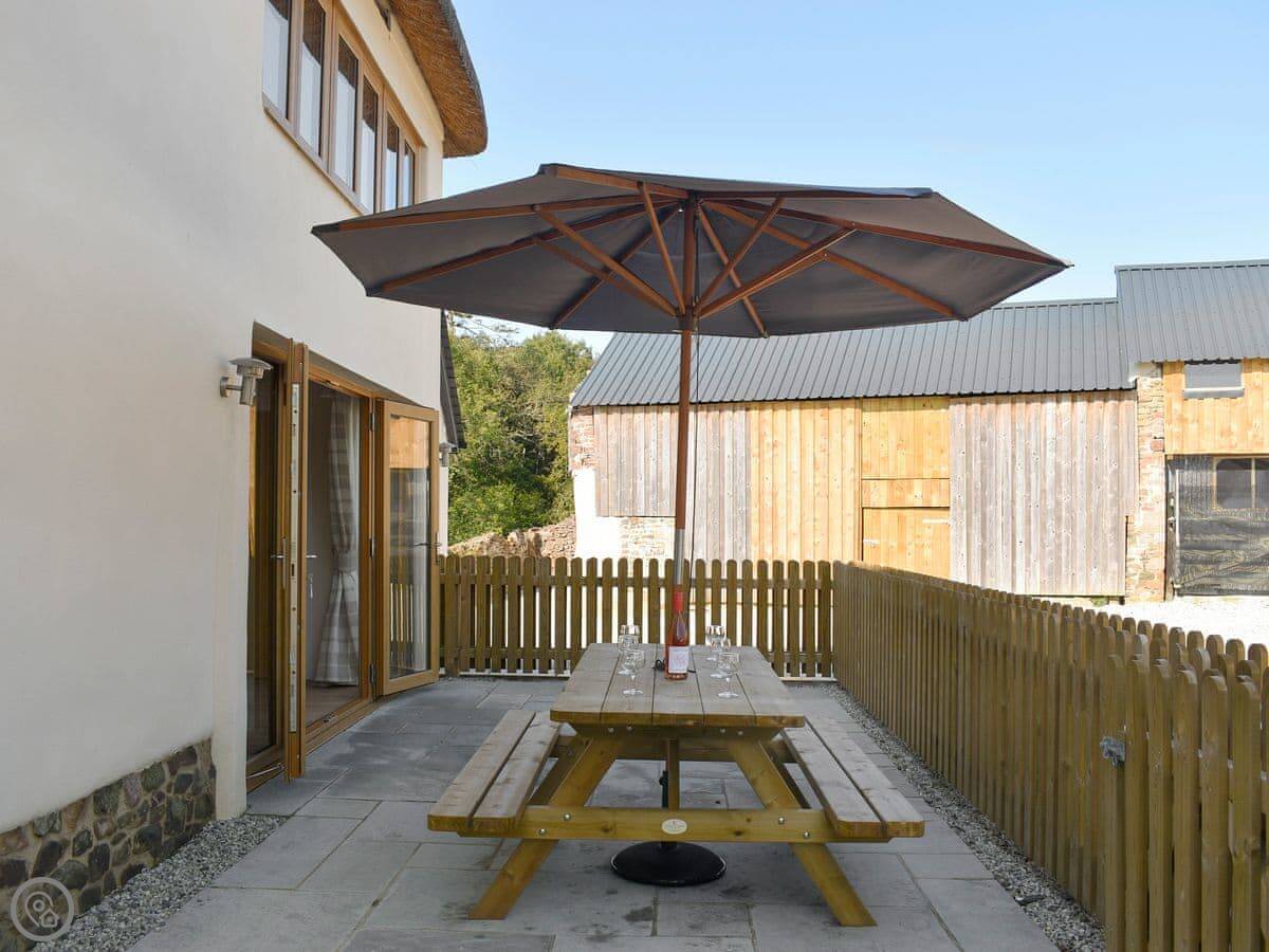 Outside there's a patio with a bench and a parasol. The garden is enclosed. You can park right there.