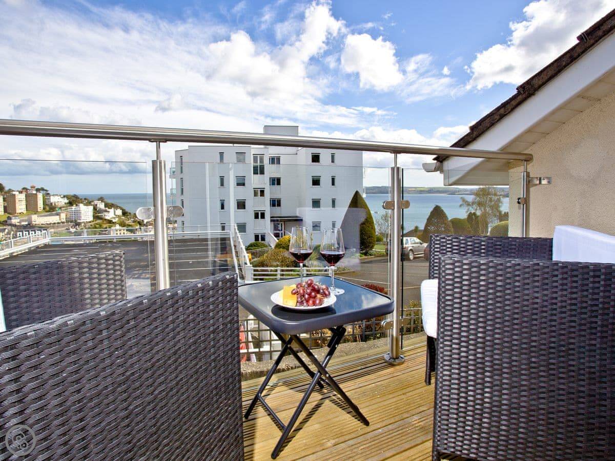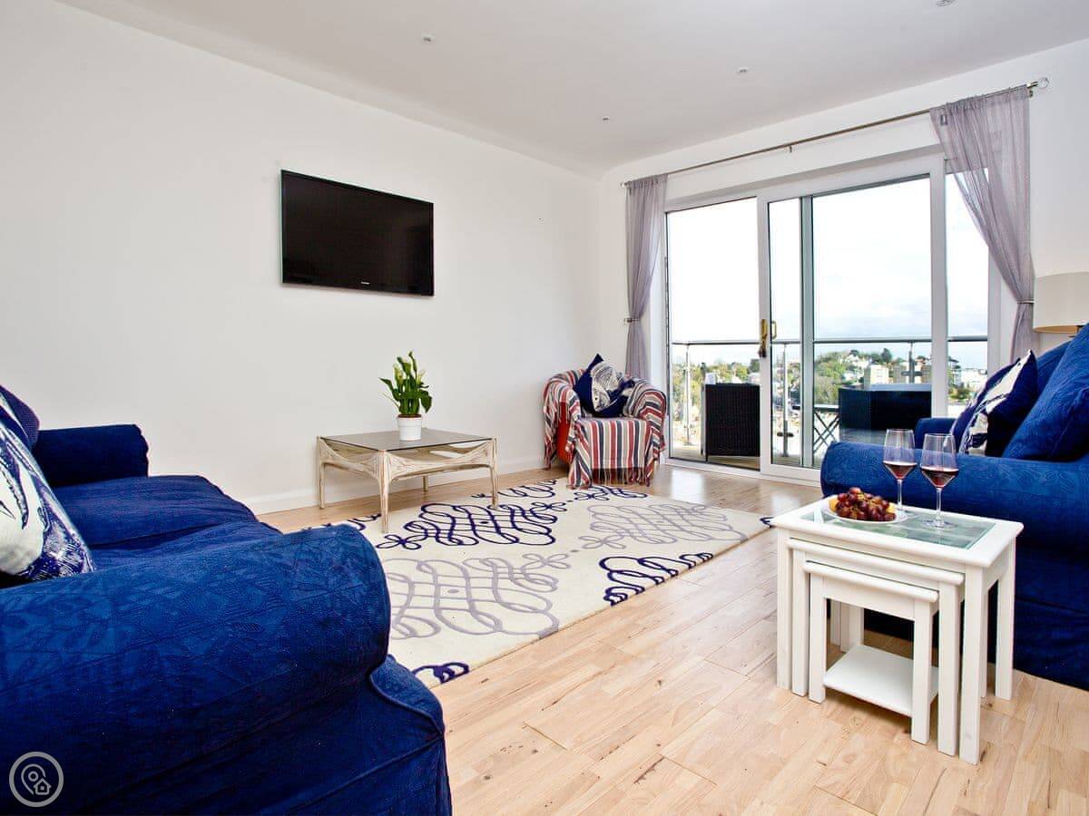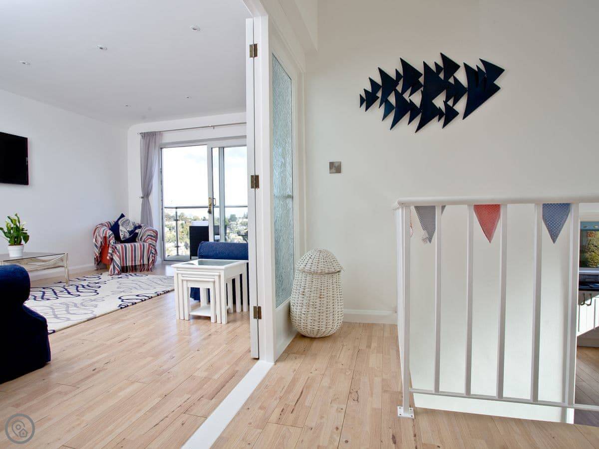 It sleeps six, has three bedrooms and two bathrooms. It's a 4 Star place, so it's comfortable and well looked after. The living room is upstairs. It's bright with patio doors that open onto a balcony. You get a good view over the town and out to sea from there.