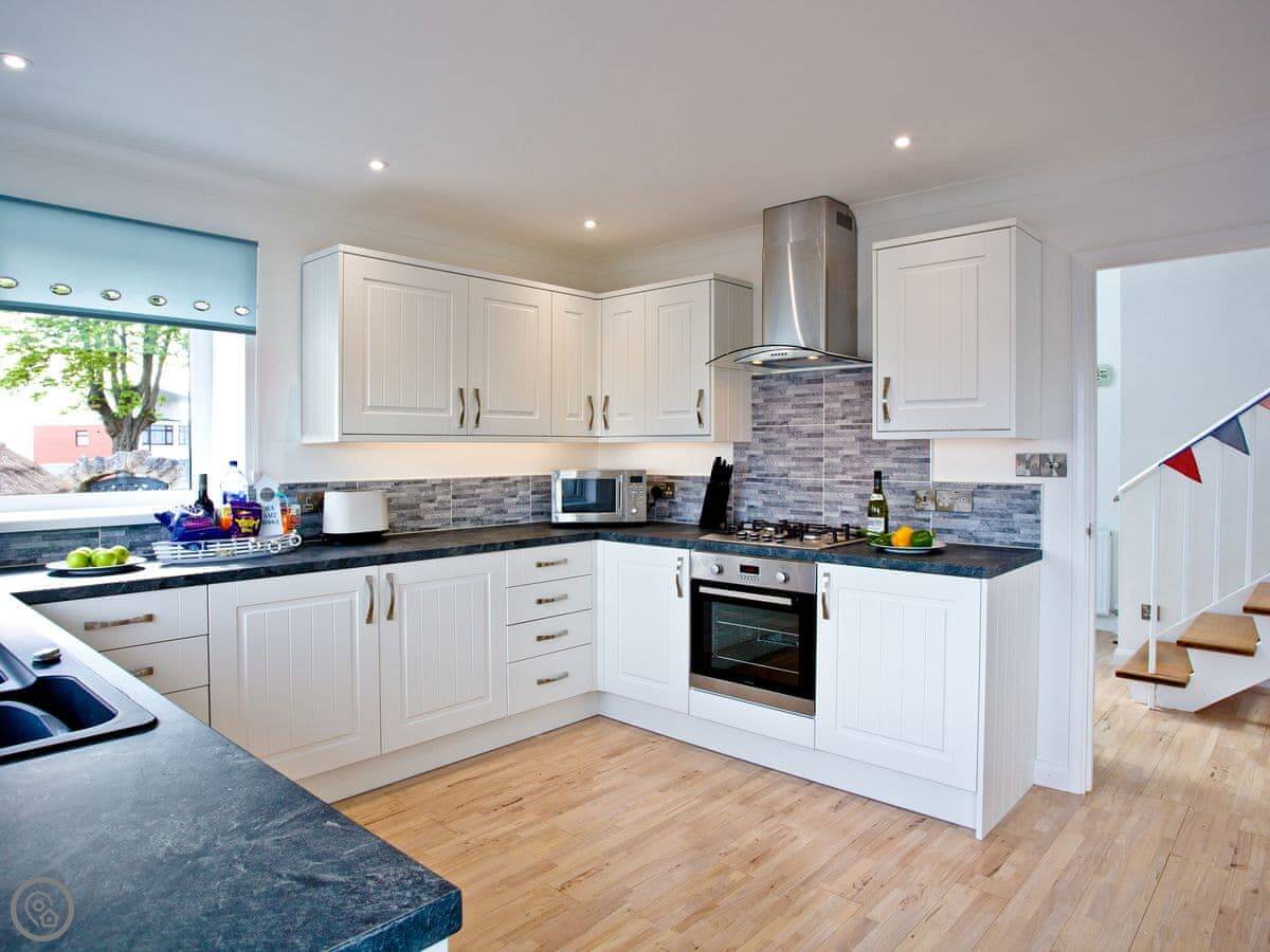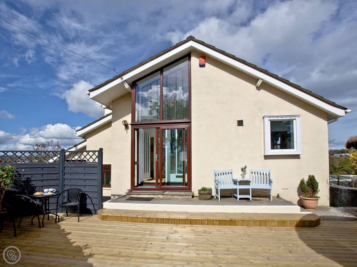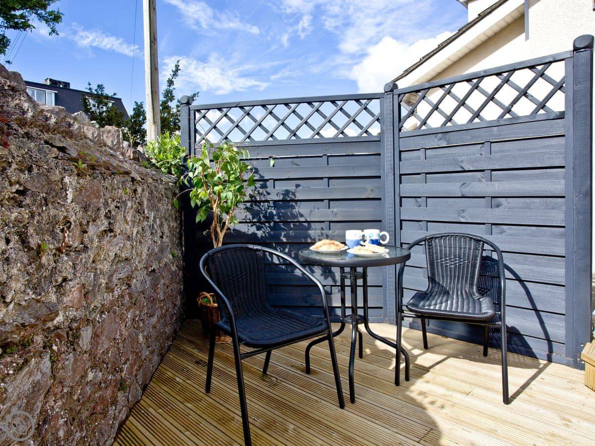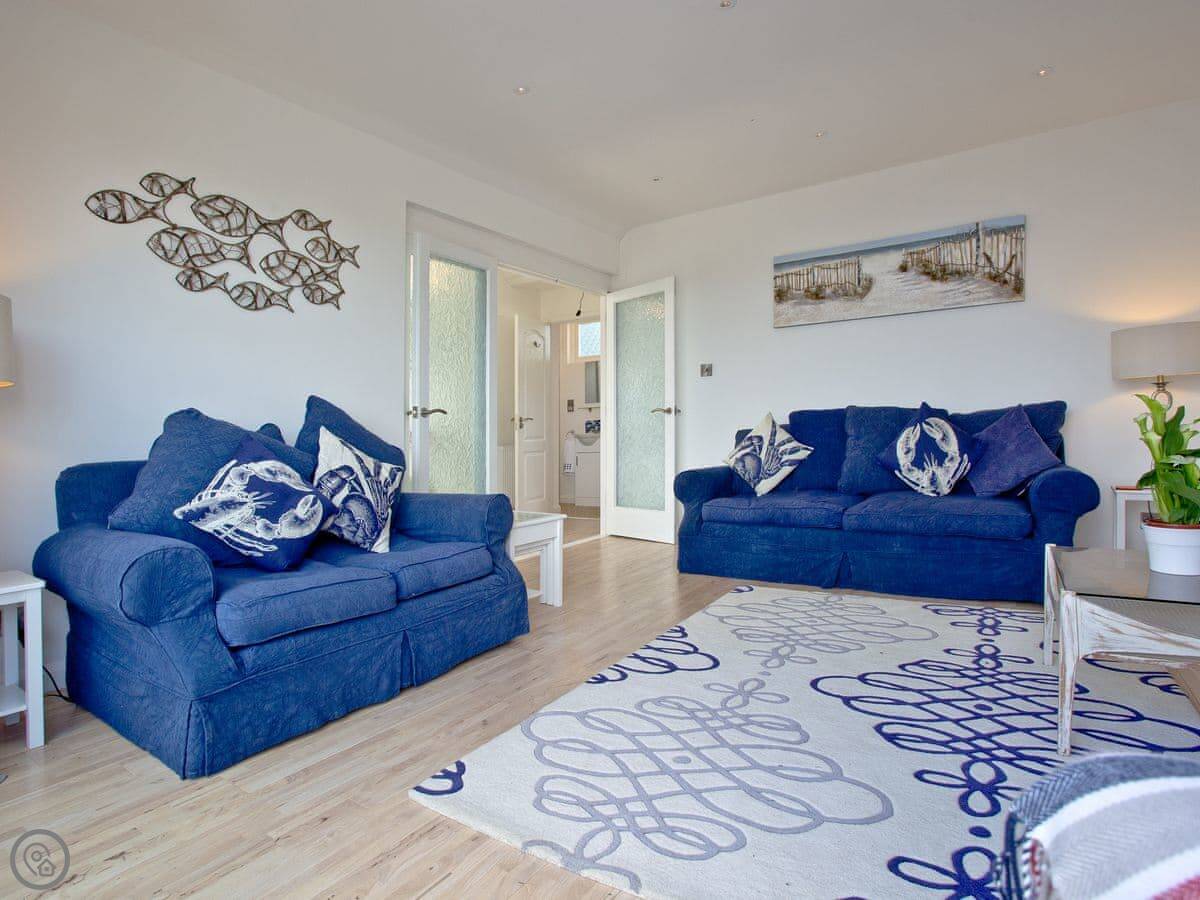 It sleeps six, has three bedrooms and two bathrooms. It's a 4 Star place, so it's comfortable and well looked after. The living room is upstairs. It's bright with patio doors that open onto a balcony. You get a good view over the town and out to sea from there.
