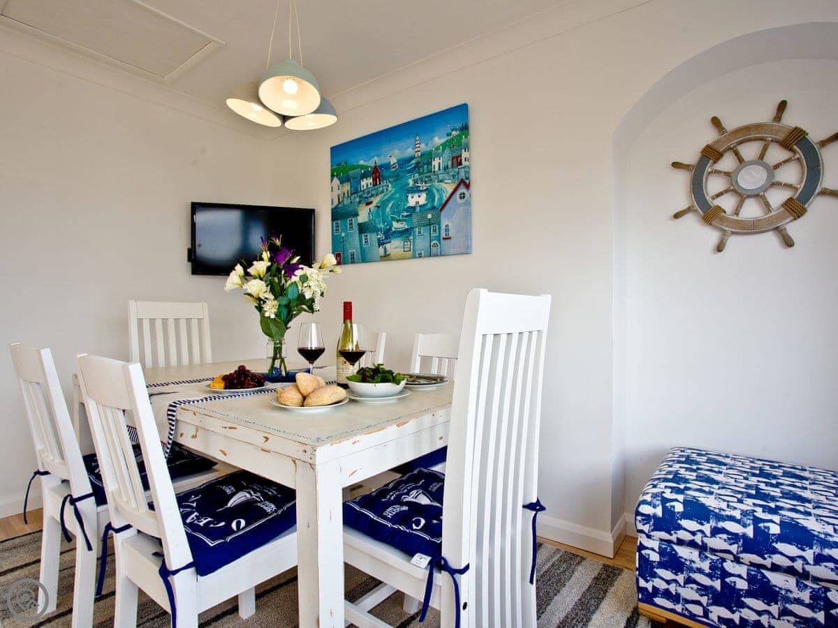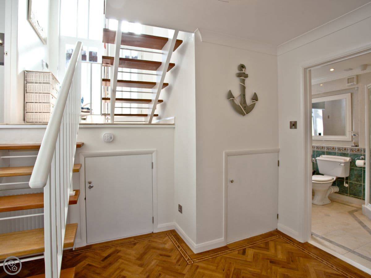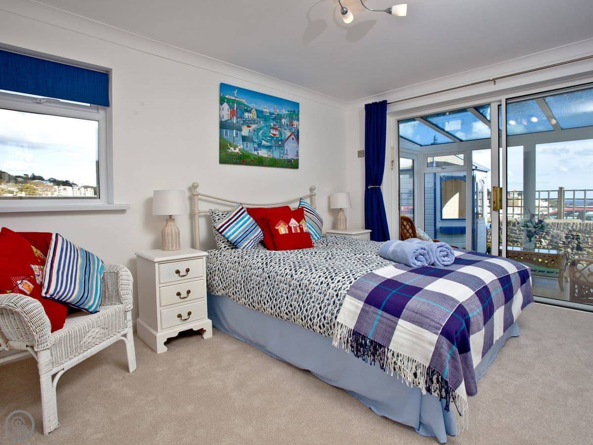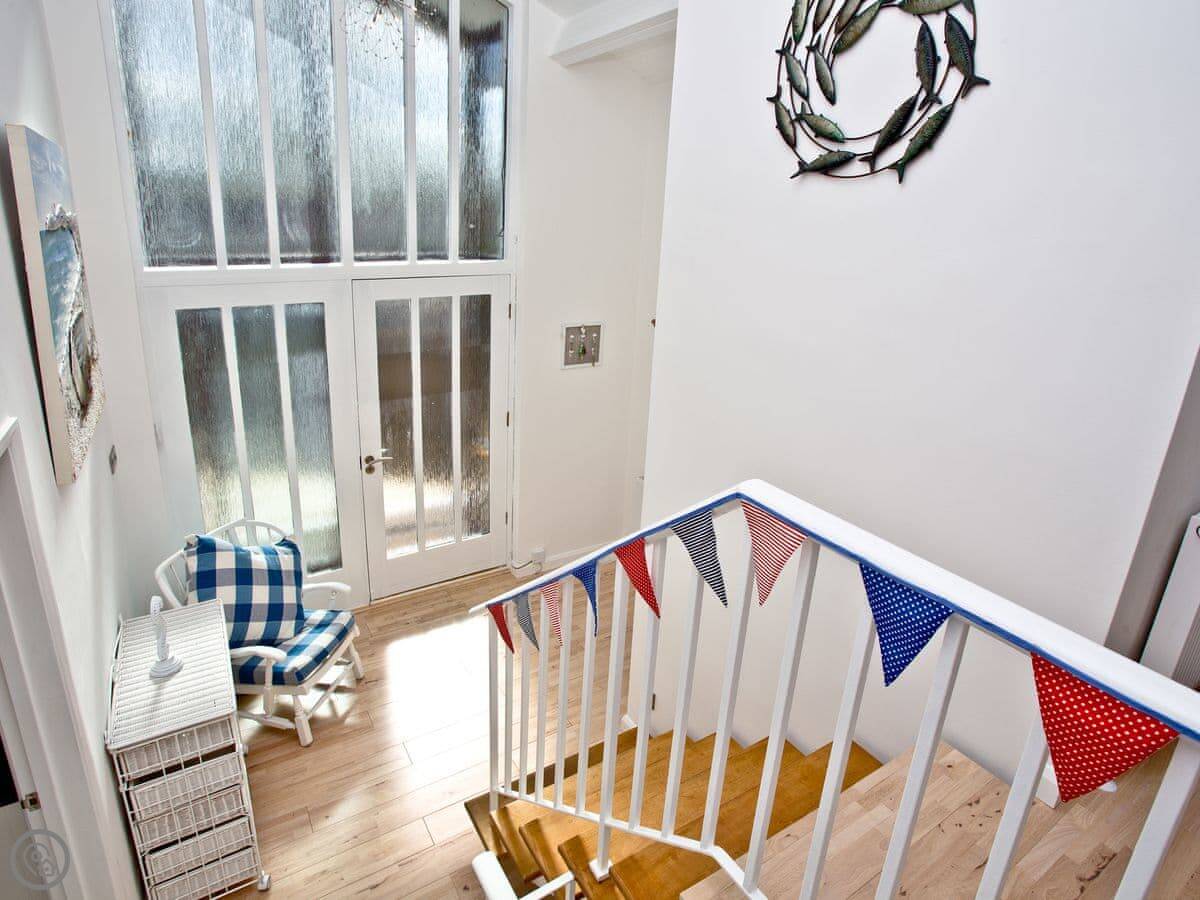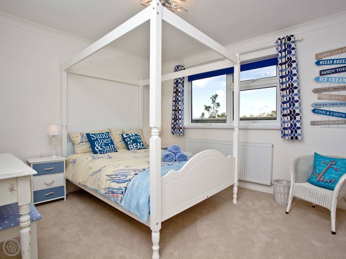 Two of the bedrooms are downstairs. The main one has its own conservatory that leads out to a private bit of garden with a summer house. The other is a four-poster room. The twin room is upstairs next to the shower room. All the decoration is sea-themed.
