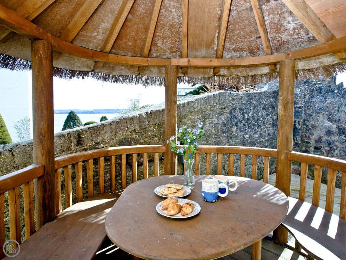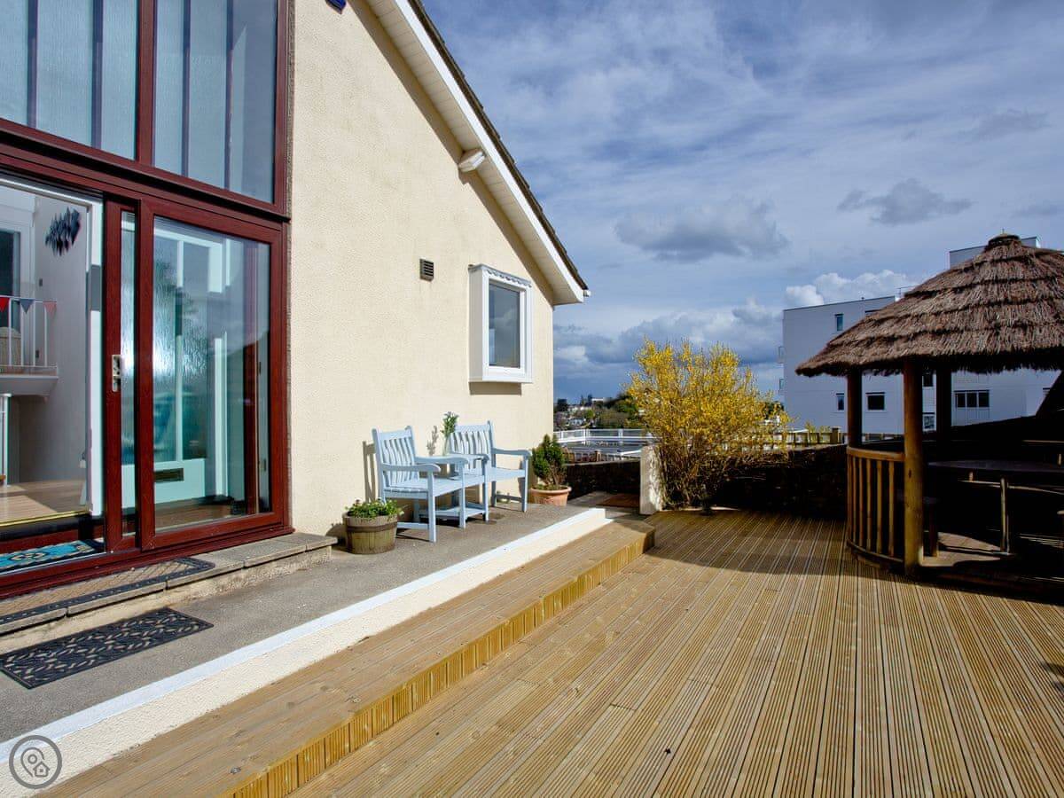 The garden gets a lot of sun. It wraps around the house so you can follow the sun during the day. There's a big deck with a thatched shelter on it. It's a good spot to sit with a drink.
