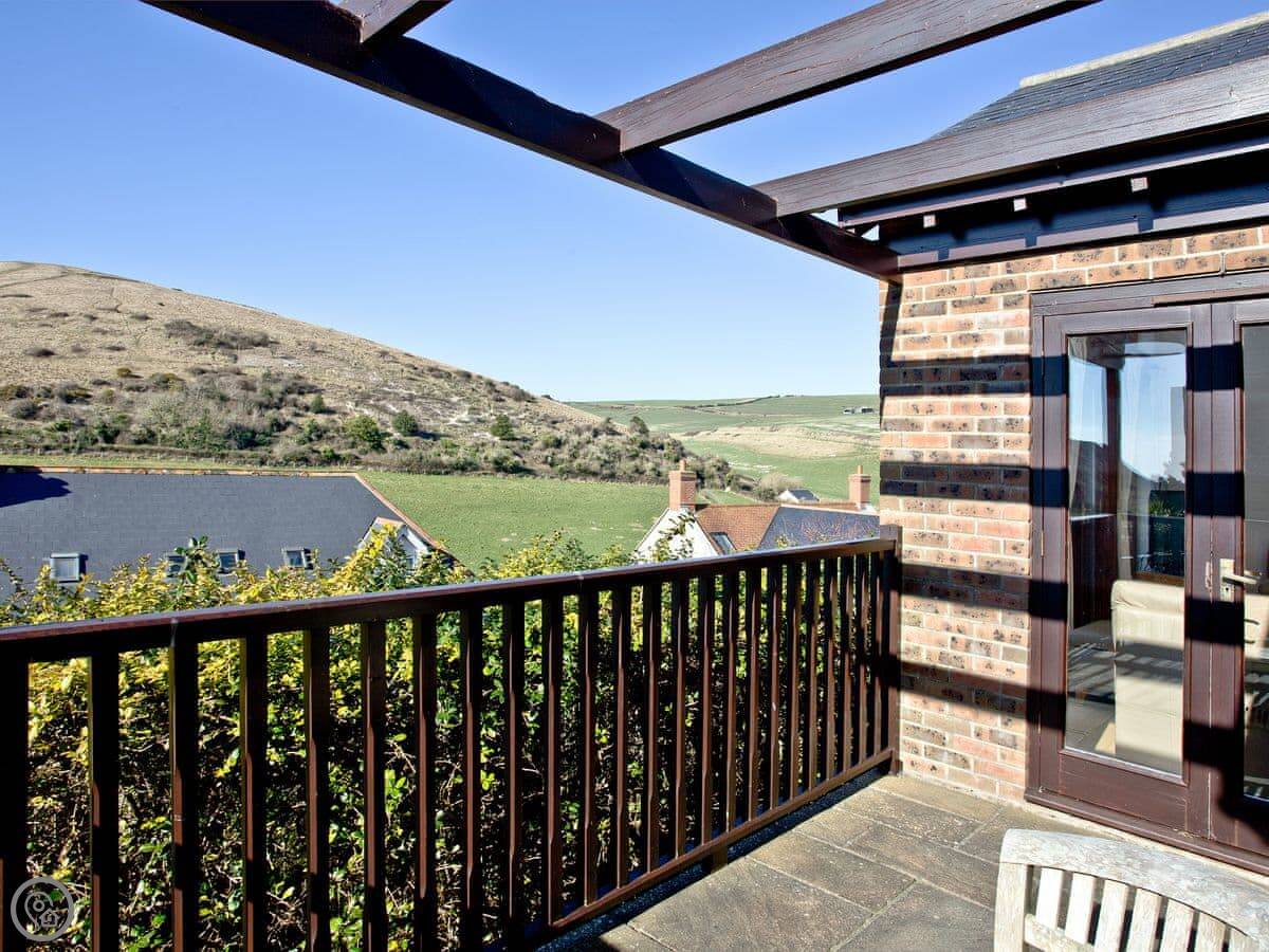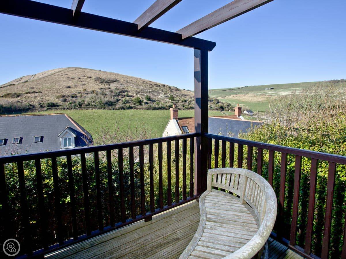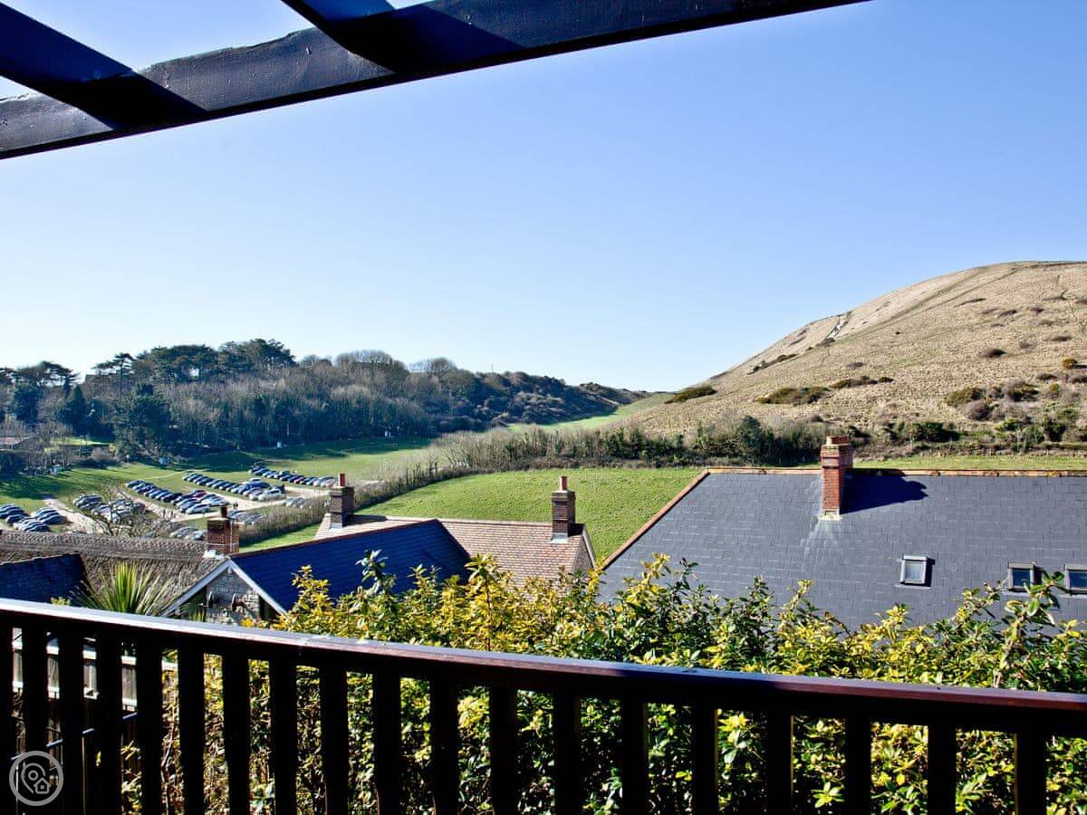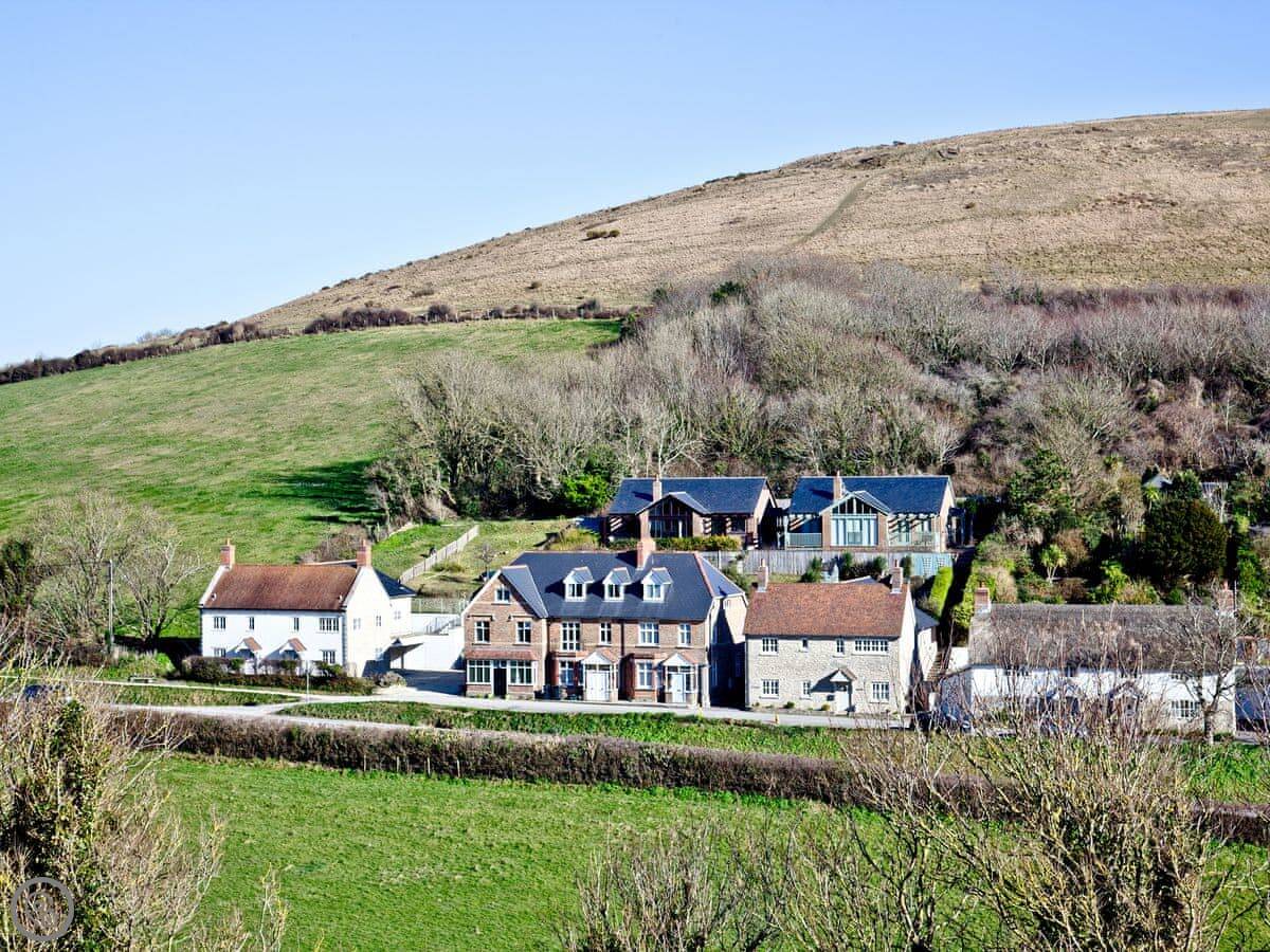 This is Seabreeze. It's a modern house up on the hill above Lulworth Cove. You can see the fields from the back. It's about a five minute walk down to the cove itself.