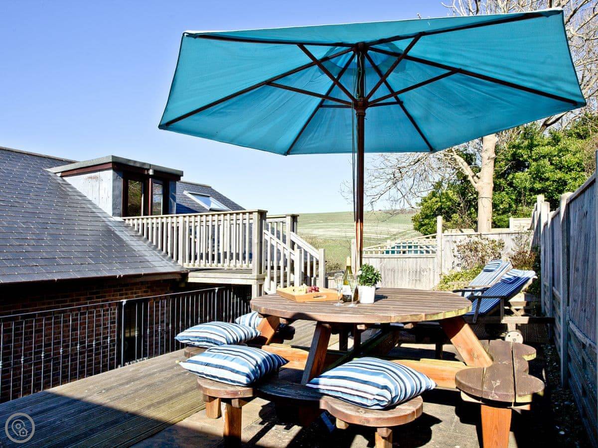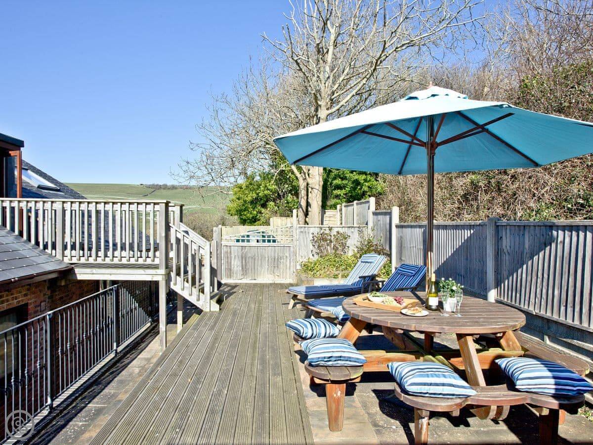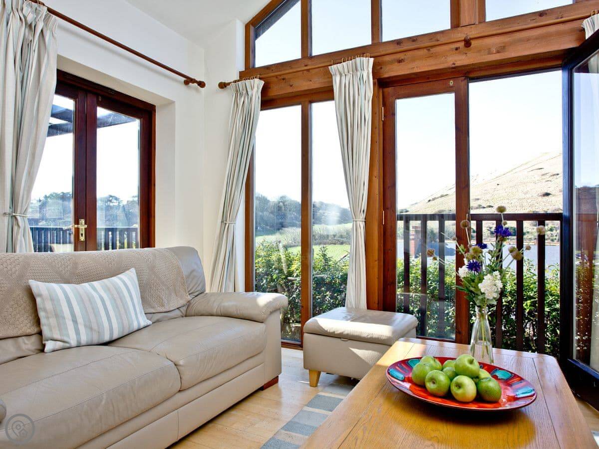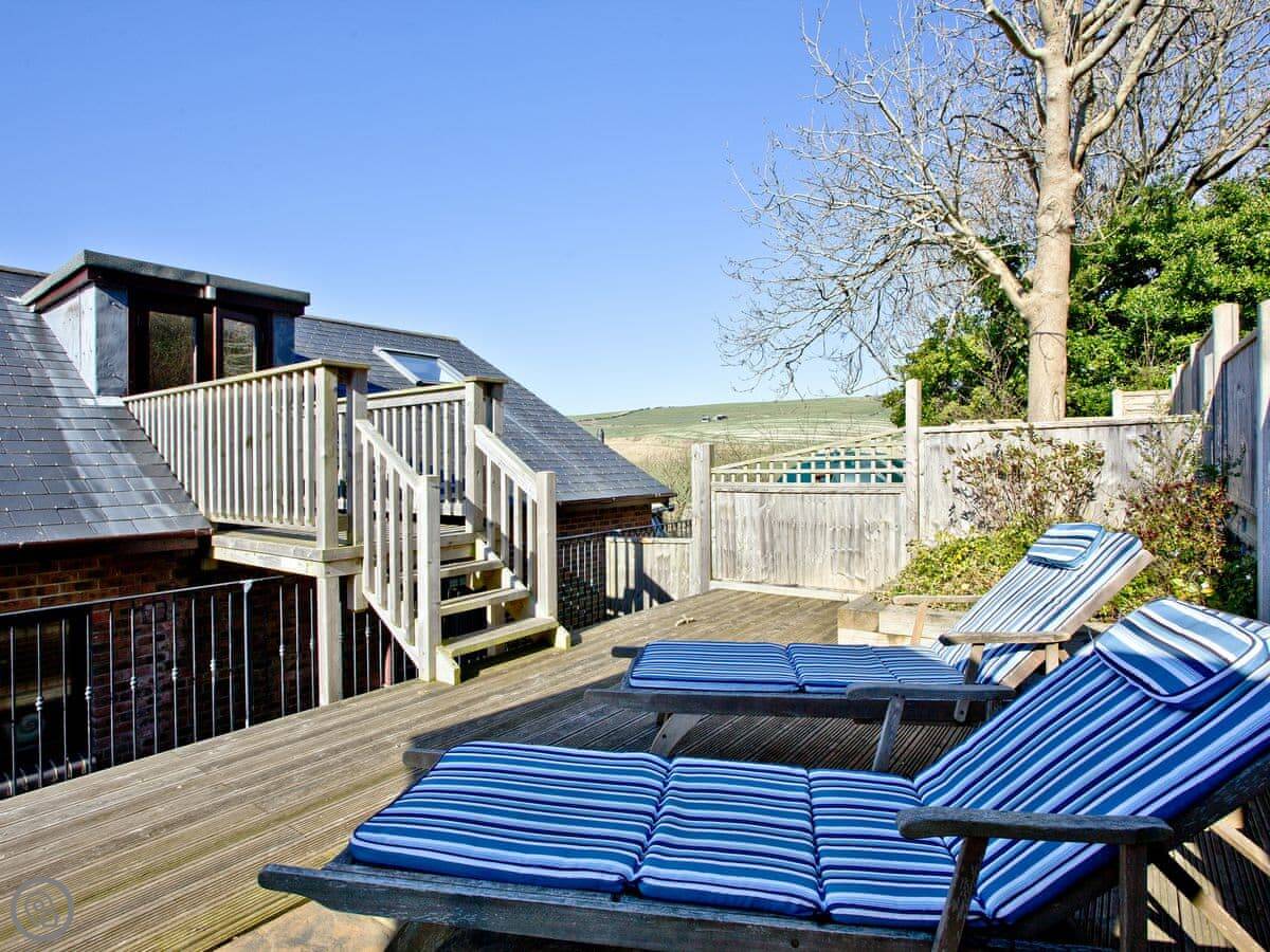 This is Seabreeze. It's a modern house up on the hill above Lulworth Cove. You can see the fields from the back. It's about a five minute walk down to the cove itself.