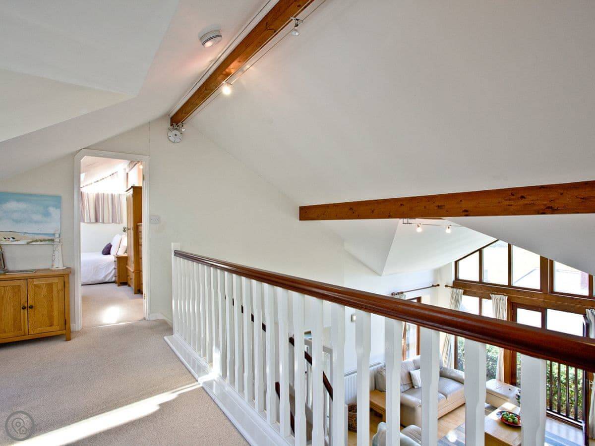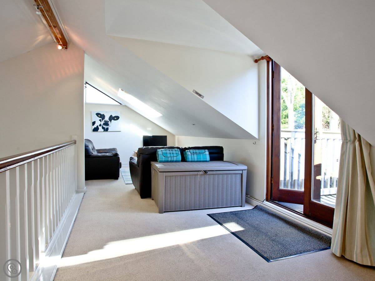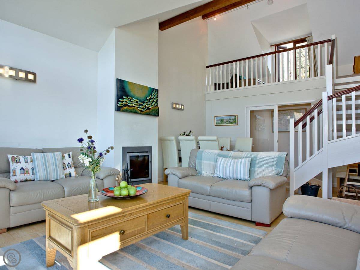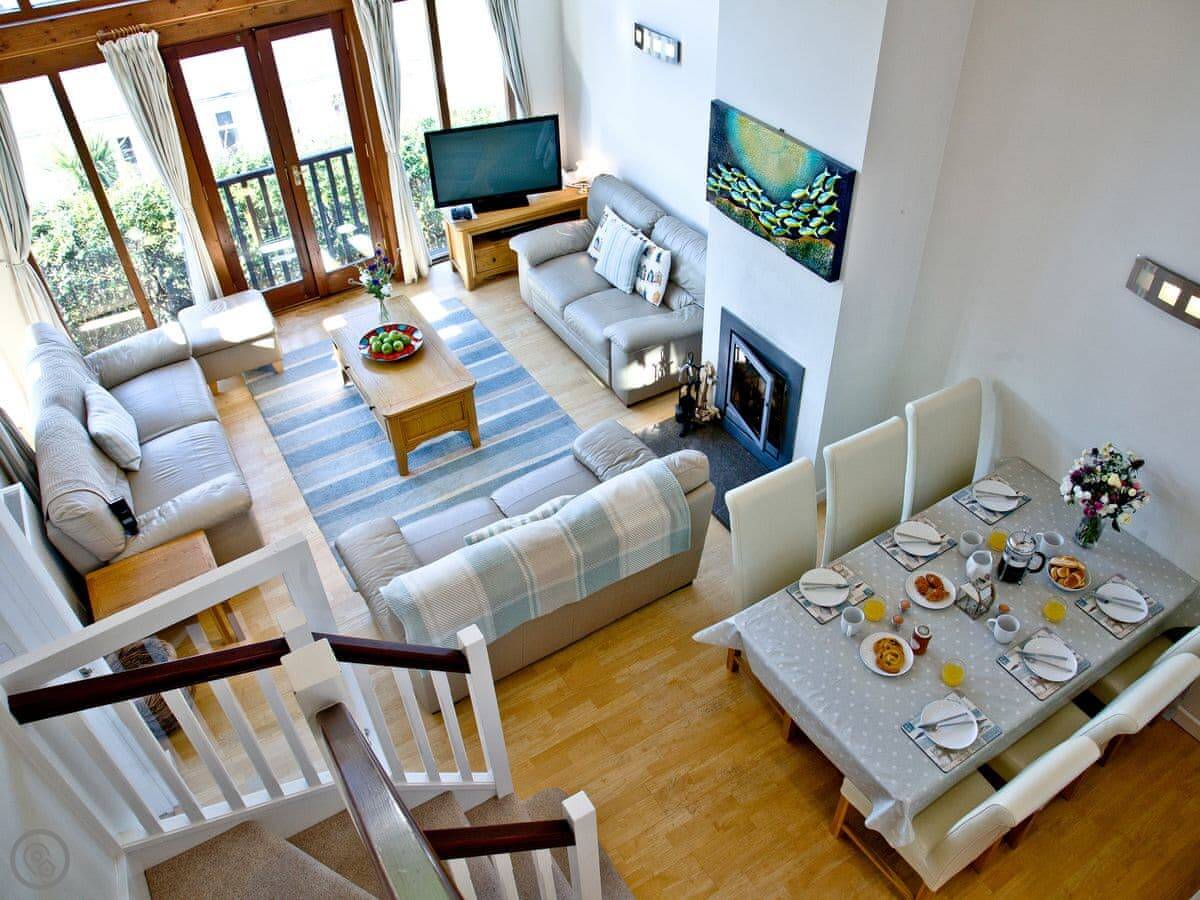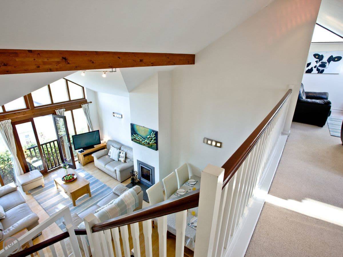 It sleeps eight people. Four bedrooms, three bathrooms, so that usually works out alright. The living space is big, and there's an extra little furnished area up on the gallery landing if someone wants a quiet spot. It's got a 4 Star rating.