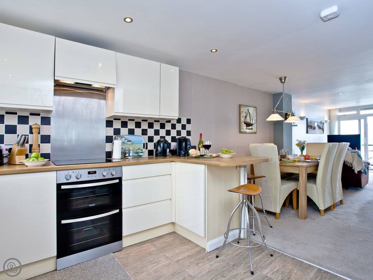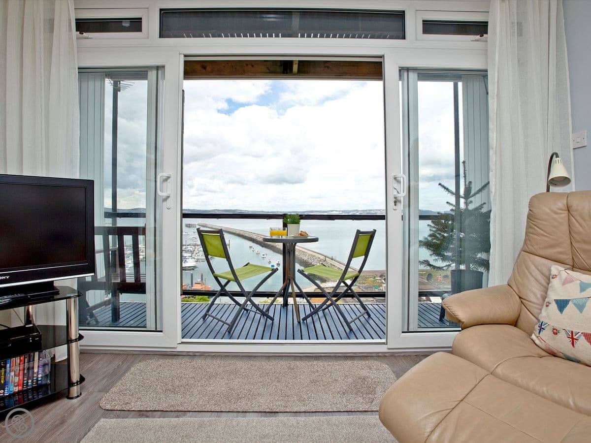 The main living area is open plan, on the middle floor. Sliding doors open onto a balcony with a table. It gets the sun in the evening. You can sit out there with a drink and watch the harbour.