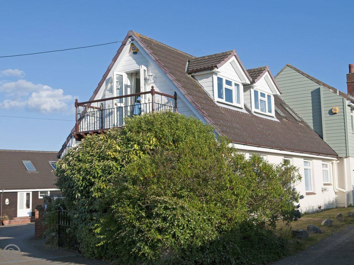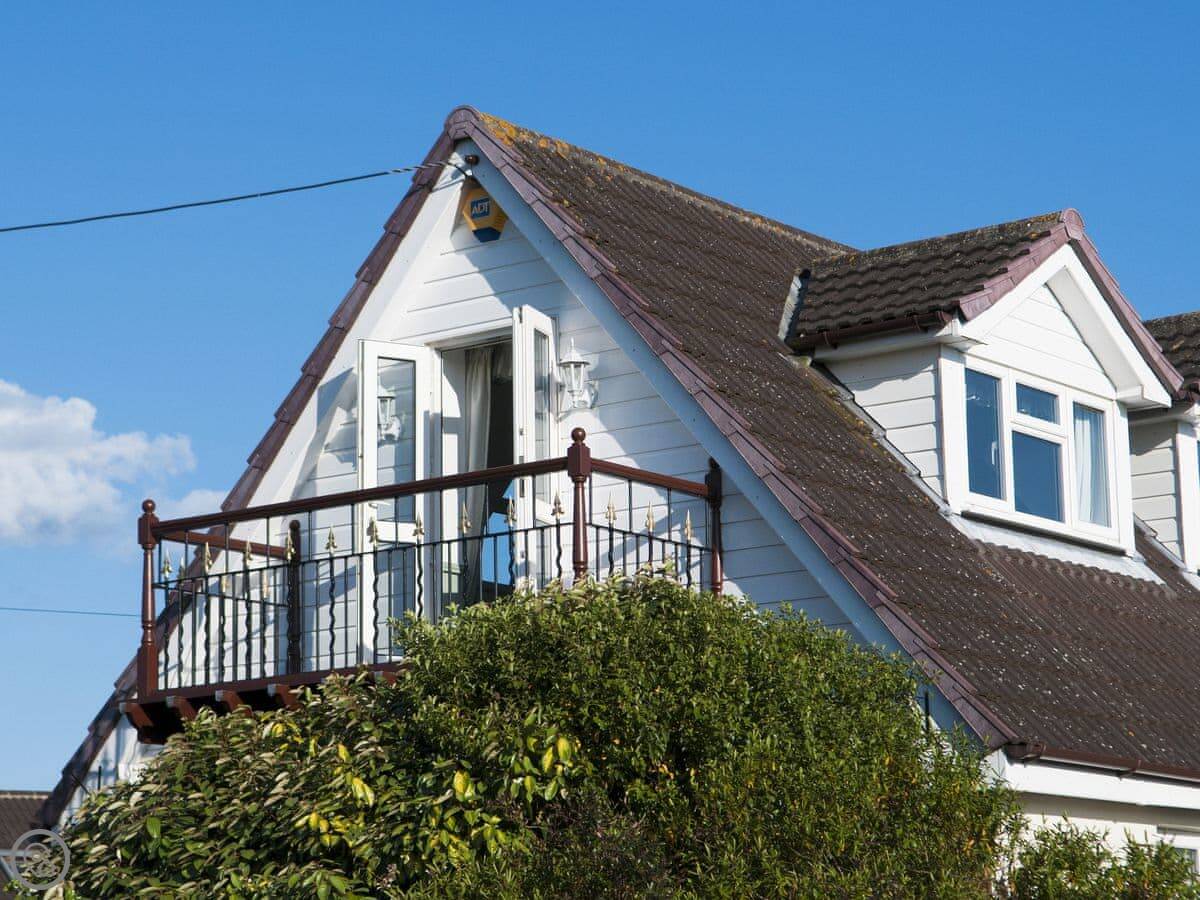 The layout is upside down. You live upstairs to get the view. The living room has doors out to a small balcony. You can see fields and, if you look carefully, a bit of the Solent water. The Isle of Wight Steam Railway runs through the fields. You can watch it go by from upstairs.