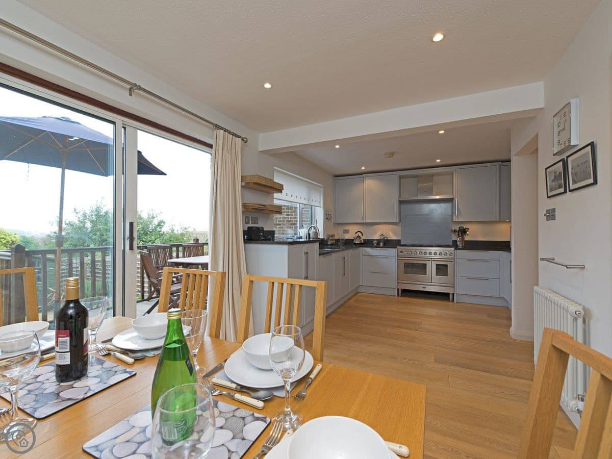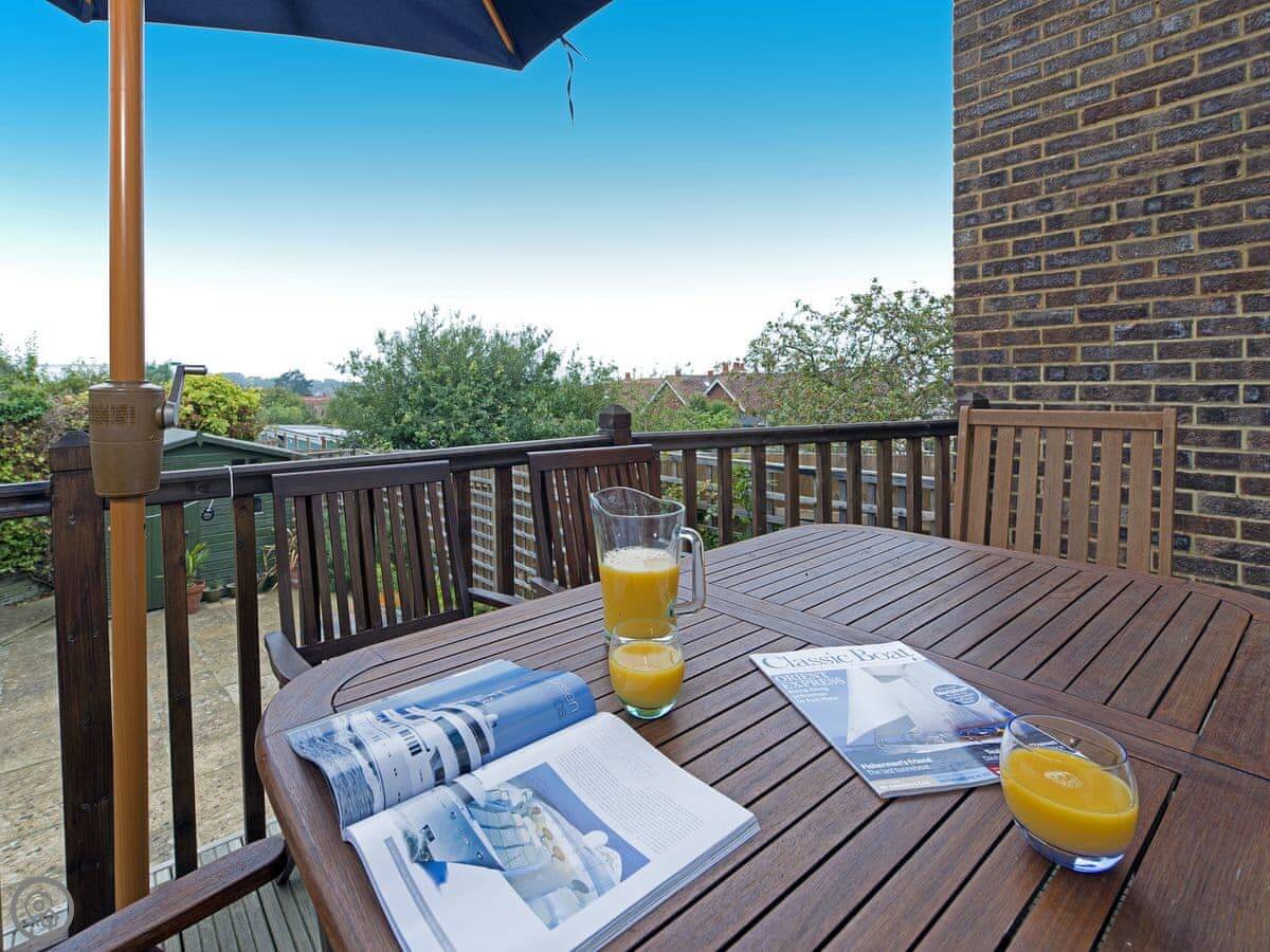 Outside, there's a raised deck. You can see the sea from there, over the rooftops. It's not a vast panoramic view, but you can see the water. It's a nice spot.