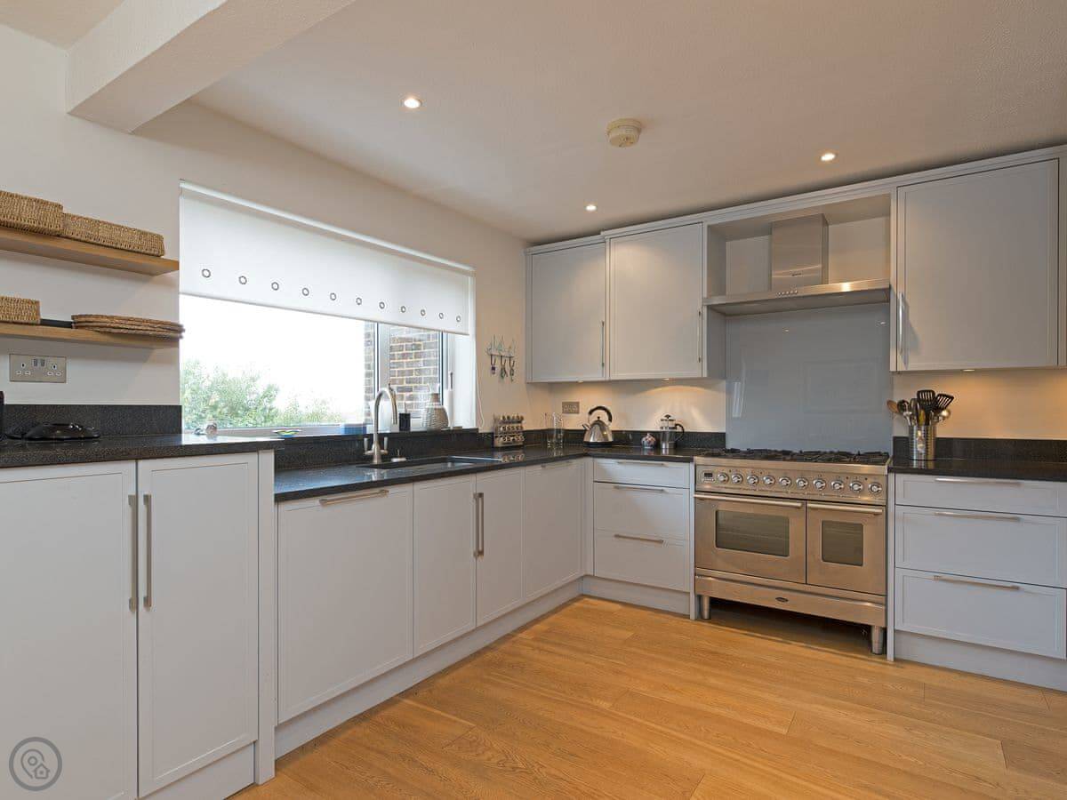 The main room is open plan, kitchen and living area together. It's light. There's a woodburning stove for colder nights.