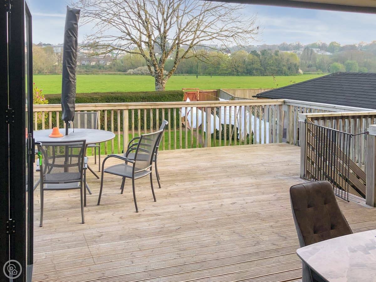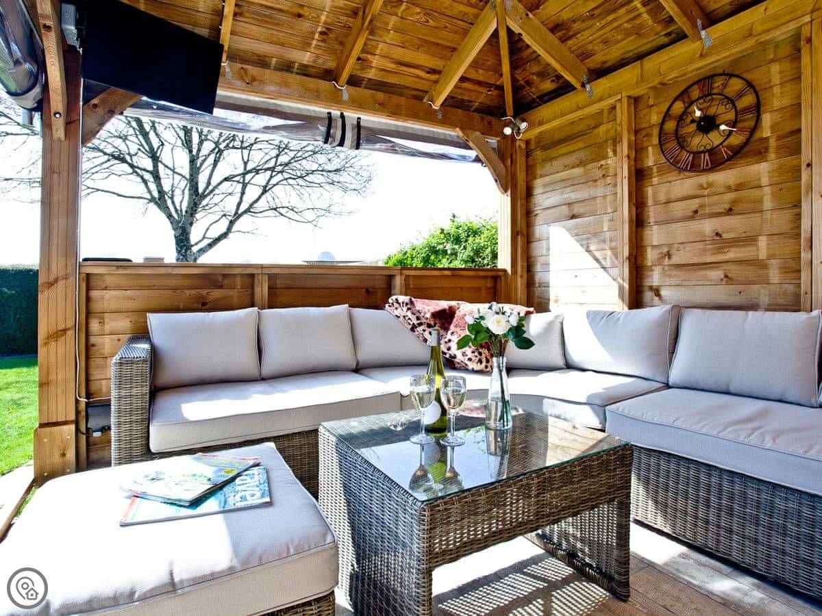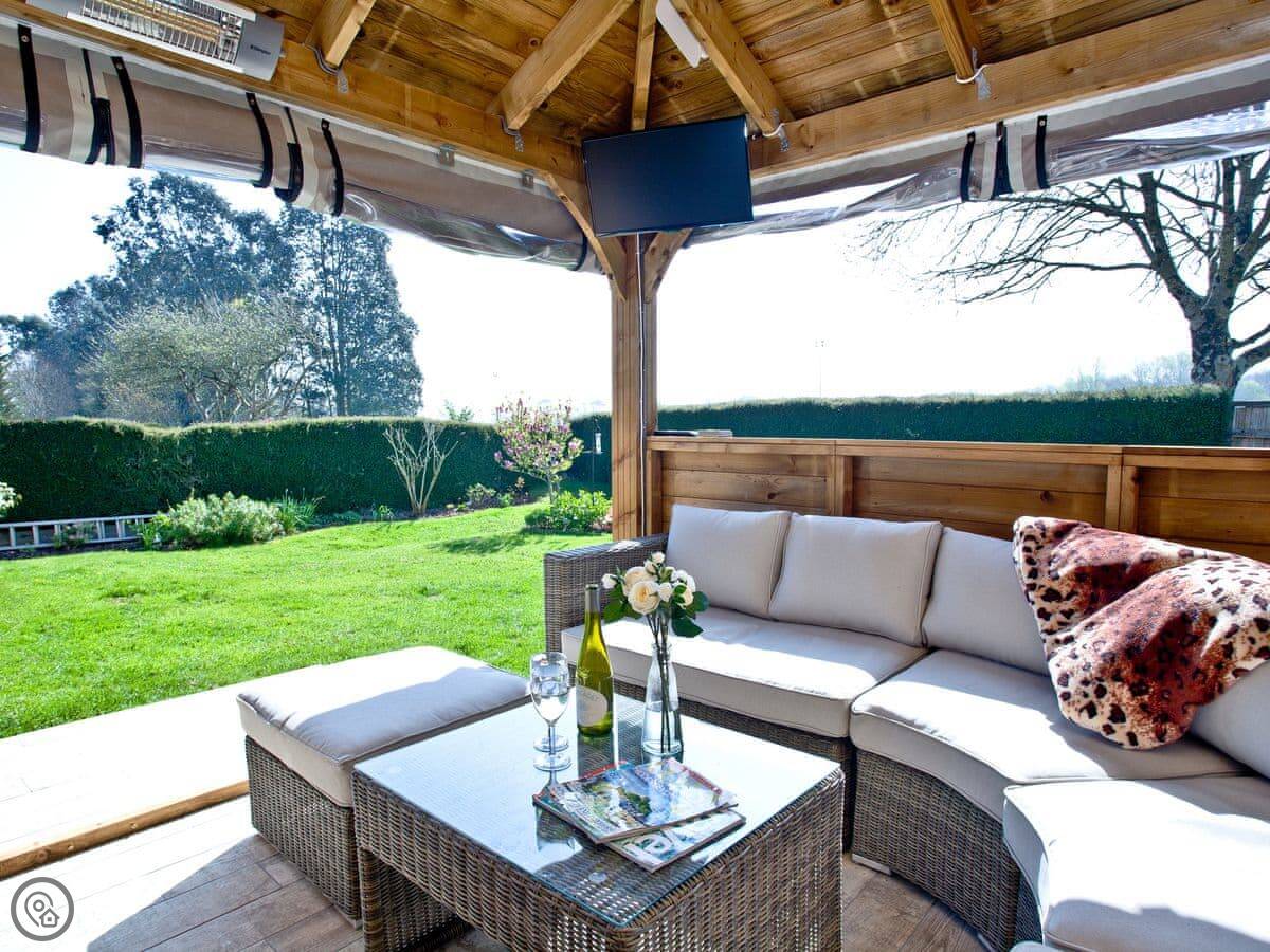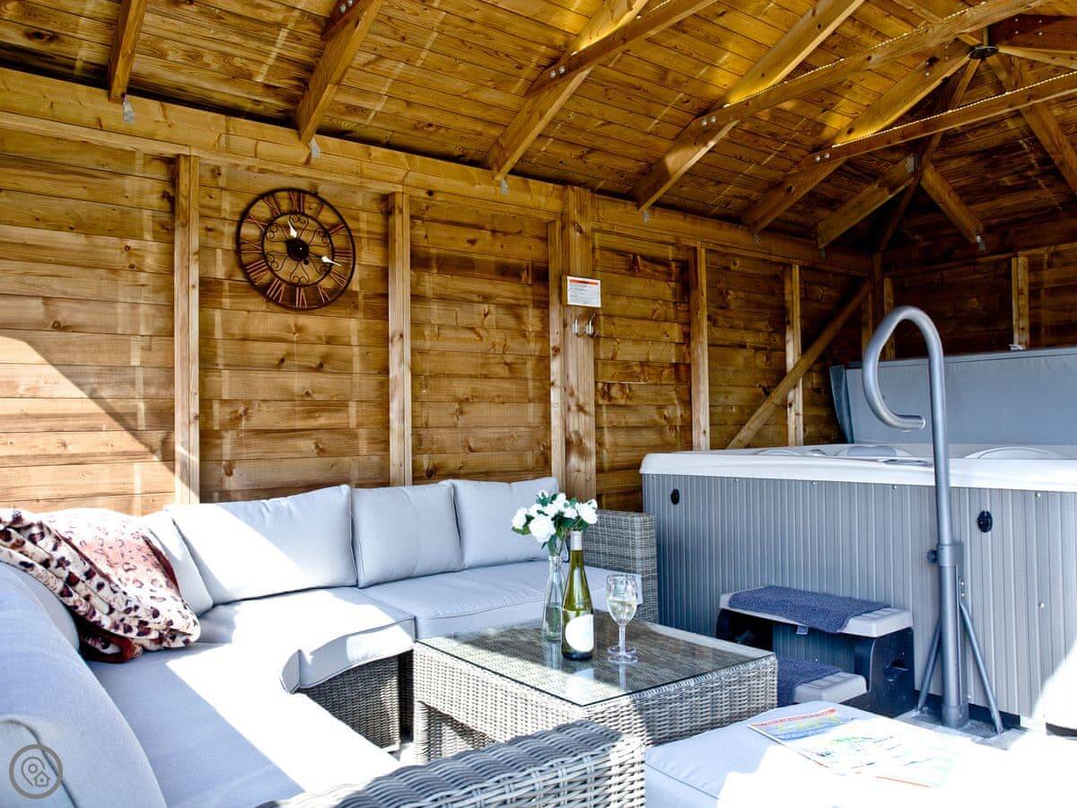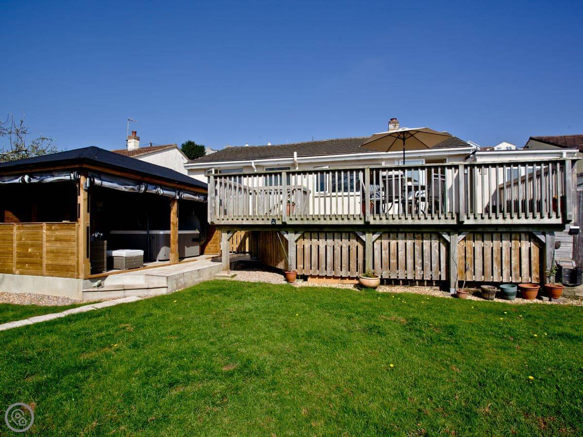 The garden is a proper feature. It's got a deck with a table and chairs, and a covered hot tub that's private to you. You're allowed up to two dogs.