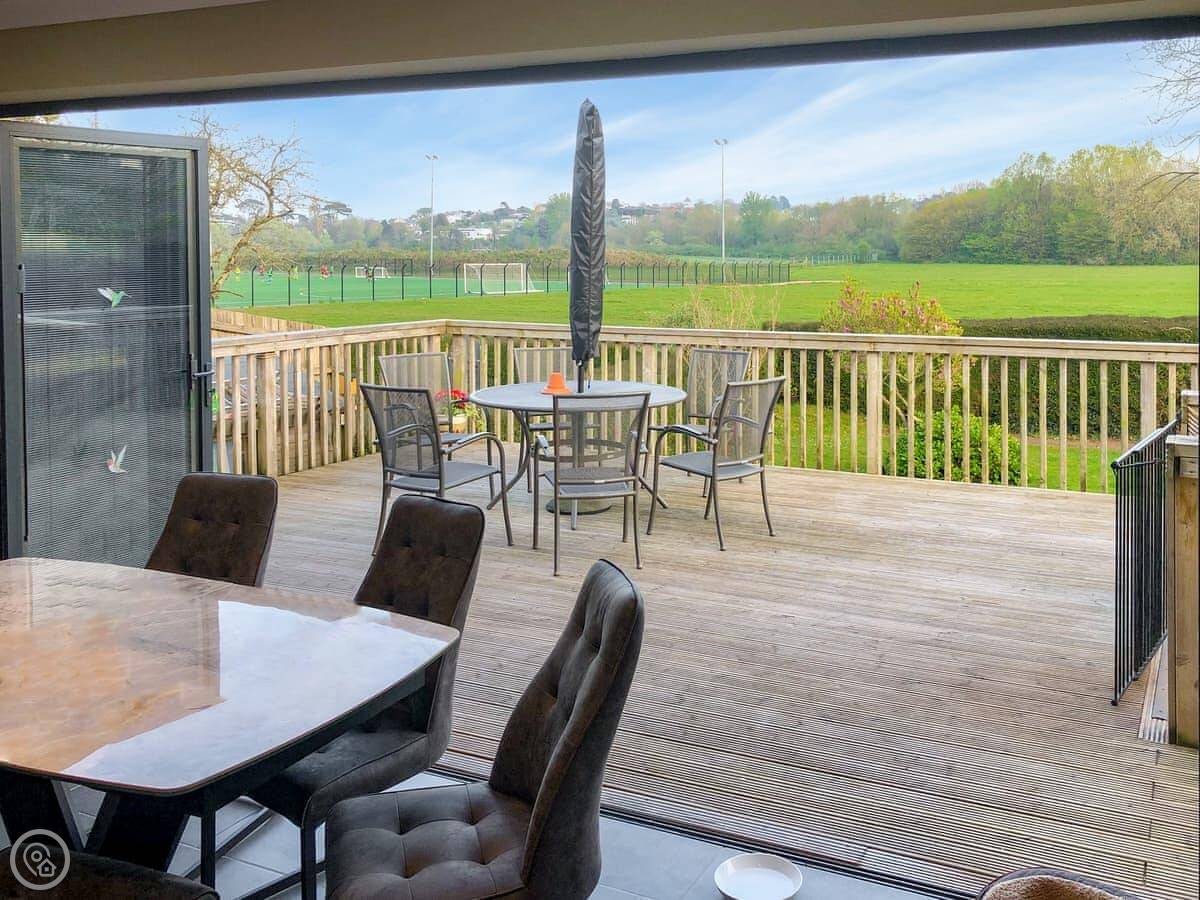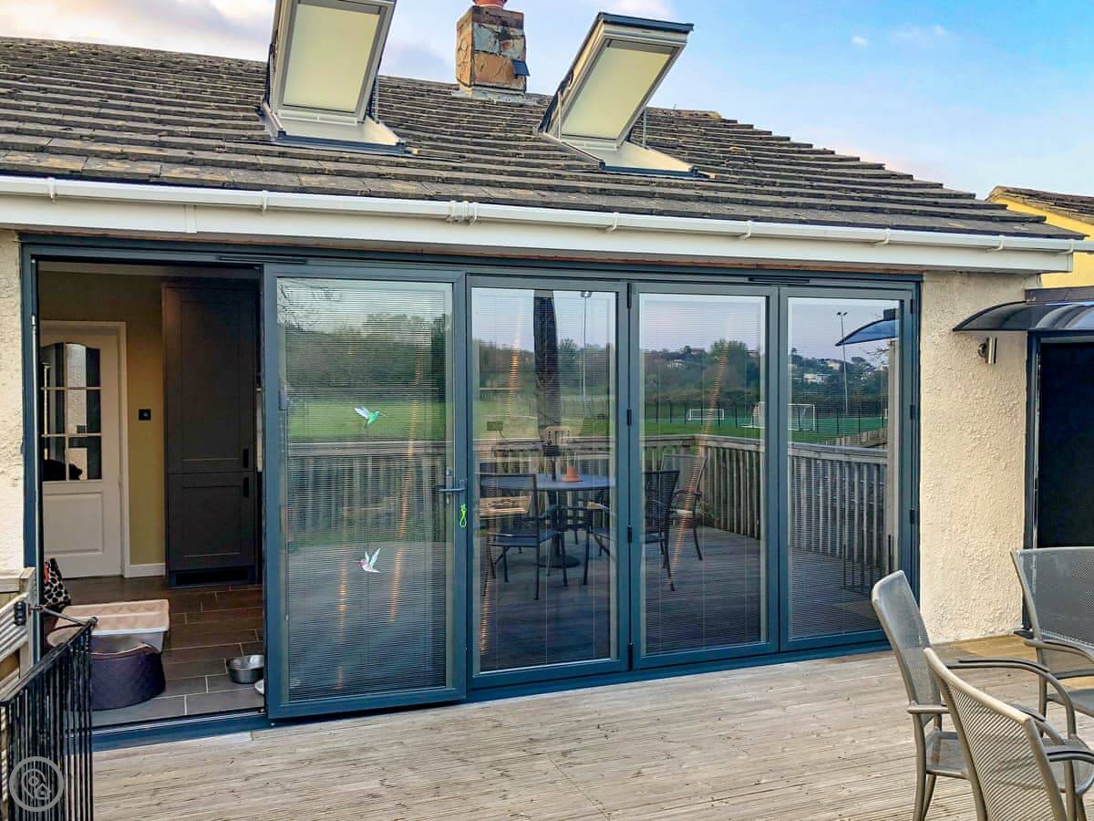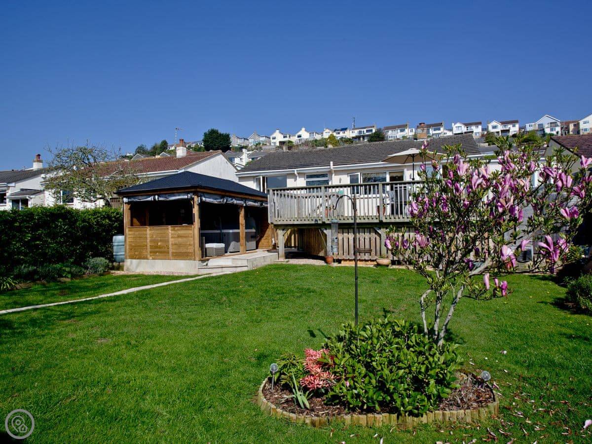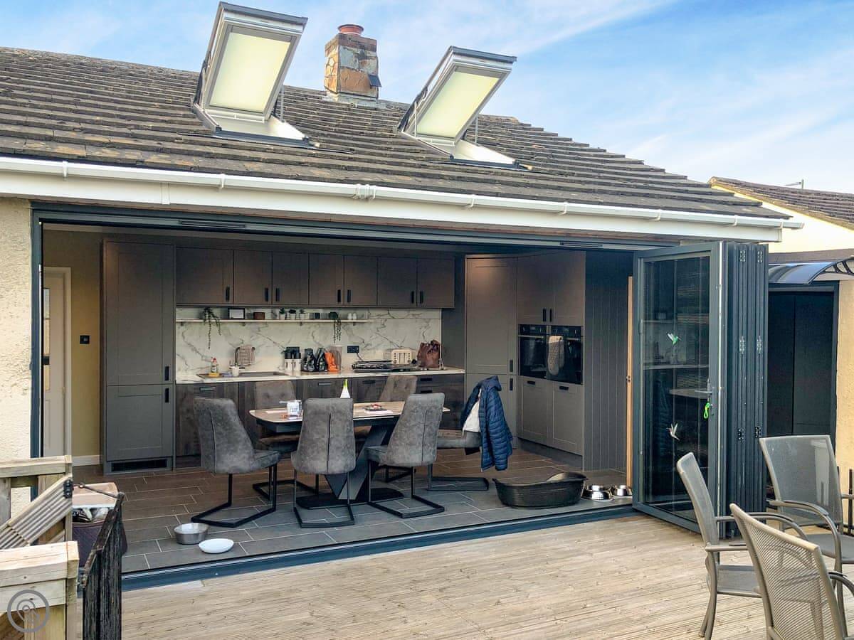 The garden is a proper feature. It's got a deck with a table and chairs, and a covered hot tub that's private to you. You're allowed up to two dogs.