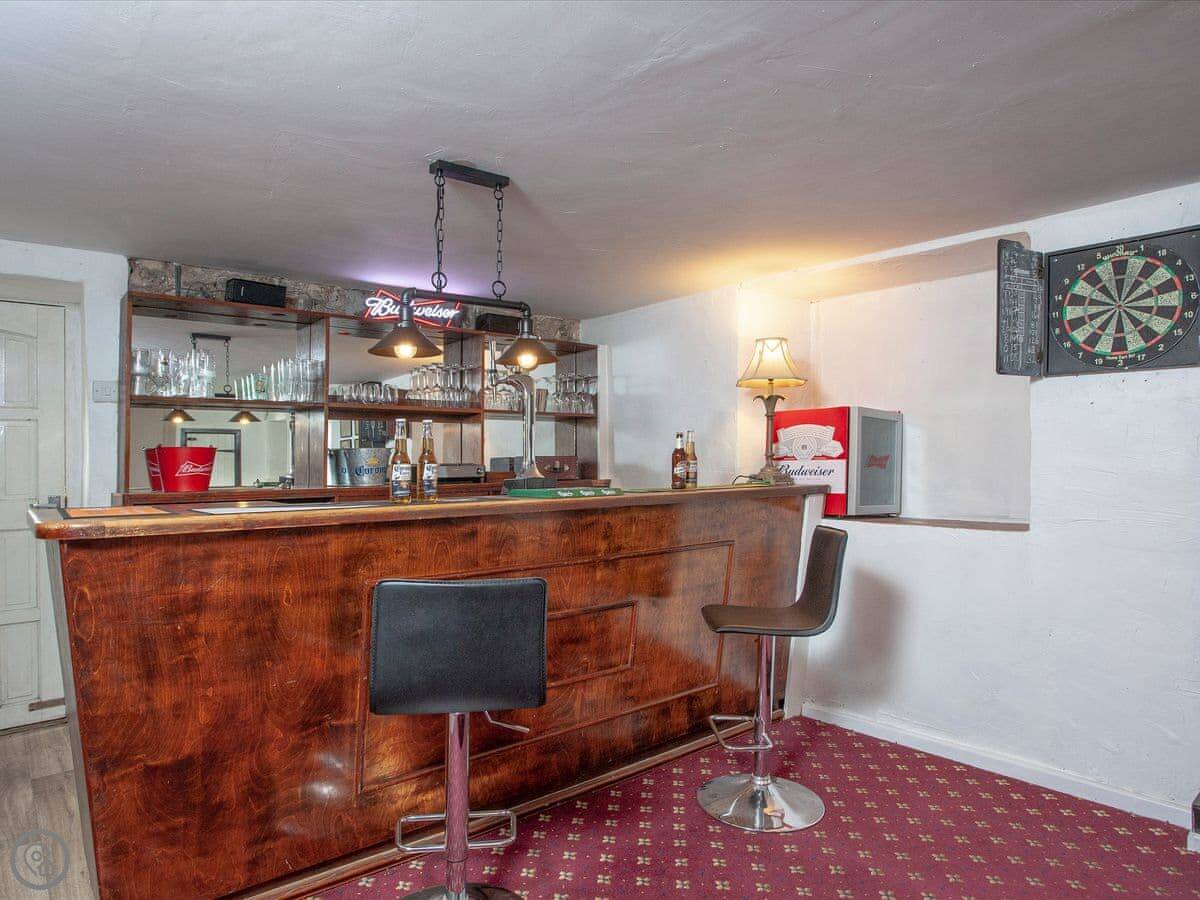 Downstairs, there's a separate games room. It's got a pool table, a dartboard, and one of those old fruit machine games.