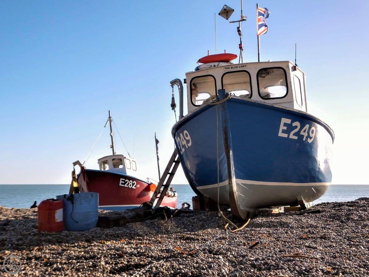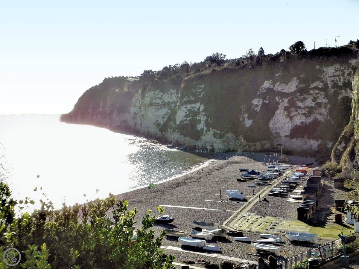 The beach is very close, about a hundred metres. It's a pebble beach with chalk cliffs. At low tide you can look in the rock pools. You'll see the fishing boats. There are cafés on the beach for crab sandwiches and cream teas.