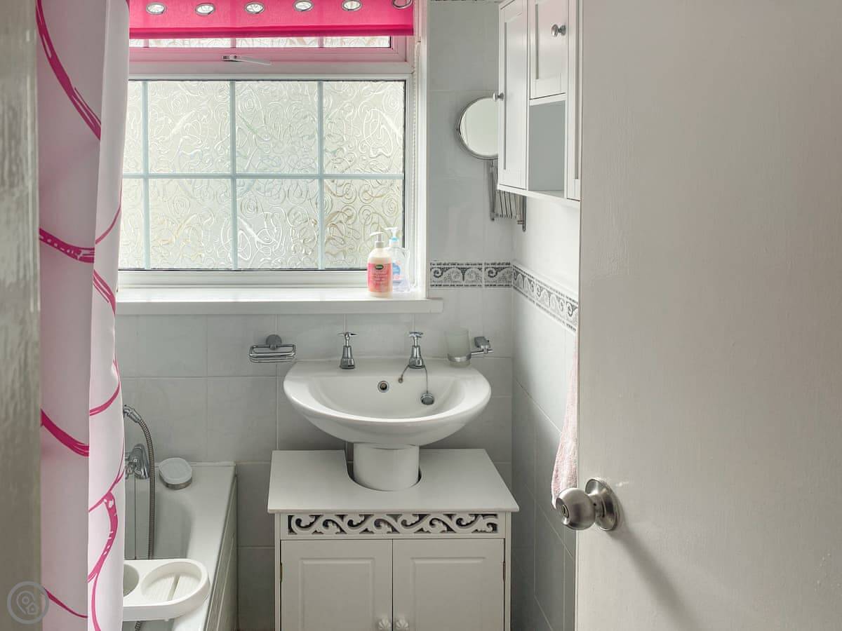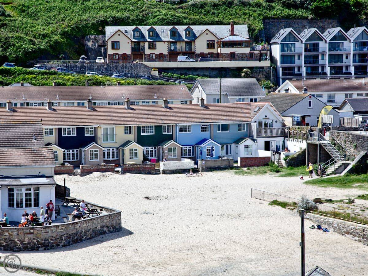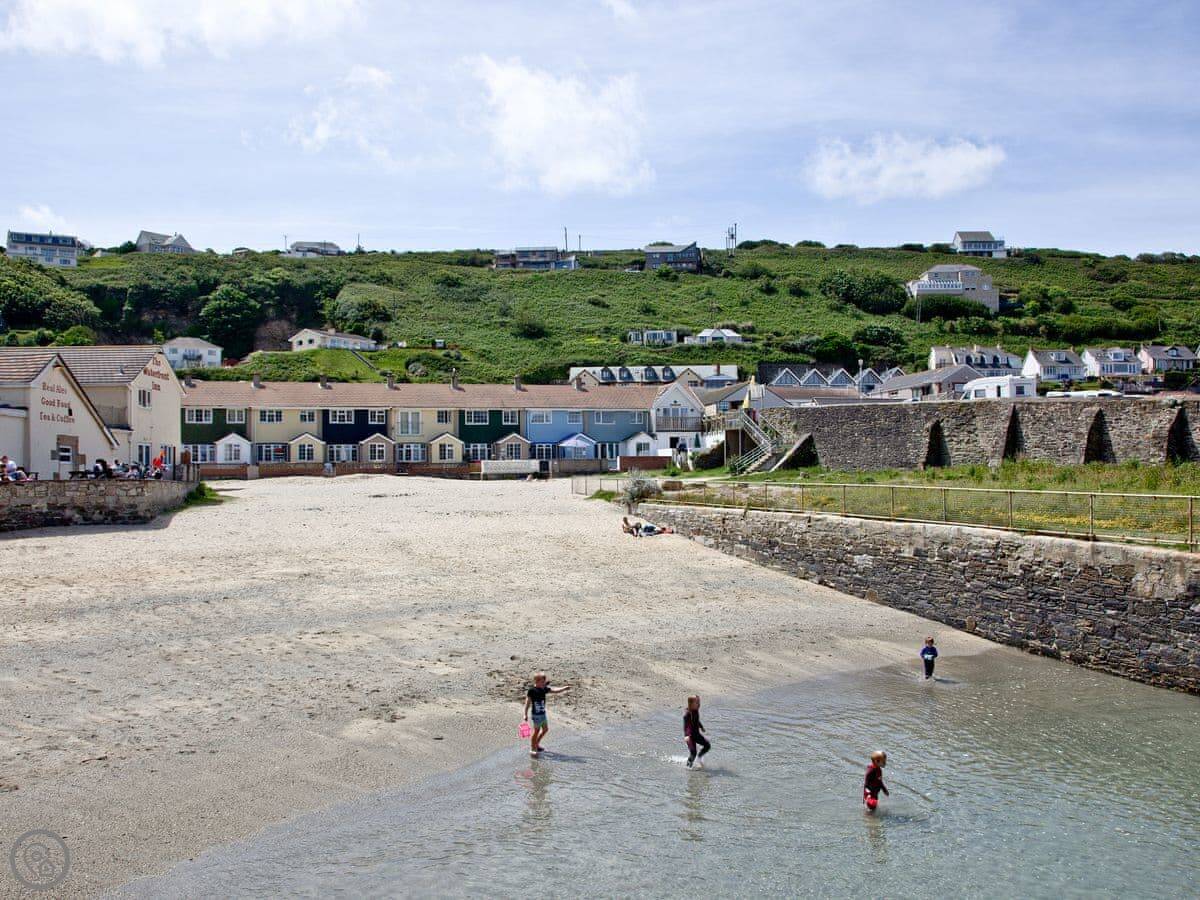The village is small. There's a shop, a couple of pubs that do food, and some cafes. The beach itself is sandy and good for swimming or surfing. There's a stream that runs across it, so you might get wet feet at certain times of the tide.