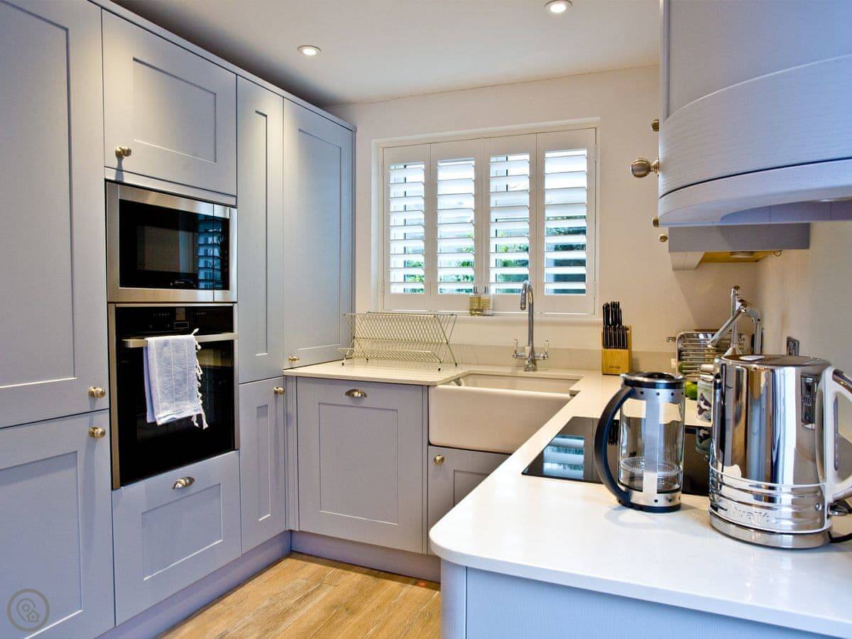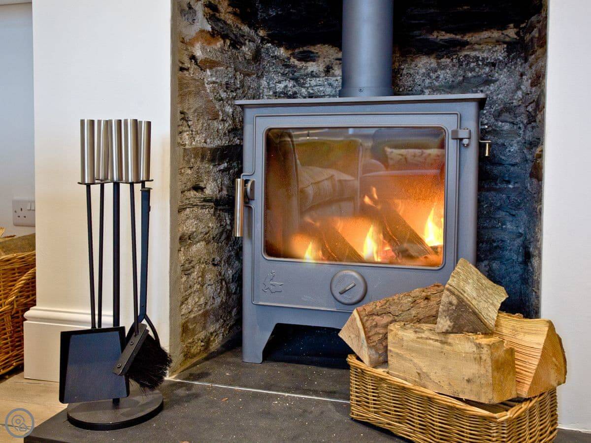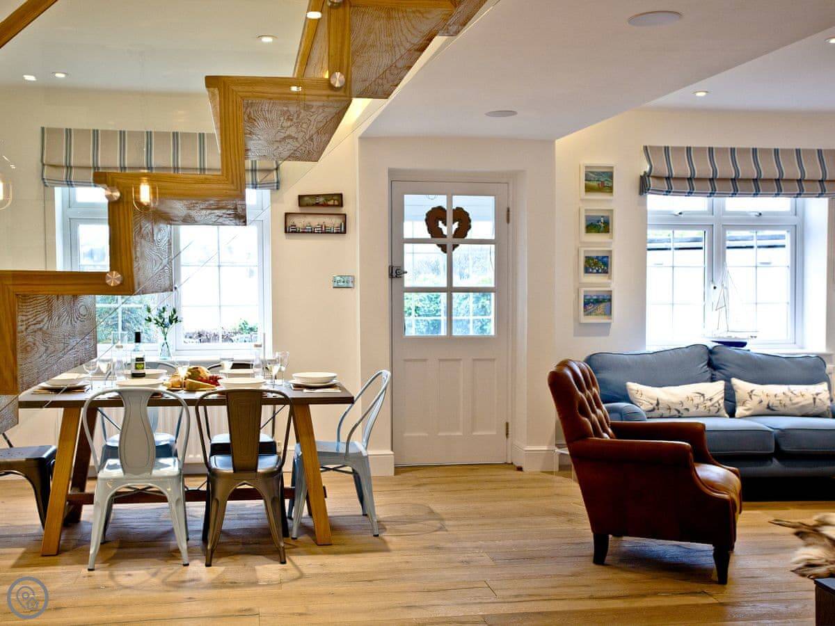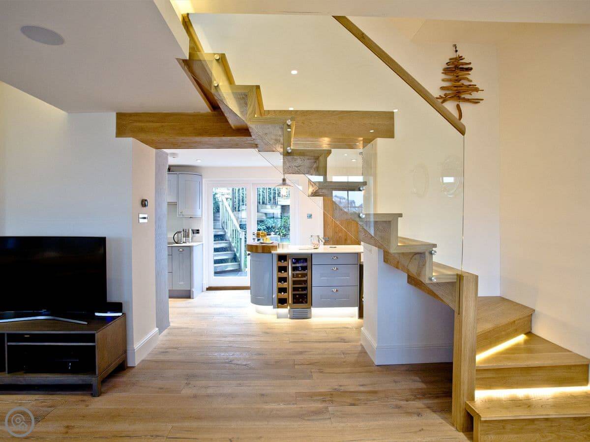 Inside, it's open plan downstairs. There's a wood burner for winter. The kitchen is well equipped with a dishwasher. The stairs are a timber and glass design, they're quite open so you might want to keep an eye on small children on them. Upstairs, the main and double bedrooms look out over the water. The twin looks over the garden.