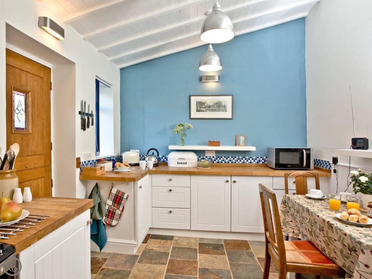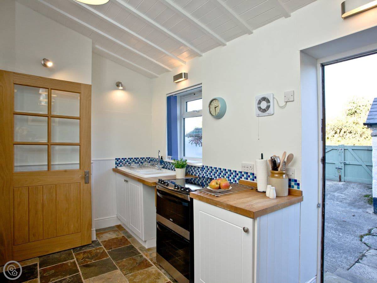 Downstairs there's a living room with a wood burner. It works well and makes the room cosy. The kitchen is fine for cooking meals. There's a washing machine.