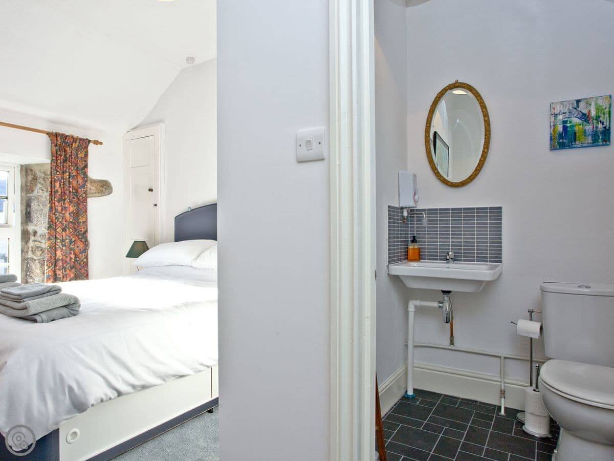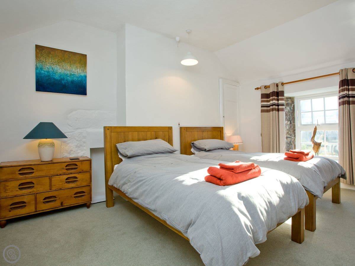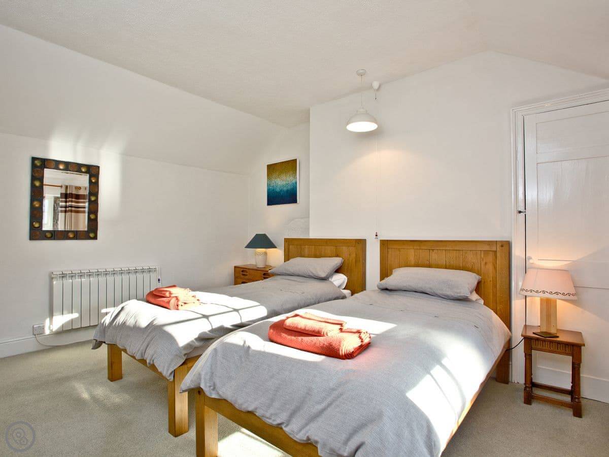 It sleeps four people. Two bedrooms upstairs, one double and one twin. Both have a view out to sea. There's one bathroom, which is an en-suite toilet off the double room. The main shower is downstairs next to the kitchen.