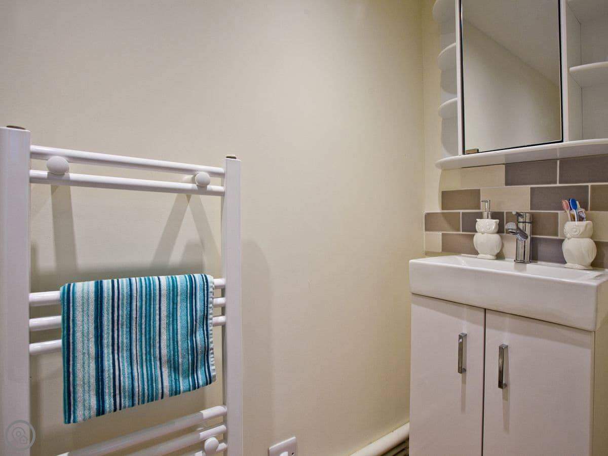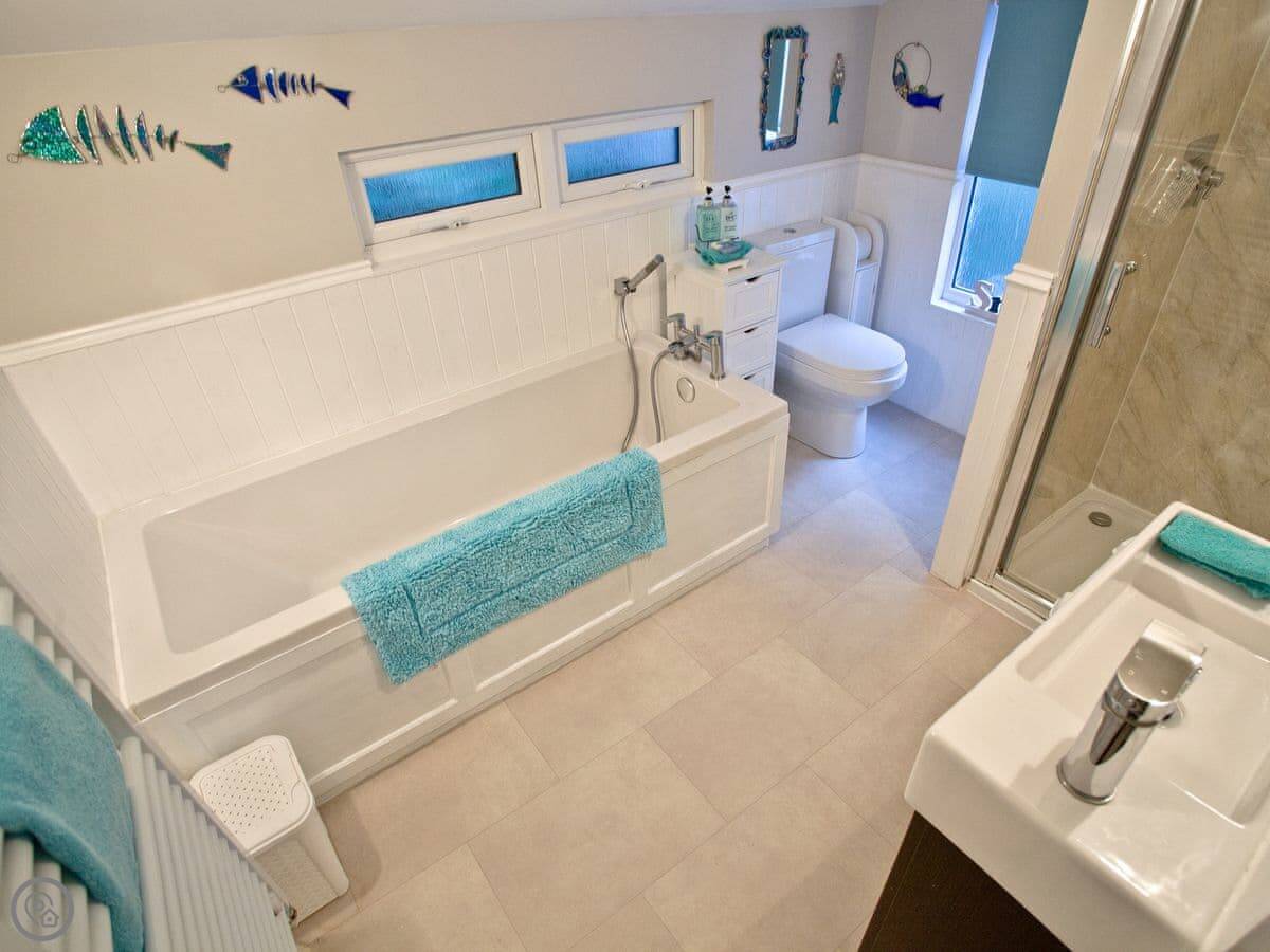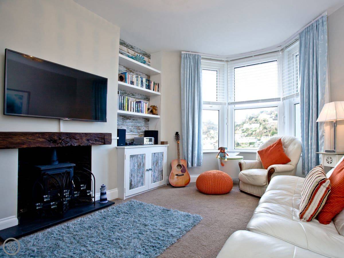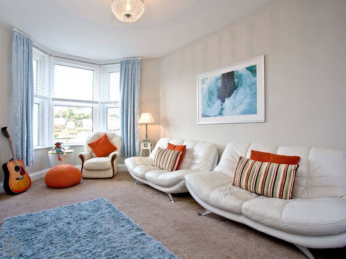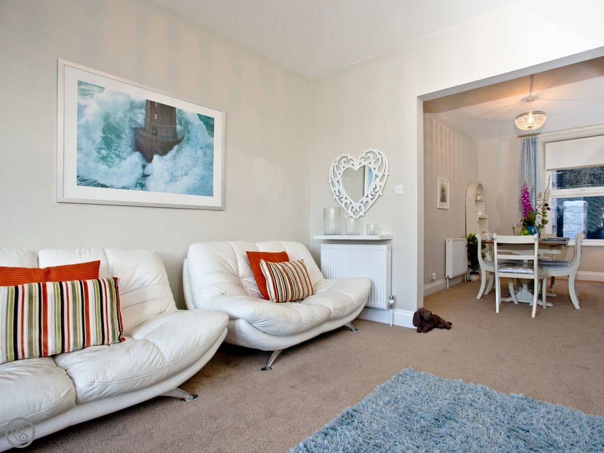 Kerensa is a house in Looe. It's split-level, so the living room is downstairs and the bedrooms are up a flight of stairs. The stairs are fine, just something to be aware of.