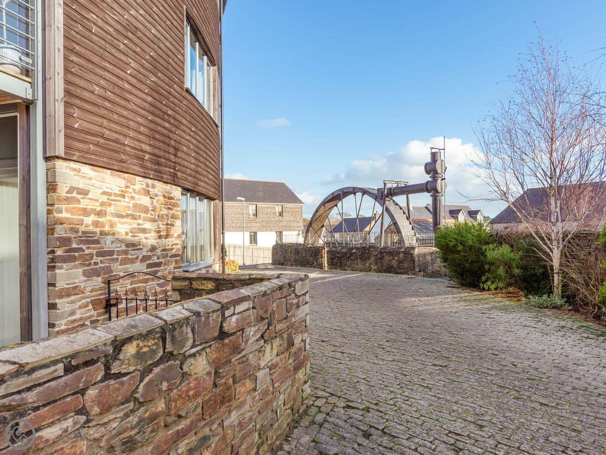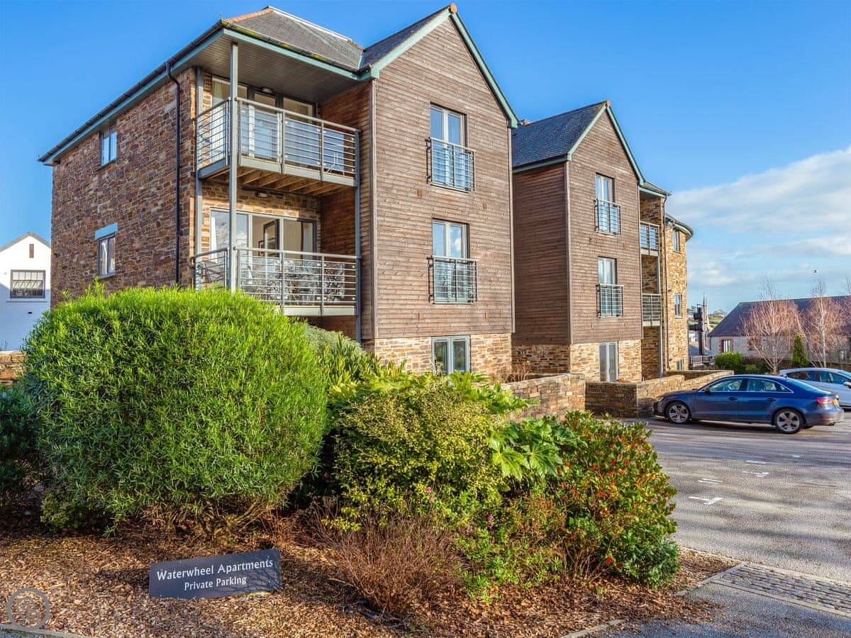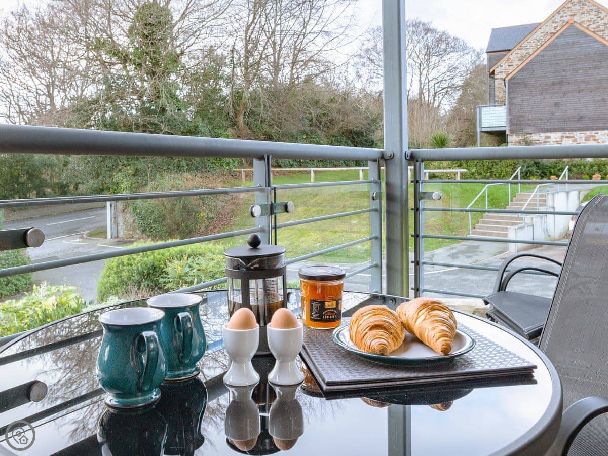 3 Waterwheel Apartment is in Charlestown. It's one of a group of modern apartments, not an old cottage. You get a private balcony with a table and four chairs, which is nice when the sun's out.