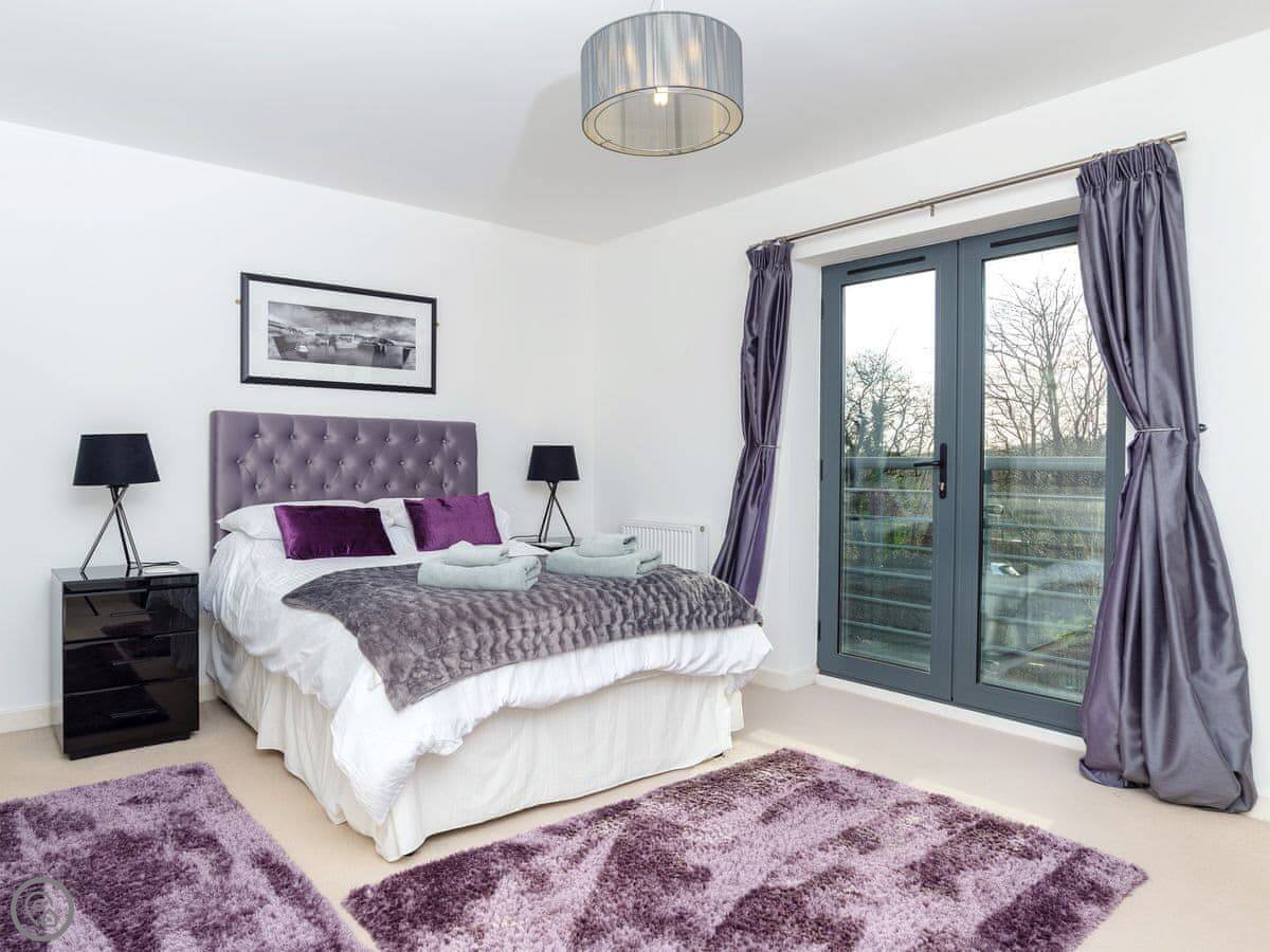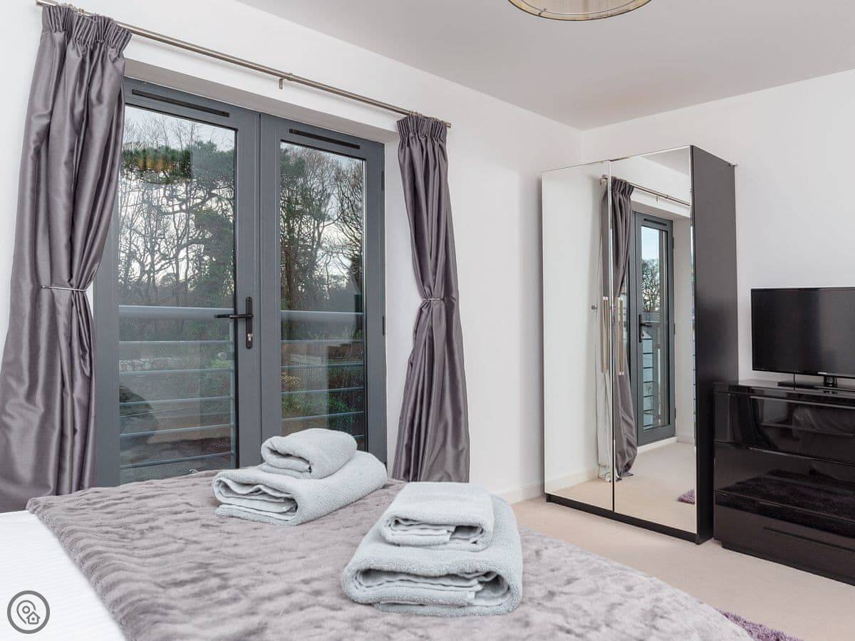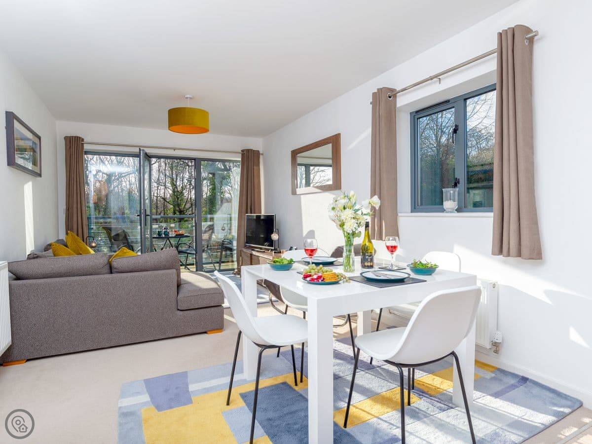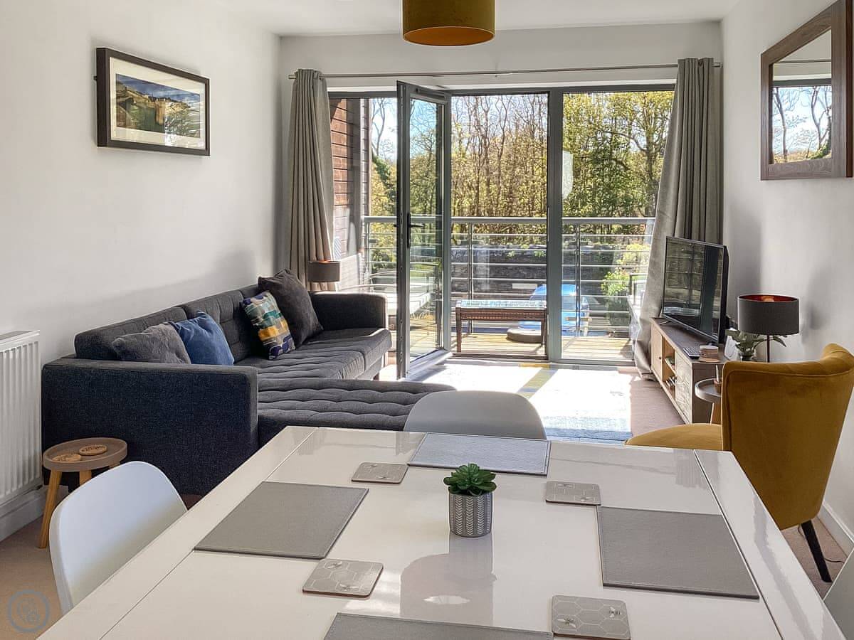 3 Waterwheel Apartment is in Charlestown. It's one of a group of modern apartments, not an old cottage. You get a private balcony with a table and four chairs, which is nice when the sun's out.
