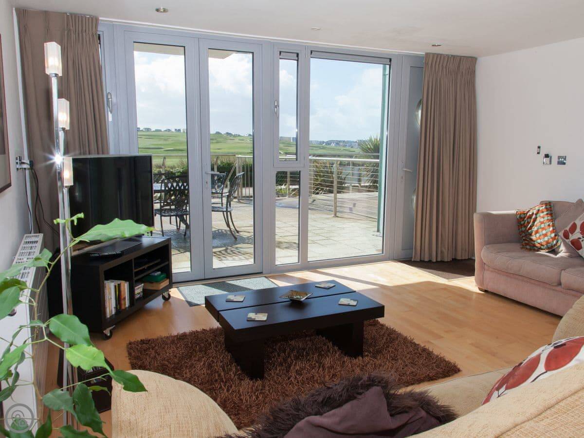 The main thing is the view. You've got a big terrace off the living area and a balcony off the main bedroom. They look straight out over the golf course and the Atlantic. It's a modern place, quite bright and open.