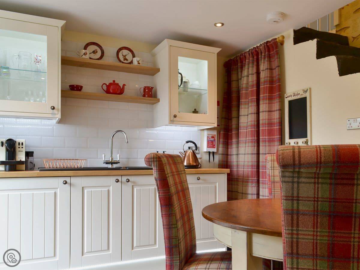 Inside, there's a wood burning stove for cooler evenings. The kitchen has a dishwasher and a washing machine. Bedding is included. There's a cot and a highchair if you need them. Parking is off the road, on site.