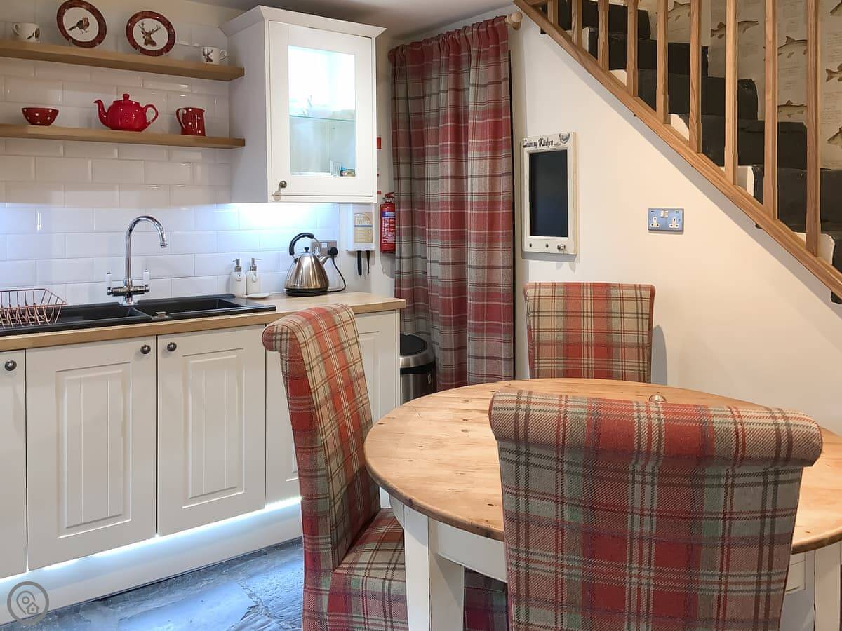 It sleeps four in two bedrooms. There's one bathroom. It's got a 4 Star rating, which means it's comfortable and well looked after. The stairs inside are quite steep. They're typical for an old cottage.