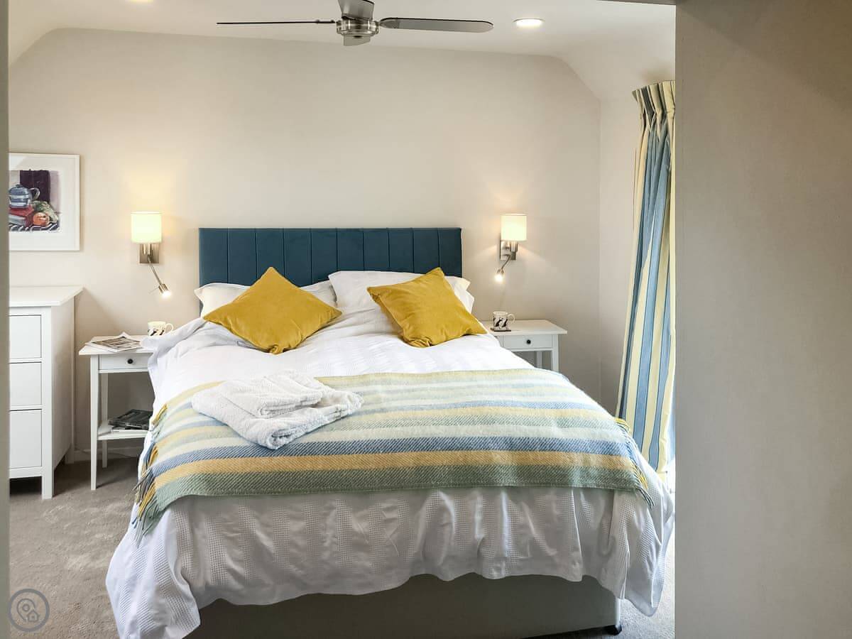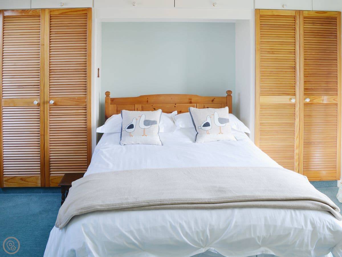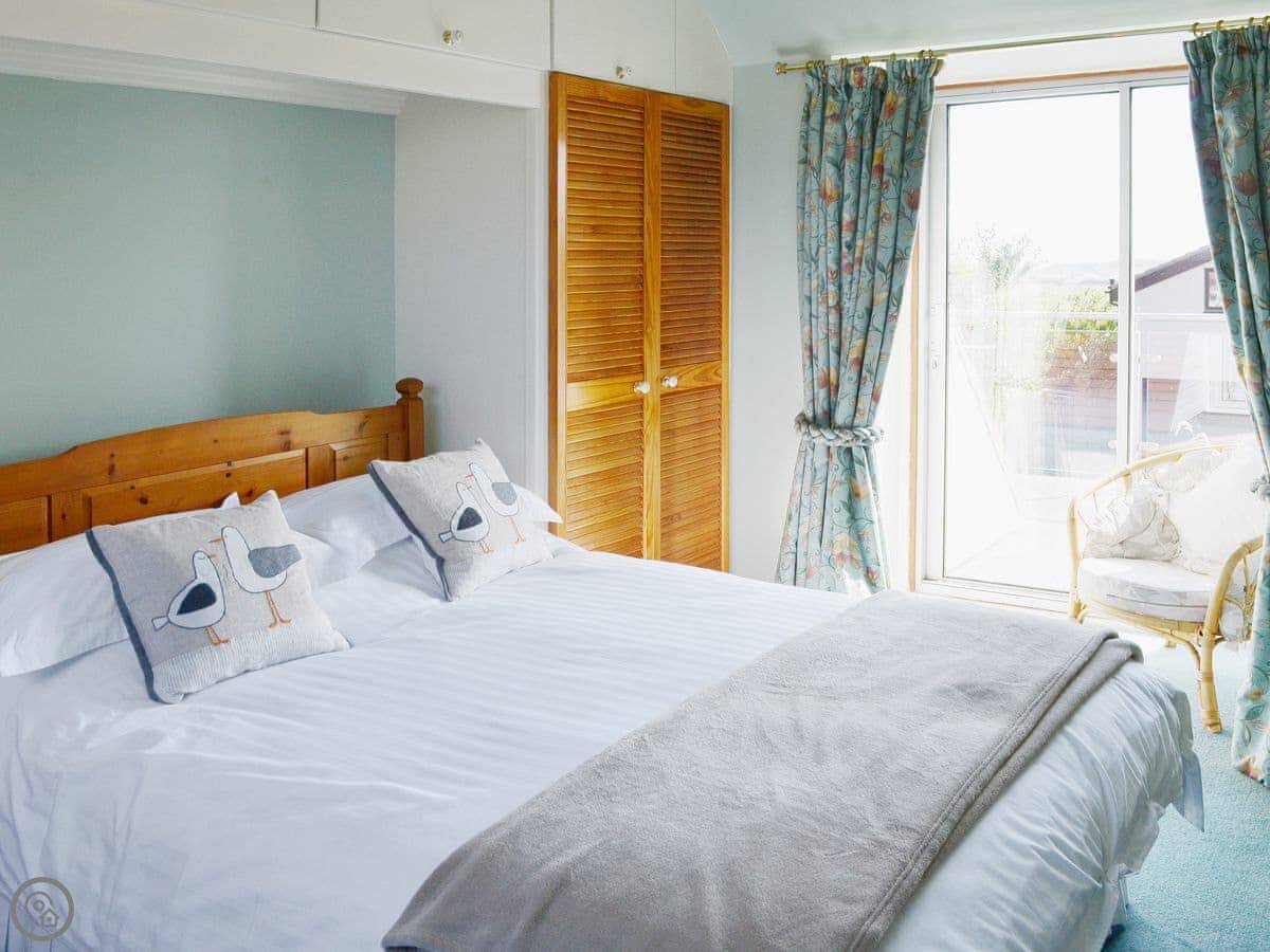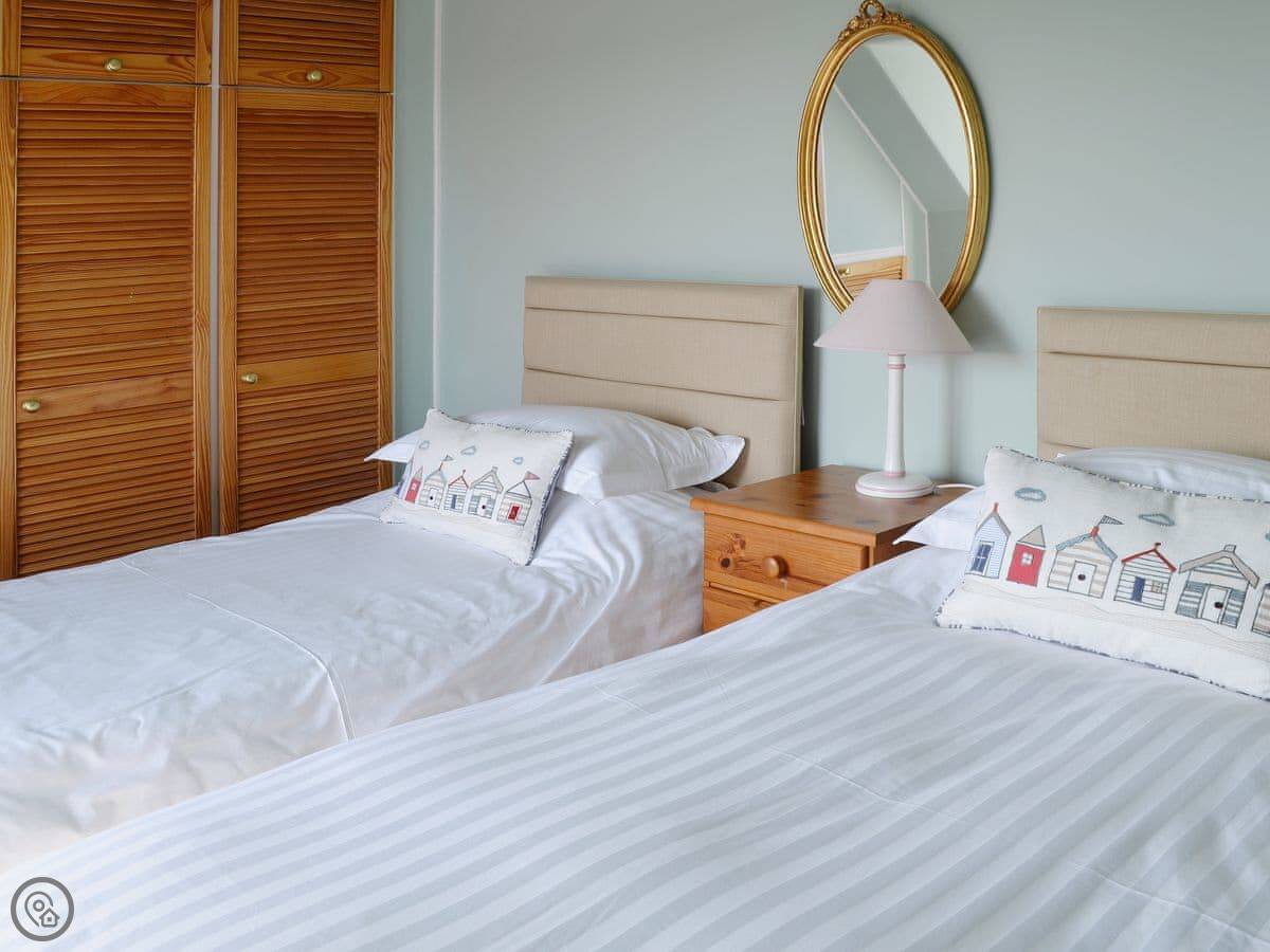 It sleeps six people in three double bedrooms. There are two bathrooms, one is an ensuite off the main bedroom. That main bedroom has a door out to a small, private roof terrace. You can see a bit of the sea from there.