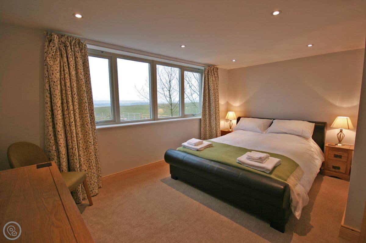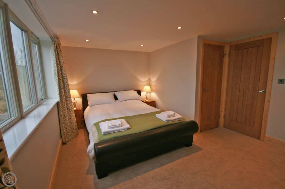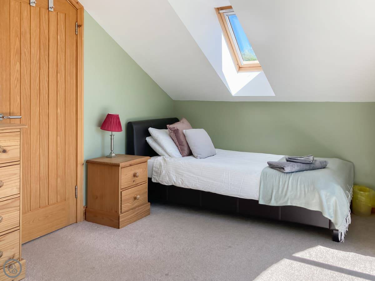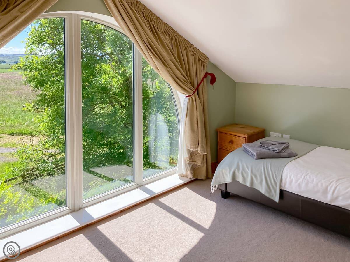Up a floor is the main bedroom, a king size, and the family bathroom. Then up another flight to the top floor, which has two more bedrooms. One is a double, the other has twins. Those rooms have big arched windows, so they're bright and the views are good.