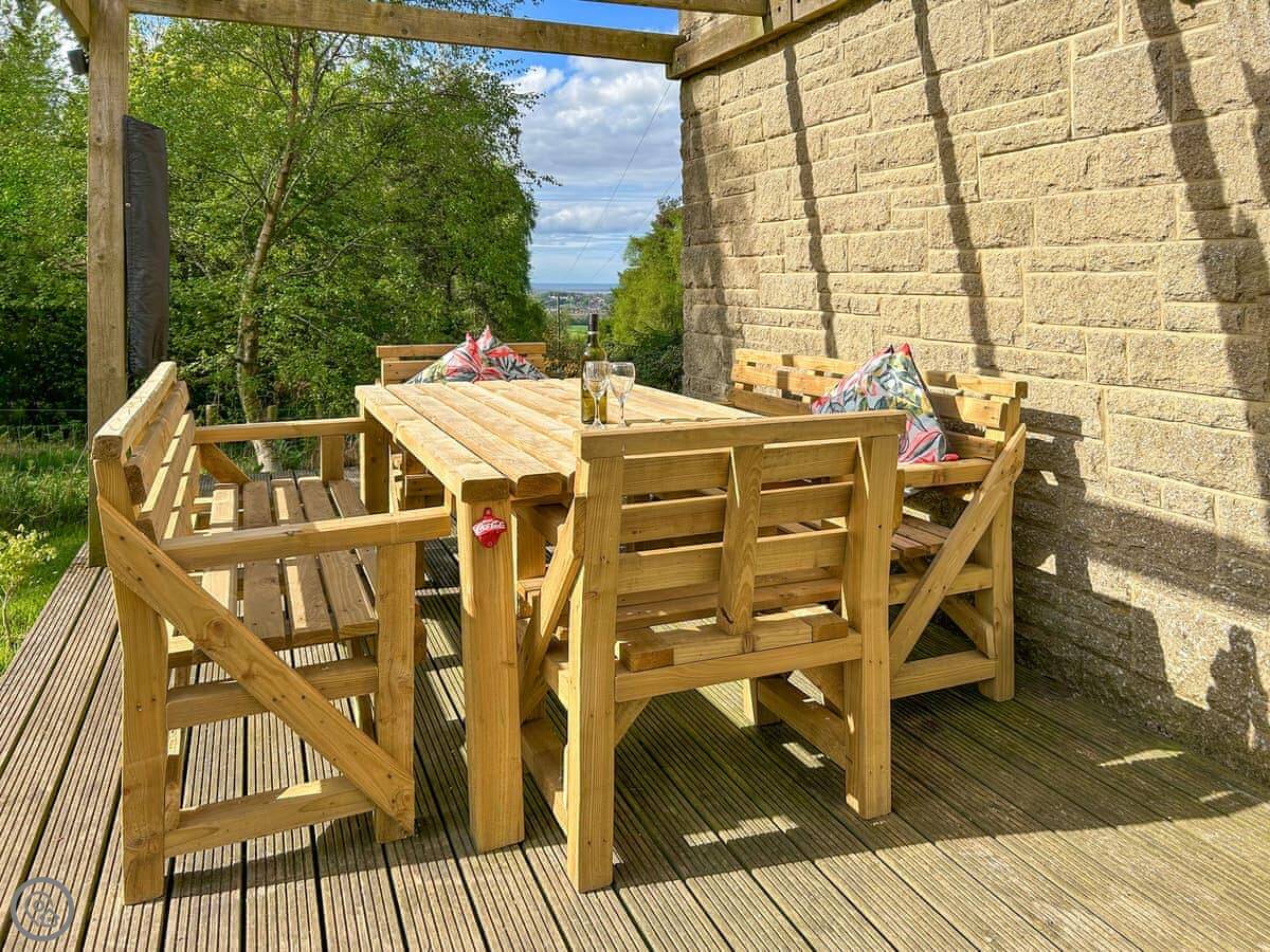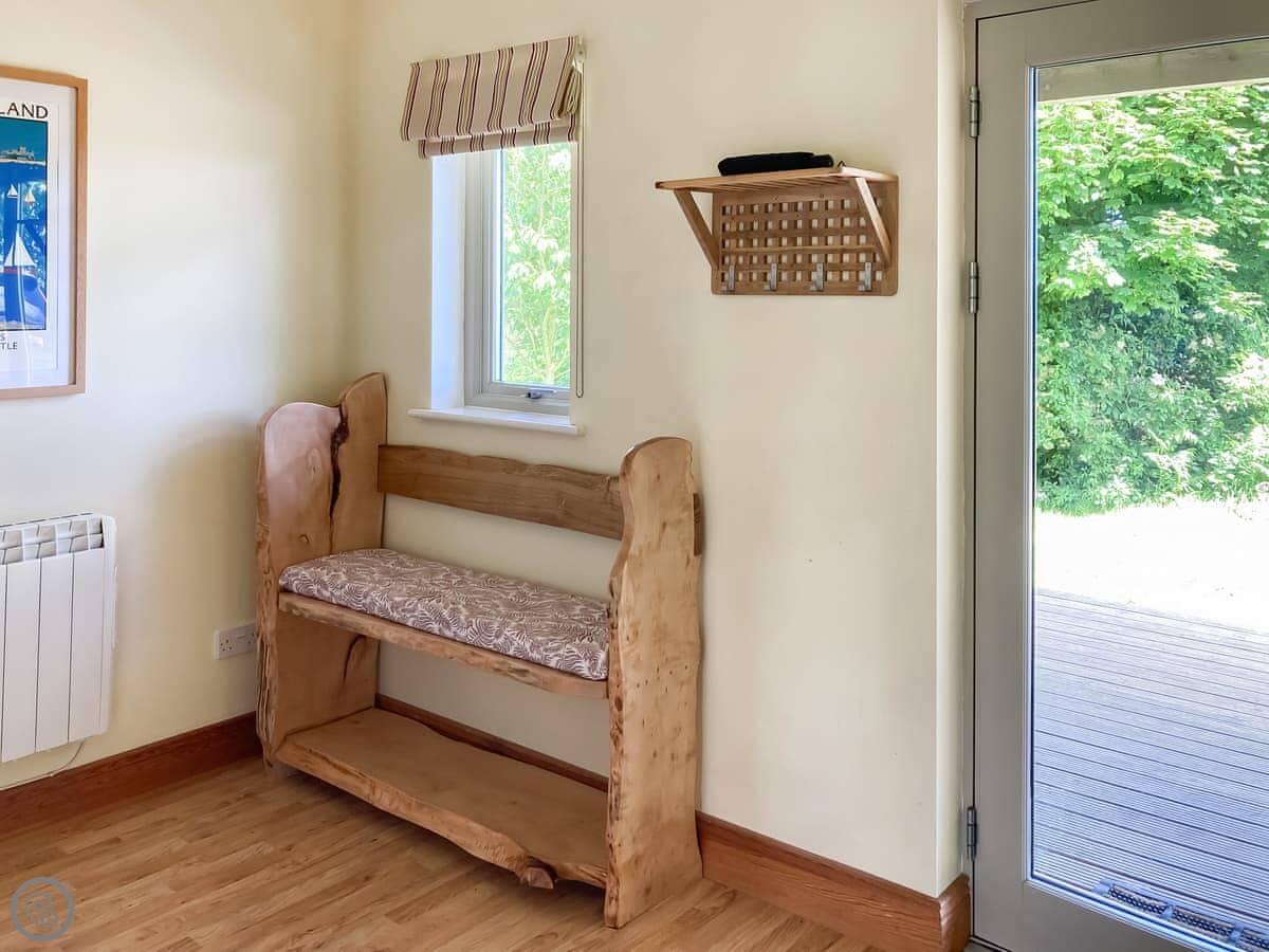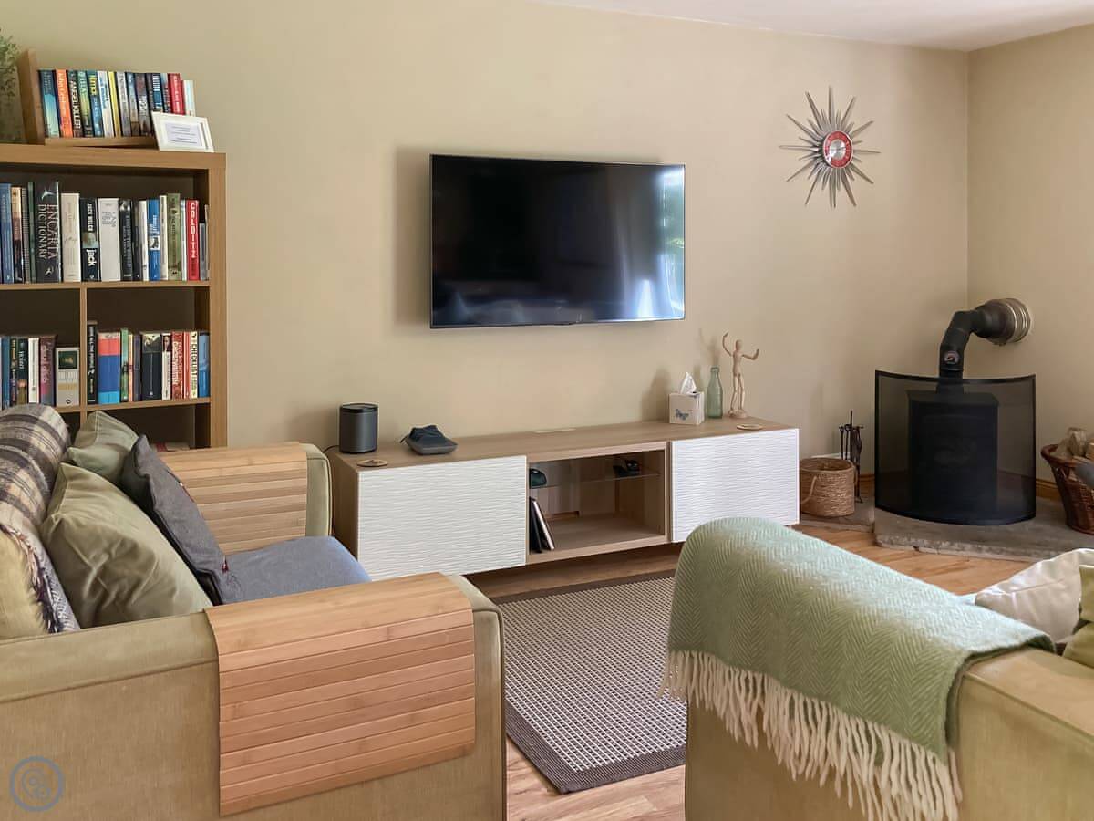 It’s on three floors. There’s a shower room and open-plan living space with a kitchen on the ground floor. The wood burner is new, but it's a proper one. Doors go straight out to the deck and the trees. There’s a hammock you can put up between two big trees at the front.